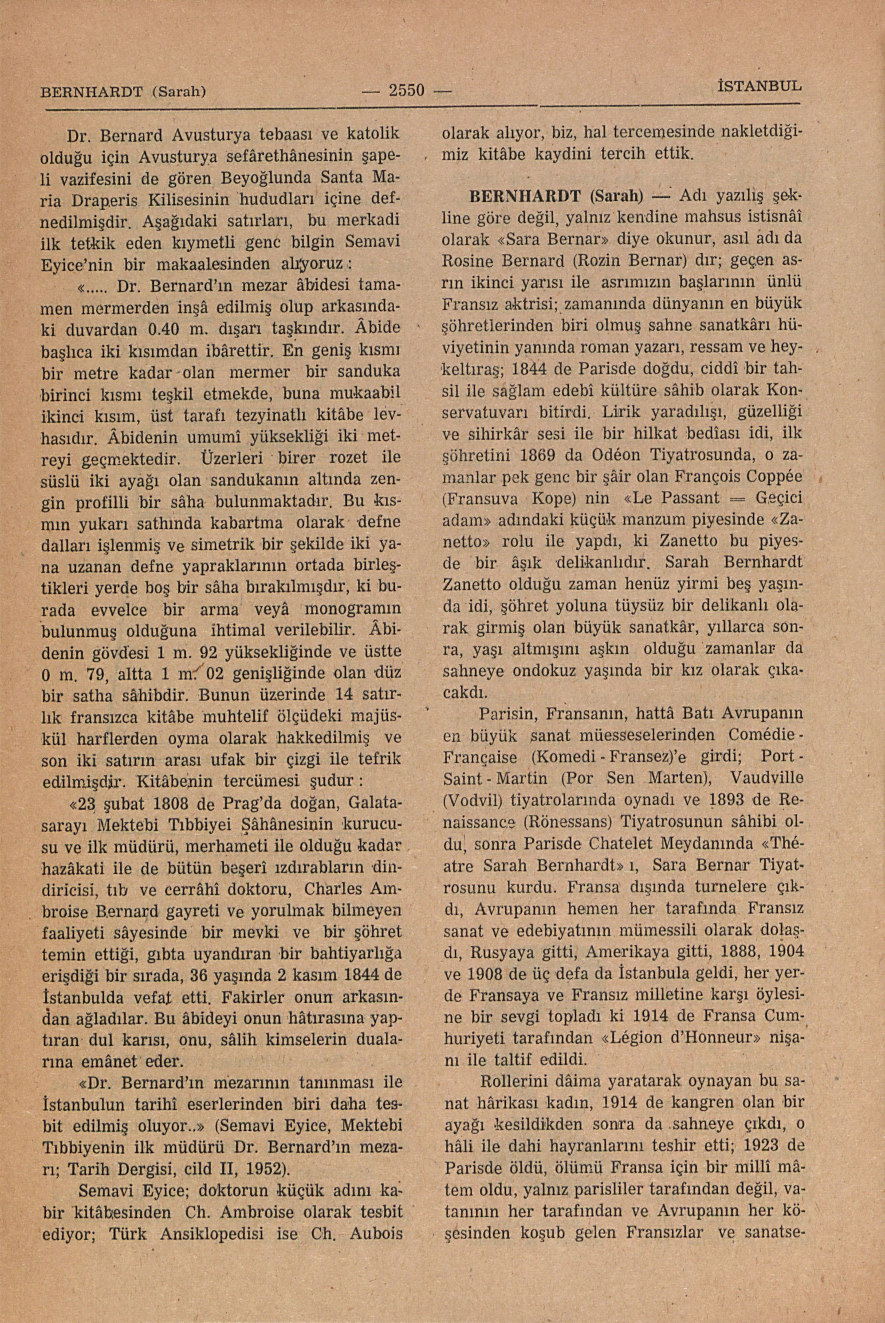 Viyanalı değerli bir hekim, Türkiyede batılı kafası ile tıb öğretimi yolunda kısa zamanda çok büyük hizmetde bulunmuş bir ilim adamı; “Muallim Bernard” diye meşhurdur; aşağıdaki hal tercemesini Türk Ansiklopedisinden alıyoruz: 1806 da doğdu; 14 mayıs 1839 da İkinci Mahmudun bir nutku ile açılan Galatasarayındaki Mektebi Tıbbıyei Şâhâneyi muallimi evvel (baş öğretmen, dekan - profesör) olarak bu inkilâbcı pâdişah tarafından Viyana elçiliğimiz vasıtası ile İstanbula getirildi; ki Sultan Mahmud O meşhur açılış nutkunda bu genc hekimden bilhassa bahbetmişdir: “Doktor Bernard’ı sizin için mahsus celbettim, Arvupanın birinci derecesindeki hekimlerindendir; Bu adamdan ve sâir hocalarınızdan tabâbet ilmini tahsile çalışan ve tedrîcen türkçeye alıp lisanımız üzere kedâvülüne çalışın” demişdir. Galatasaray Tıbbiyesinde baş öğretmenlikle beraber serriyâtı dahiliye, emrâzı dahiliye ve seririyâtı hariciye muallimliği yapan ve pâdişahın teveccühüne dayanarak çalışmaya başlayan Prof. Dr. Bernard, bu mektebi batı memleketlerindeki tıb fakülteleri programlarına göre düzenlemiştir; (tababetin bu ilmin sâhiblerine servet temin eden bir meslek olmayıp, hekimin, muzdarib insanların yardımına koşan fedâkâr kimselere olduğunu telkin ile tabib olacak gençlere meslek terbiyesi ve ahlâk üzerindeki koruyucu baskısına inanmış), kendisi hıristiyan olduğu halde müslüman talebelerinin muntazaman camie devam etmelerine ve islâm akidesince temizlenmeleri için de hamama gitmelerine bizzat nezâret etmiş, hizmet ettiği beş yıl içinde gece ve gündüz mektebden ayrılmamıştır. İkinci Sultan Mahmud Galatasaray Tıbbiyesinin açılışından az sonra, yine o 1839 yılında vefat etmiş, yerine pek genc yaşda bulunan oğlu Abdülmecid pâdişah olmuş; Galatasaray Tıbbiyesinin imtihanlarında bulunan yeni hükümdar, talebelerin imtihandaki başarılarından ötürü Muallim Bernard pek çok iltifatda bulunmuş, genc padişahın da itimadını kazana profesör 1841 de anatomi dersinin ölüler üzerinde (kadavra üzerinde) gösterilmesi için bir irâdei seniye almaya muvaffak olmuştur; 1842 de ameliyat hastahânesi denilen hariciye kliniği kurmuş, mektebde bir de nebâtat bağçesi yaptırmışdır. Tıbbıyedeki vazifesinden başka İstanbul Avusturya Hastahânesinde de hekimlik yapan Muallim Bernard 2 kasım 1844 de henüz 38 yaşında iken ölmüş ve ölümü İstanbulda pek geniş ve derin teessür uyandırmışdır. Derslerini fransızca okuturdu; İstanbulda fransızca olarak basılmış dört eseri vardır: Les Bains de Brousse (1842), Eléments de Botanique à I’uzage des élèves de I’école de medecine de Galatasaraï (1842), Précis de percussion et d’auscultation (1843), Pharmacopée Militaire Ottamane (1844). Bunlardan birincisi 1844 de Abdülmecidin Bursaya seyahati münasebeti ile “Kaplıca Risâlesi” adı ile türkzeye terceme edilmişdir (Türk Ansiklopedisi, cild VI). Dr. Bernard Avusturya tebaası ve katolik olduğu için Avusturya sefârethânesinin şapeli vazifesini de gören Beyoğlunda Santa Maria Daperis Kilisesinin hududları içine defnedilmişdir. Aşağıdaki satırları, bu merkadi ilk tetkik eden kıymetli genc bilgin Semavi Eyice’nin bir makaalesinden alıyoruz: “.... Dr. Bernard’ın mezar âbidisi tamamen mermerden inşâ edilmiş olup arkasındaki duvardan 0.40 m. dışarı taşkındır. Âbide başlıca iki kısımdan ibârettir. En geniş kısımı bir metre kadar olan mermer bir sanduka birinci kısmı teşkil etmekde, buna mukaabil ikinci kısım, üst tarafı tezyinatlı kitâbe levhasıdır. Âbidenin umumi yüksekliği iki metreyi geçmektedir.Üzerleri birer rozet ile süslü iki ayağı olan sandukanın altında zengin profili bir sâha bulunmaktadır. Bu kısmın yukarı sathında kabartma olarak defne dalları işlenmiş ve simetrik bir şekilde iki yana uzanan defne yapraklarının ortada birleştikleri yerde boş bir sâha bırakılmışdır, ki burada evvelce bir arma veyâ monogramın bulunmuş olduğunu ihtimal verilebilir. Âbidenin gövdesi 1 m. 92 yüksekliğinde ve üstte 0 m. 79, altta 1 m. 02 genişliğinde olan düz bir satha sâhibdir. Bunun üzerinde 14 satırlık fransızca kitâbe muhtelif ölçüdeki majüskül harflerden oyma olarak hakkedilmiş ve son iki satırın arası ufak bir çizgi ile tefrik edilmişdir. Kitâbenin tercümesi şudur: “23 şubat 1808 de Prag’da doğan, Galatasarayı Mektebi Tıbbiyei Şâhânesinin kurucusu ve ilk müdürü, merhameti ile olduğu kadar hazâkati ile de bütün beşerî ızdırabların dindiricisi, tıb ve cerrâhî doktoru, Charles Ambroise Bernard gayreti ve yorulmak bilmeyen faaliyeti sâyesinde bir mevki ve bir şöhret temin ettiği, gıbta uyandıran bir bahtiyarlğa erişdiği bir sırada, 35 yaşında 2 kasım 1844 de İstanbulda vefat etti. Fakirler onun arkasından ağladılar. Bu âbideyi onun hâtırasına yaptıran dul karısı, onu, sâlih kimselerin dualarına emânet eder. “Dr. Bernard’ın mezarının tanınması ile İstanbulun tarihî eserlerinden biri daha tesbit edilmiş oluyor..” (Semavi Eyice, Mektebi Tıbbiyenin ilk müdürü Dr. Bernard’ın mezarı; Tarih Dergisi, cild II, 1952) Semavi Eyice; doktorun küçük adını kabir kitâbesinden Ch. Ambroise olarak tesbit ediyor; Türk Ansiklopedisi ise Ch. Aubois olarak alıyor, biz, hal tercemesinde nakletdiğimiz kitâbe kaydini tercih ettik. Dr. Bernard (Resim : B. Şeren) Dr. Bernard’ın merkadi (Semavi Eyicenin arşivinden)