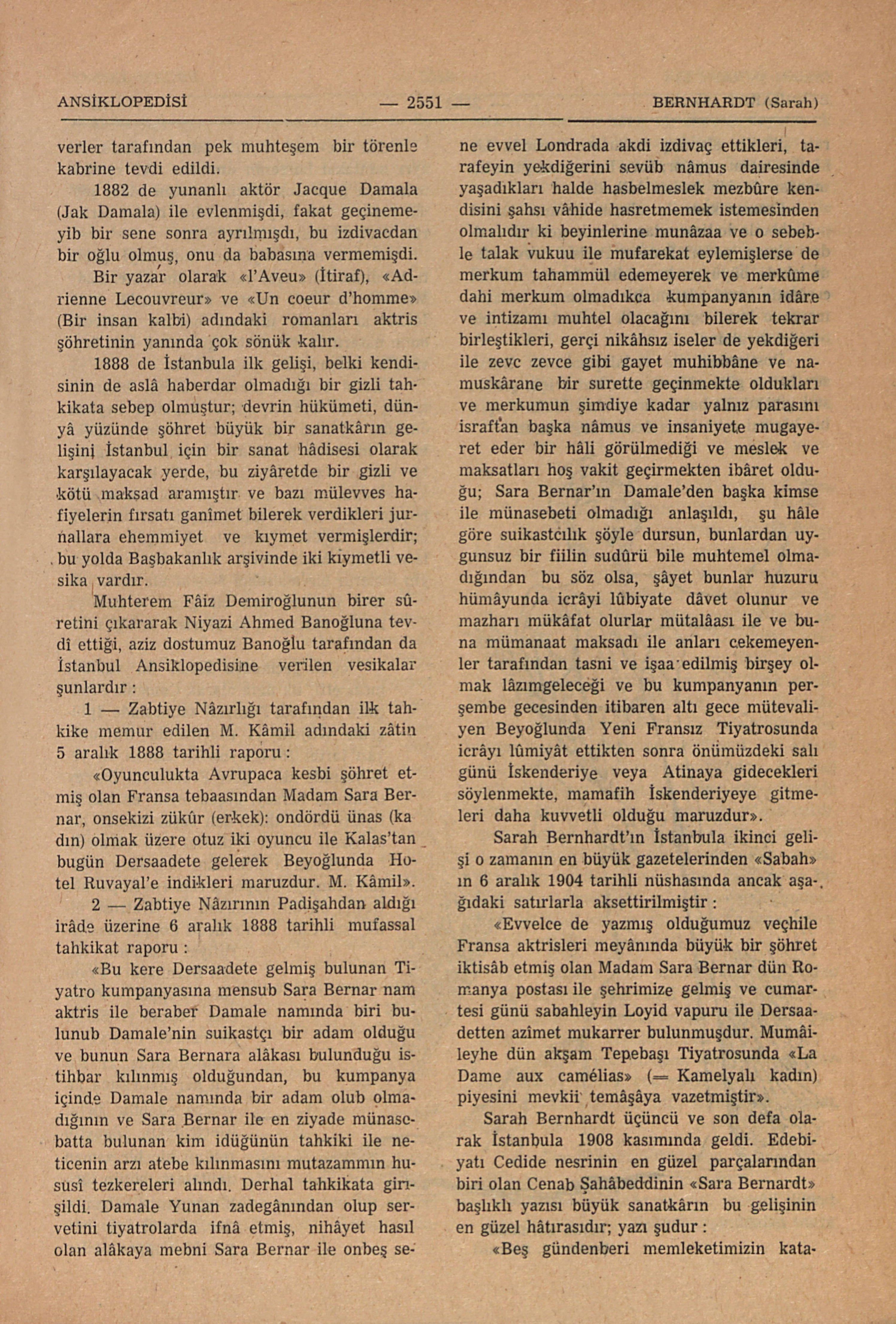 “Bu kere Dersaadete gelmiş bulunan Tiyatro kumpanyasına mensub Sara Bernar namlı aktris ile beraber Damale namında biri bulunub Damale’nin suikastçı bir adam olduğu bunun Sara Bernara alâkası bulunduğu istihbar kılınmış olduğundan, bu kumpanya içinde Damale namında bir adam olub olmadığının ve Sara Bernar ile en ziyade münesebetta bulunan kim idüğünün tahkiki ile neticenin arzı atebe kılınmasını mutazammın hususî tezkereleri alındı. Derhal tahkikata girildi, Damale Yunan zadegânından olup servetini tiyatrolarda ifnâ etmiş, nihâyet hasıl olan alâkaya mebni Sara Bernar ile onbeş sene evvel Londrada akdi izdivaç ettikleri, tarafeyin yekdiğerini sevüb nâmus dairesinde yaşadıkları halde hasbelmeslek mezbûre kendisini şahsi vâhide hasretmemek istemesinden olmalıdır ki beyinlerine munâzaa ve o sebeble talak vukuu ile mufarekat eylemişlerse de merkum tahammül edemeyerek ve merkûme dahi merkum olmadıkca kumpanyanın idâre ve intizamı muhtel olacağını bilerek tekrar birleştikleri, gerçi nikâhsız iseler de yekdiğeri ile zevc, zevce gibi gayet muhibbâne ve namuskârane bir surette geçinmekte oldukları ve merkunun şimdiye kadar yalnız parasını israftan başka nâmus ve insaniyete mugayeret eder bir hâli görülmediği ve meslek ve maksatları hoş vakit geçirmekten ibâret olduğu; Sara Bernar’ın Damale’den başka kimse ile münasebeti olmadığı anlaşıldı, şu hâle göre suikastcılık şöyle dursun, bunlardan uygunsuz bir film sudûrü dâvet olunur ve mazharı mükâfat olurlar mütelâsı ile ve buna mümanaat maksadı ile anları cekemeyenler tarafından tasni ve işaa edilmiş birşey olmak lâzımgeleceği ve bu kumpanyanın perşembe gecesinden itibaren altı gece mütevaliyen Beyoğlunda Yeni Fransız Tiyatrosunda icrâyı lûmiyât ettikten sonra önümüzdeki salı günü İskenderiye veya Atinaya gidecekleri söylenmekte, mamafih İskenderiyeye gitmeleri daha kuvvetli olduğu maruzdur”.