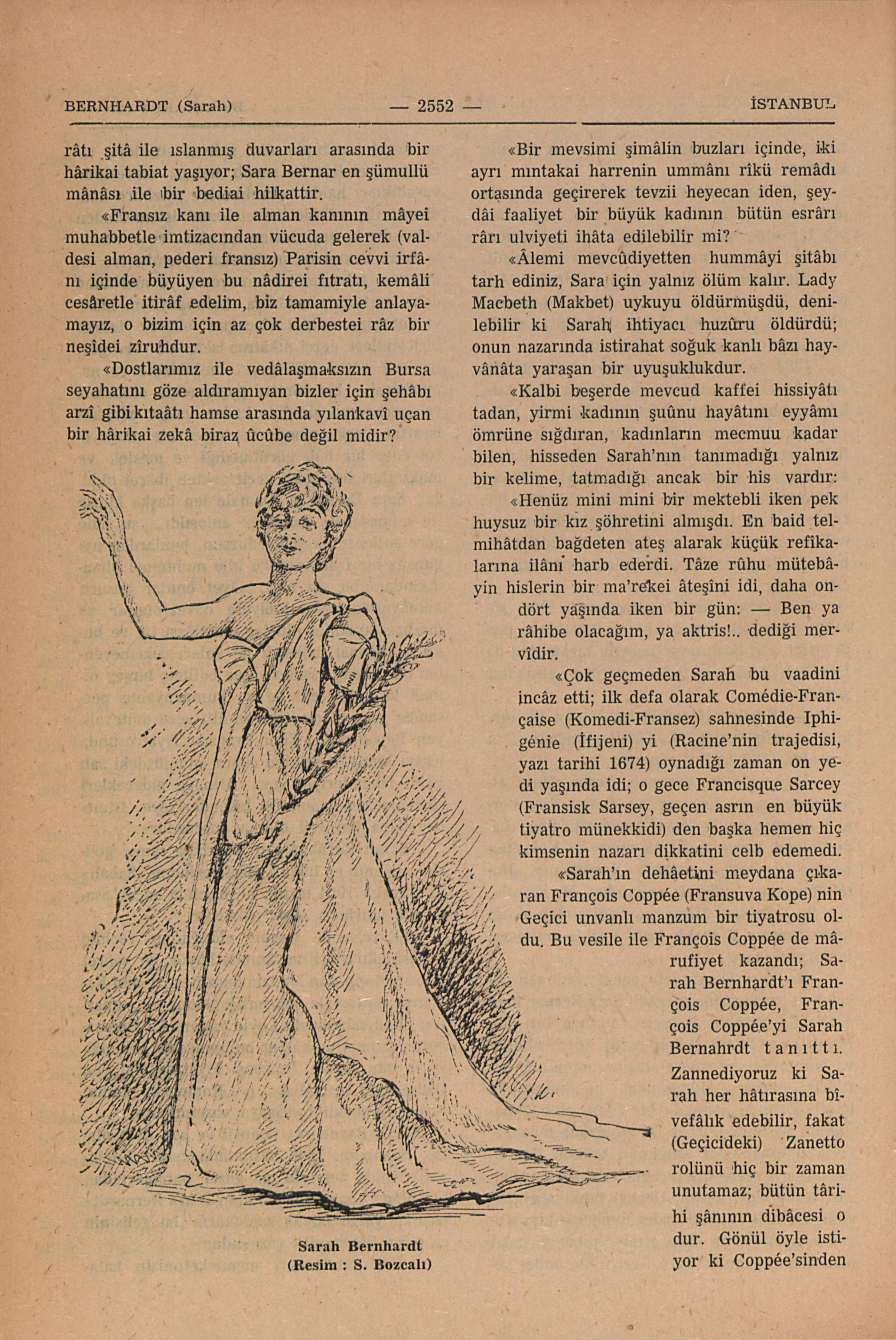 Adı yazılış şekline göre değil, yalnız kendime mahsus istisnâi olarak “Sara Berna” diye okunur, asıl adı da Rosine Bernard (Rozin Bernar) dır; geçen asrın ikinci yarısı ile asrımızın başlarının ünlü Fransız aktrisi; zamanında dünyanın en büyük şöhretlerinden biri olmuş sahne sanatkârı hüviyetinin yanında roman yazarı, ressam ve heykeltıraş; 1844 de Parisde doğdu, ciddi bir tahsil ile sağlam edebî kültüre sâhib olarak Konservatuvarı bitirdi. Lirik yaradılışı, güzelliği ve sihirkâr sesi ile bir hilkat bedîası idi, ilk şöhretini 1869 da Odeon Tiyatrosunda, o zamanlar pek genc bir şâir olan François Coppée (Fransuva Kope) nin “Le Passant = Geçici adam” adındaki küçük manzum piyesinde “Zanette” rolu ile yapdı, ki Zanetto bu piyesde bir âşık delikanlıdır. Sarah Bernhardt Zanetto olduğu zaman henüz yirmi beş yaşında idi, şöhret yoluna tüysüz bir delikanlı olarak girmiş olan büyük sanatkâr, yıllarca sonra, yaşı altmışını aşkın olduğu zamanlar da sahneye ondokuz yaşında bir kız olarak çıkacakdı.