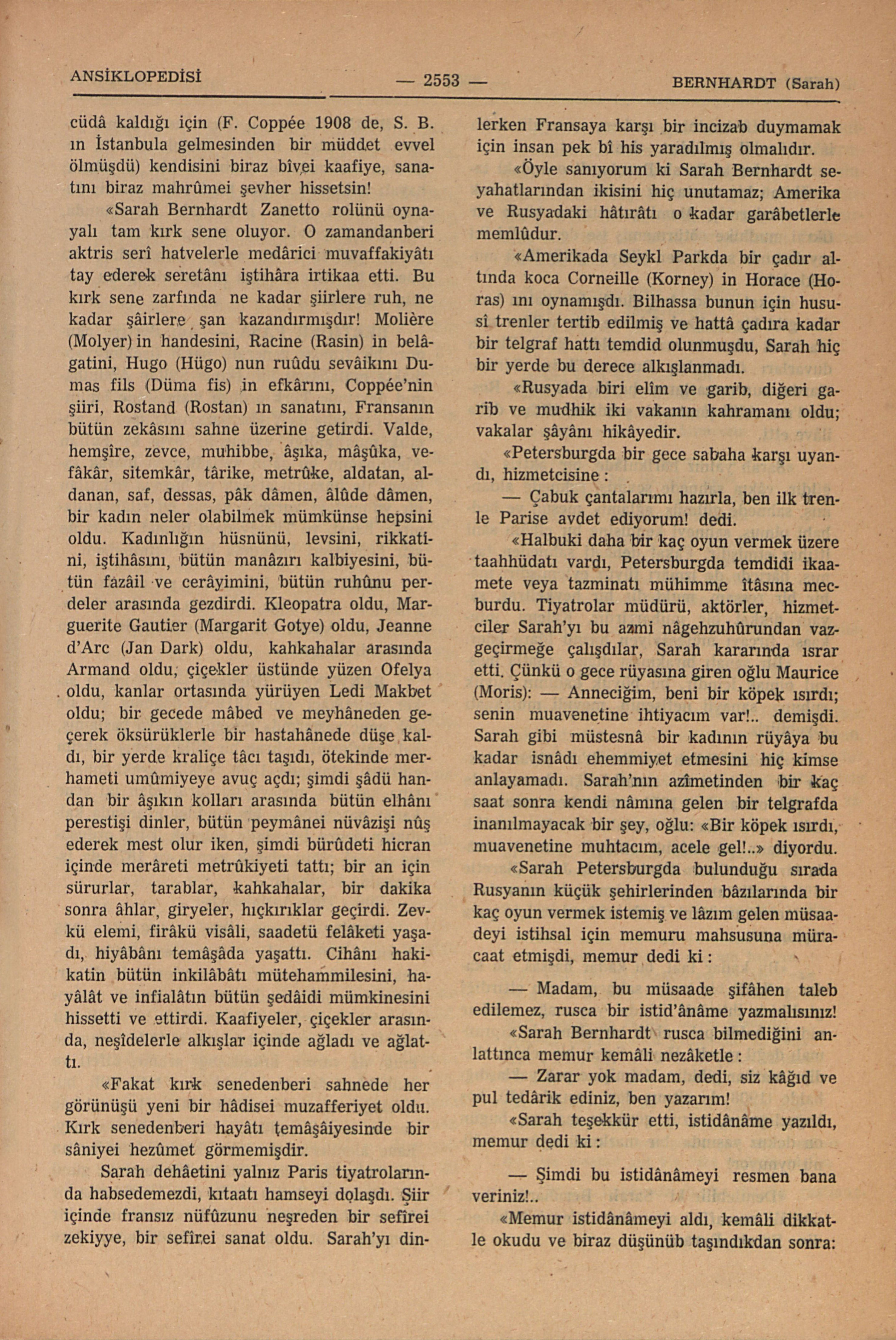 “Sarah Bernhardt Zanetto rolünü oynayalı tam kırk sene oluyor. O zamandanberi aktris seri hatvelerle medârici muvaffakiyâtı tay ederek seretânı iştihâra irkiaa etti. Bu kırk sene zarfında ne kadar şiirlere ruh, ne kadar şâirlere şan kazandırmışdır! Molière (Molyer) in handesini, Racine (Rasin) in belâgatini, Hugo (Hügo) nun ruûdu sevâıkını Dumas fils (Düma fis) in efkârını, Coppée’nin şiiri, Rostand (Rostan) ın sanatını, Fransanın bütün zekâsını sahne üzerine getirdi. Valde, hemşire, zevce, târike, metrûke, aldatan, aldanan, saf, dessas, plâk, dâmen, âlûde dâmen, bir kadın neler olabilmek mümkünse hepsini oldu. Kadınlığın hüsnünü, levsini, rikkatini, iştihâsını, bütün manâzırı kalbiyesini, bütün fazâil ve cerâyimini, bütün ruhûnu perdeler arasında gezdirdi. Kleopatra oldu, Margureite Gautier (Margarit Gotye) oldu, Jeanne d’Arc (Jan Dark) oldu, kahkahalar arasında Armand oldu, çiçekler üstünde yüzen Ofelya oldu, kanlar ortasında yürüyen Ledi Makbet oldu; bir gecede mâbet ve meyhânede düşe kaldı, bir yerde kraliçe tâcı taşıdı; şimdi şâdü handan bir âşıkın kolları arasında bütün elhânı perestişi dinler, bütün peymânei nüvâzişi nûş ederek mest olur iken, şimdi bürûdeti hicran içinde merâreti metrûkeyeti tatlı; bir an için sürurlar, tarablar, kahkahalar, bir dakika sonra âhlar, giryeler, hıçkırıklar geçirdi. Zevkü elemi, firâkü visâli, saadetü felâketi yaşadı, hiyâbanı temâşâda yaşattı. Cihânı hakikatin bütün inkilabâtı mütehemmilesini, hayâlât ve infialâtın bütün şedâidi mümkinesini hissetti ve ettirdi. Kaafiyeler, çiçekler arasında neşidelerle alkışlar içinde ağladı ve ağlattı.