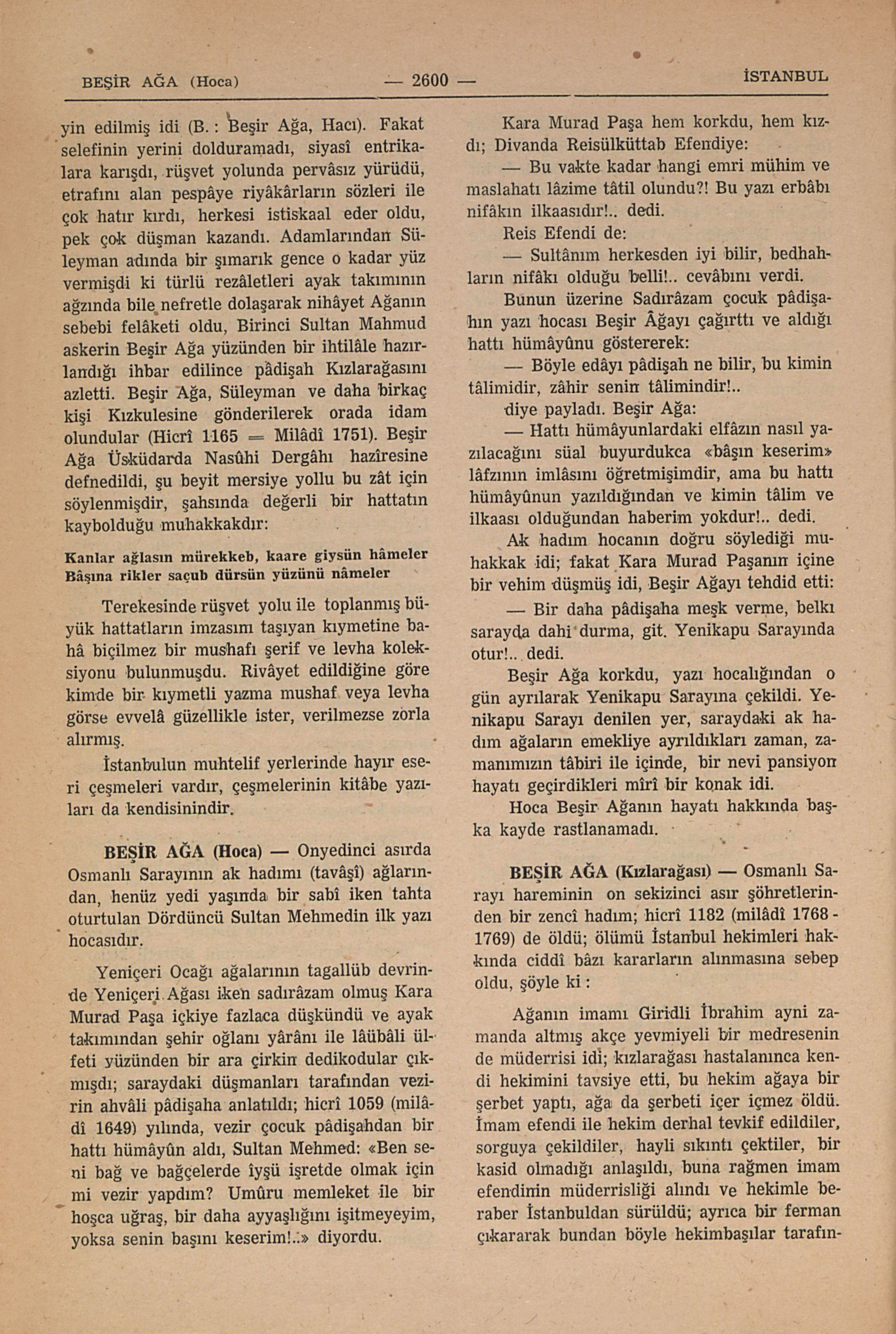 Onyedinci asırda Osmanlı Sarayının ak hadımı (tavâşâ) ağlarından, henüz yedi yaşında bir sahî iken tahta oturtulan Dördüncü Sultan Mehmedin ilk yazı hocasıdır. Yeniçeri Ocağı ağalarınıın tagallüb devrinde Yeniçeri Ağası iken sadırâzam olmuş Kara Murad Paşa içkiye fazlaca düşkündü ve ayak takımından şehir oğlanı yârânı ile lâubâli ülfeti yüzünden bir ara çirkin dedikodular çıkmışdı; saraydaki düşmanları tarafından vezirin ahvâli pâdişaha anlatıldı; hicrî 1059 (milâdî 1649) yılında, vezir çocuk pâdişahdan bir hattı hümâyûn aldı. Sultan Mehmed; “Ben seni bağ ve bağçelerde iyşü işretde olmak için mi vezir yapdım? Umûru memleket ile bir hoşça uğraş, bir daha ayyaşlığını işitmeyeyim, yoksa senin başını keserim!..” diyordu. Kara Murad Paşa hem korkdu, hem kızdı; Divanda Reisülküttâb Efendiye: — Bu vakte kadar hangi emri mühim ve mashalatı lâzime tâtil olundu?” Bu yazı erbâbı nifâkın ilkaasıdır!.. dedi. Reis Efendi de: — Sultânım herkesden iyi bilir, bedhahların nifâkı olduğu belli!... cevâbını verdi. Bunun üzerine Sadırâzam çocuk pâdişâhın yazı hocası Beşir Âğayı çağırttı ve aldığı hattı hümâyûnu göstererek: — Böyle edâyı pâdişah ne bilir, bu kimin tâlimidir, zâhir senin tâlimindir!.. diye payladı, Beşir Ağa: — Hattı hümâyunlardaki elfâzın nasıl yazılacağını süal buyurdukca “bâşın keser...