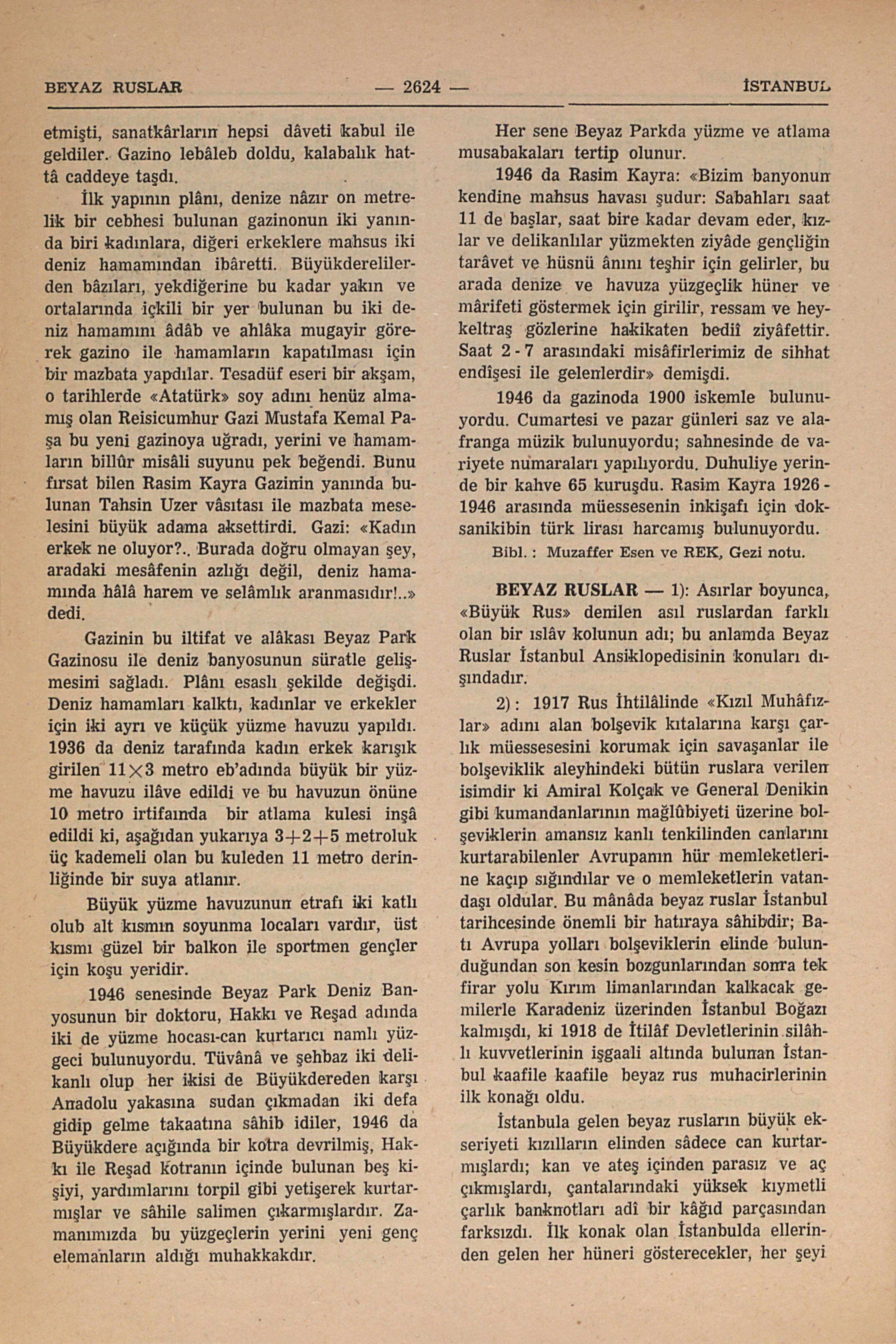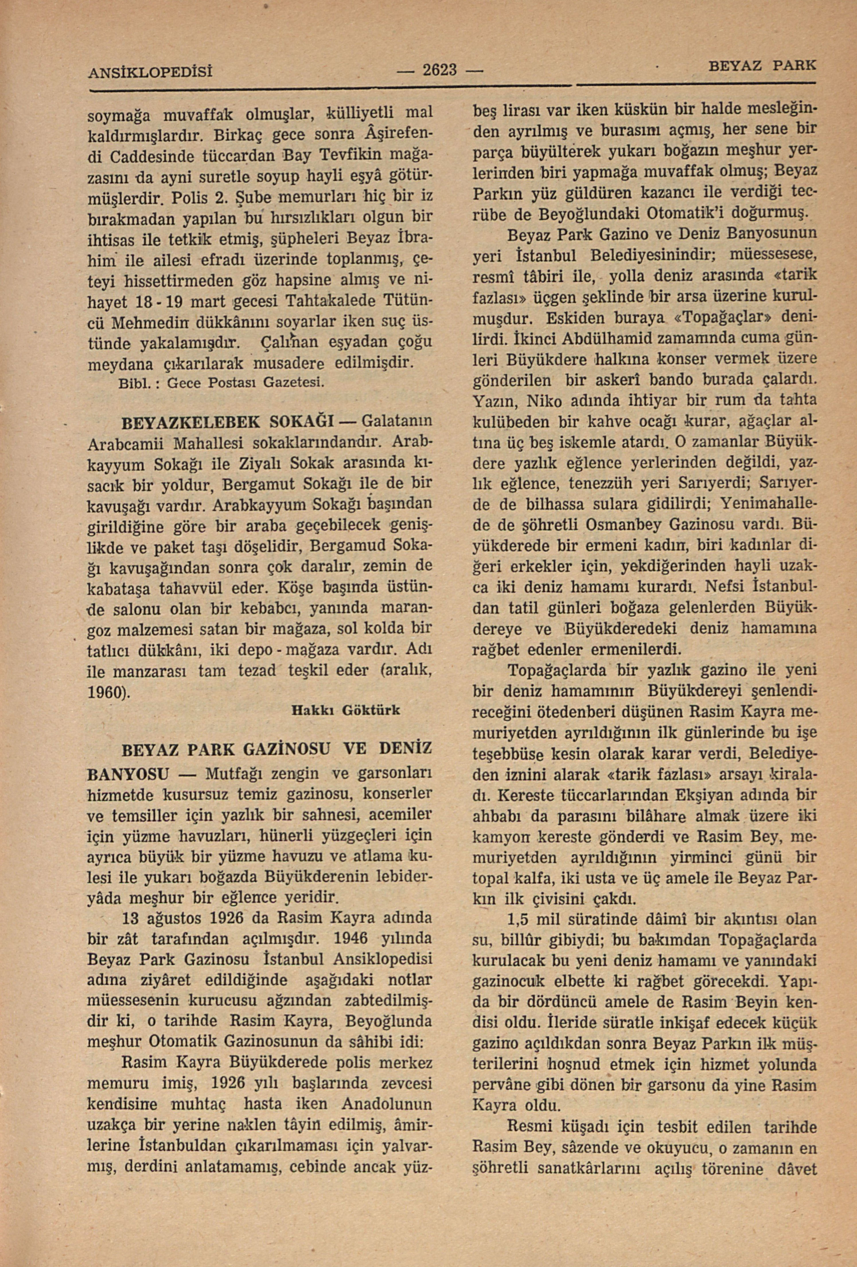 Mutfağı zengin ve garsonları hizmetde kusursuz temiz gazinosu, konserler ve temsiller için yazlık bir sahnesi, acemiler için yüzme havuzları, hünerli yüzgeçleri için ayrıca büyük bir yüzme havuzu ve atlama kulesi ile yukarı boğazda Büyükderenin lebi deryâda meşhur bir eğlence yeridir. 13 ağustos 1926 da Rasim Kayra adında bir zât tarafından açılmışdır. 1946 yılında Beyaz Park Gazinosu İstanbul Ansiklopedisi adına ziyâret edildiğinde aşağıdaki notlar müessesenin kurucusu ağzından zabtedilmişdir ki, o tarihde Rasim Kayra, Beyoğlunda meşhur Otomatik Gazinosunun da sâhibi idi: Rasim Kayra Büyükderede polis merkez memuru imiş. 1926 yılı başlarında zevcesi kendisine muhtaç hasta iken Anadolunun uzakça bir yerine naklen tâyin edilmiş, âmirlerine İstanbuldan çıkarılmaması için yalvarmış, derdini anlatamamış, cebinde ancak yüzbeş lirası var iken küskün bir halde bir halde mesleğinden ayrılmış ve burasını açmış, her sene bir parça büyülterek yukarı boğazın meşhur yerlerinden biri yapmağa muvaffak olmuş; Beyaz Parkın yüz güldüren kazancı ile verdiği tecrübe de Beyoğlundaki Otomatik’i doğurmuş. Beyaz Park Gazinosu ve Deniz Banyosunun yeri İstanbul Belediyesinindir; müessesese, resmî tâbiri ile, yolla deniz arasında ”tarik fazlası” üçgen şeklinde bir arsa üzerine kurulmuşdur. Eskiden buraya “...