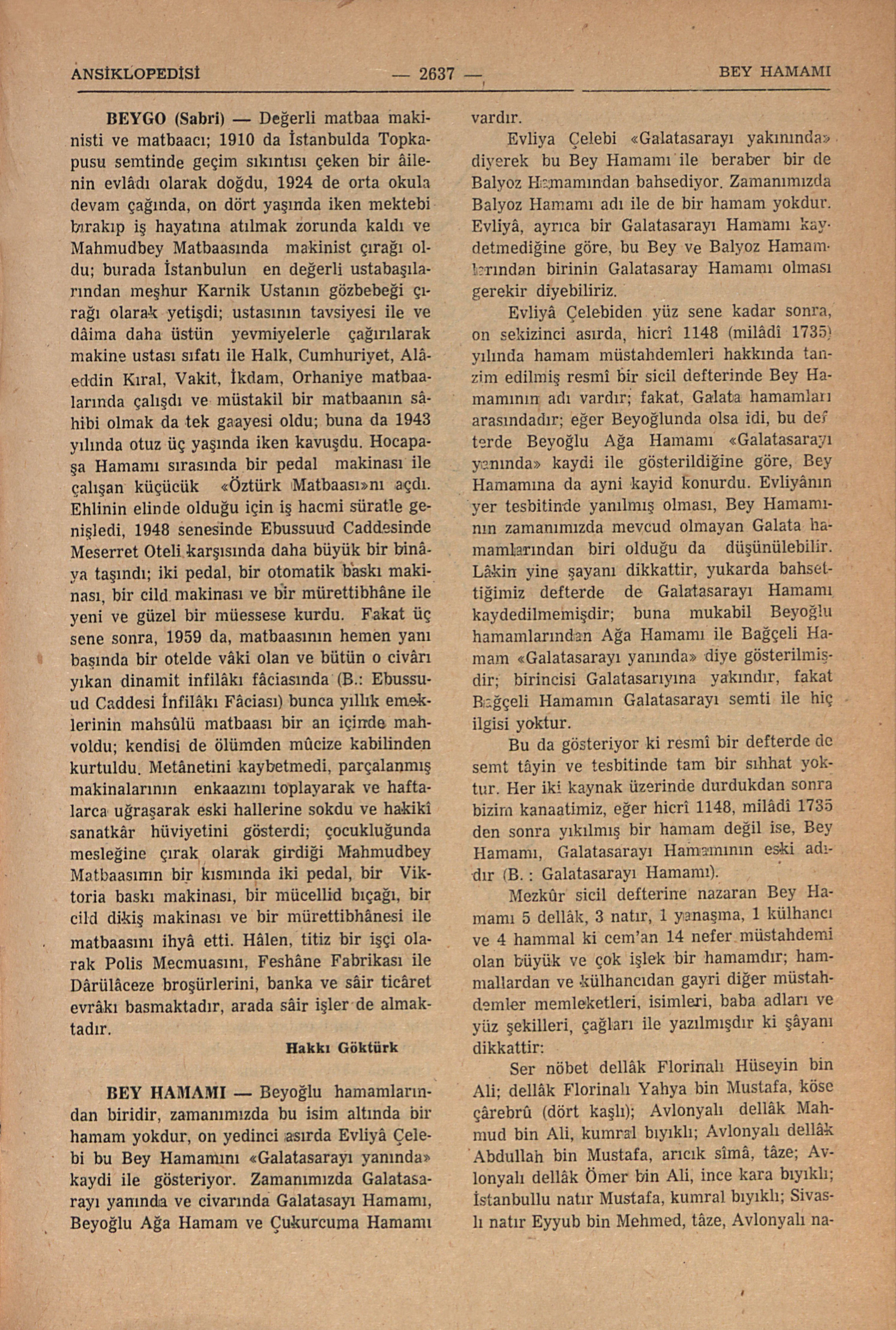 Değerli matbaa makinesti ve matbaacı; 1910 da İstanbulda Topkapusu semtinde geçim sıkıntısı çeken bir âilenin evlâdı olarak doğdu, 1924 de orta okulu devam çağında, on dört yaşında ikenmektebi bırakıp iş hayatına atılmak zorunda kaldı ve Mahmutbey Mataabasında makinist çırağı oldu, Burada İstanbulun endeğerli ustabaşılarından meşhur Karnik Ustanın gözbebeği çırağı olarak yetişdi; ustasının tasiyesi ile ve dâima daha üstün yevmiyelerle çağırılarak makine ustası sıfatı ile Halk, Cumhuriyet, Alâeddin Kıral, Vakit, İkdam, Orhaniye matbaalarında çalışdı ve müstakil bir matbaanın sâhibi olmak da tek gaayesi oldu; buna da 1943 yılında otuz üç yaşında ikenkavuşdu. Hocapaşa Hamamı sırasında bir pedal makinası ile çalışan küçücük “Öztürk Matbaası’nı açdı. Ehlinin elinde olduğu için iş hacmi süratle genişledi. 1948 senesinde Ebussuvd Caddesinde Meseret Oteli karşısında daha büyük bir binâya taşındı; iki pedal, bir otomatik baskı makinası, bir cildi makinası ve bir mürettebhâne ile yeni ve güzel bir müessese kurdu. Fakat üç sene sonra, 1959 da, matabasının hemen yanı başında bir otelde vâki olan ve bütün o civârı yıkan dinamit infilâkı fâcisanıda (B.: Ebussud Caddesi İnfilâkı Fâciası) bunca yıllık emeklerinin mahsûlu mataası biran içinde mahvoldu; kendisi de ölümden muûcze kabilinden kurtuldu. Metânetini kaybetmedi, parçlaanmış makinalarının enkaazını toplayarak ve haftalarca uğraşarak eski hallerine sokdu ve hakiki sanatkâr hüviyetini gösterdi; çocukluğunda mesleğine çırak olarak girdiği Mahmudbey Matbaasının bir kısmında iki pedal, bir Viktoria baskı makinası, bir mücellid bıçağı, bir cild dikiş makinası ve bir mürettibhânesi ile matbaasını ihyâ etti. Hâlen, titiz birişçi olarak Polis Mecmuasını, Feshâne Fabrikası ile Dâülceze broşürlerini, banka ve sâir ticâret evrâkı basmaktadır, arada şâir de almaktadır.