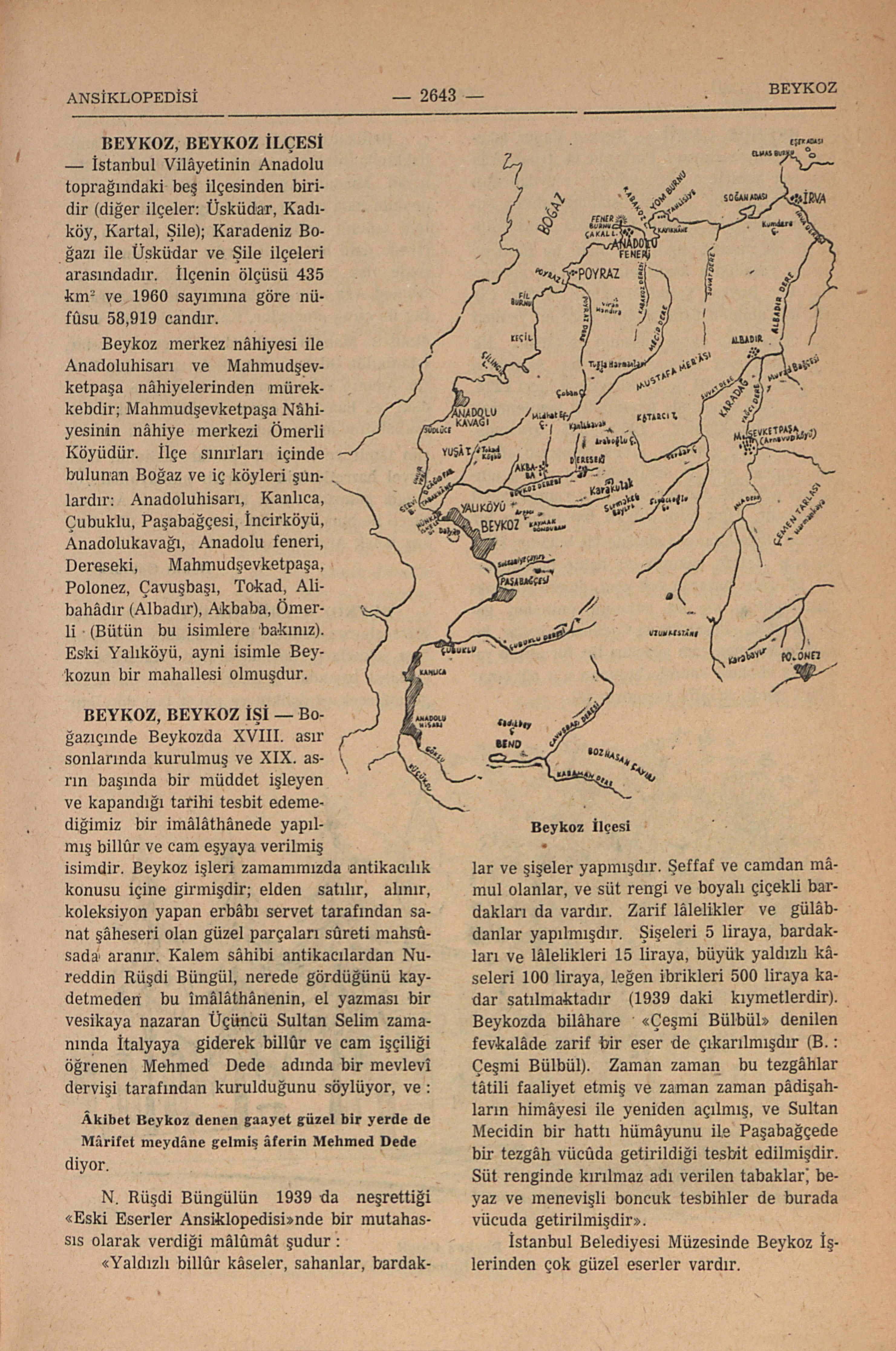 Boğaziçinde, Beykozda XVIII. asır sonlarında kurulmuş ve XIX. asrın başında birmüddet işleyen ve kapanıdğı tarihi tesbit edemediğimiz bir imâlâthânede yapılmış billûr ve cam eşyaya verilmiş isimdir. Beykoz işleri zamanımızda antikacılık konusu içine girmişdir; elden satılır, alınır, koleksiyon yapan erbâbı servet tarafından sanat şâheseri olan güzel parçaları sûreti mahsûsade aranır. Kalem sâhibi antikacılardan Nureddin Rüşdi Bingül, nerede gördüğünü kaydetmeden bu imâlâthânenin el yazması bir vesikaya nazaran Üçüncü Sultan Selim zamanında İtalyaya giderek billûr ve cam işçiliği öğrenen Mehmed Dede adında bir mevlevi dervişi tarafından kurulduğunu söylüyor, ve: Âkibeti Beykoz denen gaayet güzel bir yerde de Mârifet meydâne gelmiş âferin Mehmed Dede diyor. N. Rüşdî Büngülün 1939 da neşrettiği “Eski Eserler Ansiklopedisi”nde bir mutahassıs olarak verdiği mâlûmat şudur: “Yaldızlı billûr kâseler, sahanlar, bardaklar ve şişeler yapmışdır. Şeffaf ve camdan mâmul olanlar, ve süt rengi ve boyalı çiçekli bardakları da vardır. Zarif lâlelikler ve gülâbdanlar yapılmışdır. Şişeleri 5 liraya, bardakları ve lâlefikleri, 15 liraya, büyük yaldızlı kâseleri 100 liraya, leğen ibrikleri 500 liraya kadar satılmaktadır. (1939 daki kıymetlerdir.) Beykozda bilâhere “Çeşmi Bülbül” denilen fevkalâde zarif bir eser de çıkarılmışdır. (B.: Çeşmi Bülbül). Zaman zaman bu tezgâhlar tâtili faaliyet etiş ve zaman zaman pâdişahların himâyesi ile yeniden açılmış, ve Sultan Mecidin bir hattı hümâyunu ile Paşabağçede bir tezgâh vücûda getirildiği tesbit edilmişdir. Süt renginde kırılmaz adı verilen tabaklar, beyaz ve menevişli boncuk tesbihler de burada vücuda getirilmişdir.” İstanbul Belediyesi Müzesinde Beykoz İşlerinden çok güzel eserler vardır.