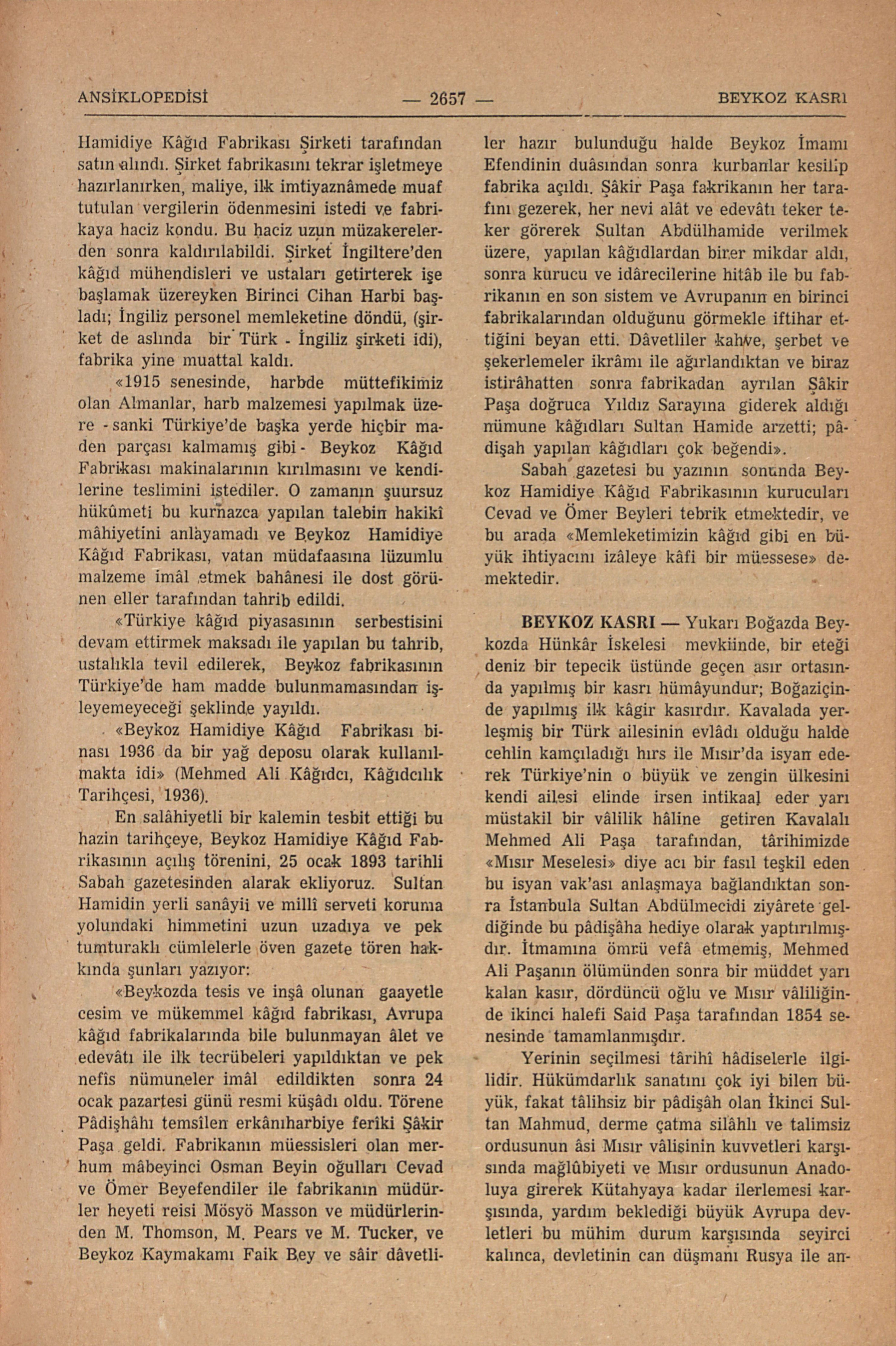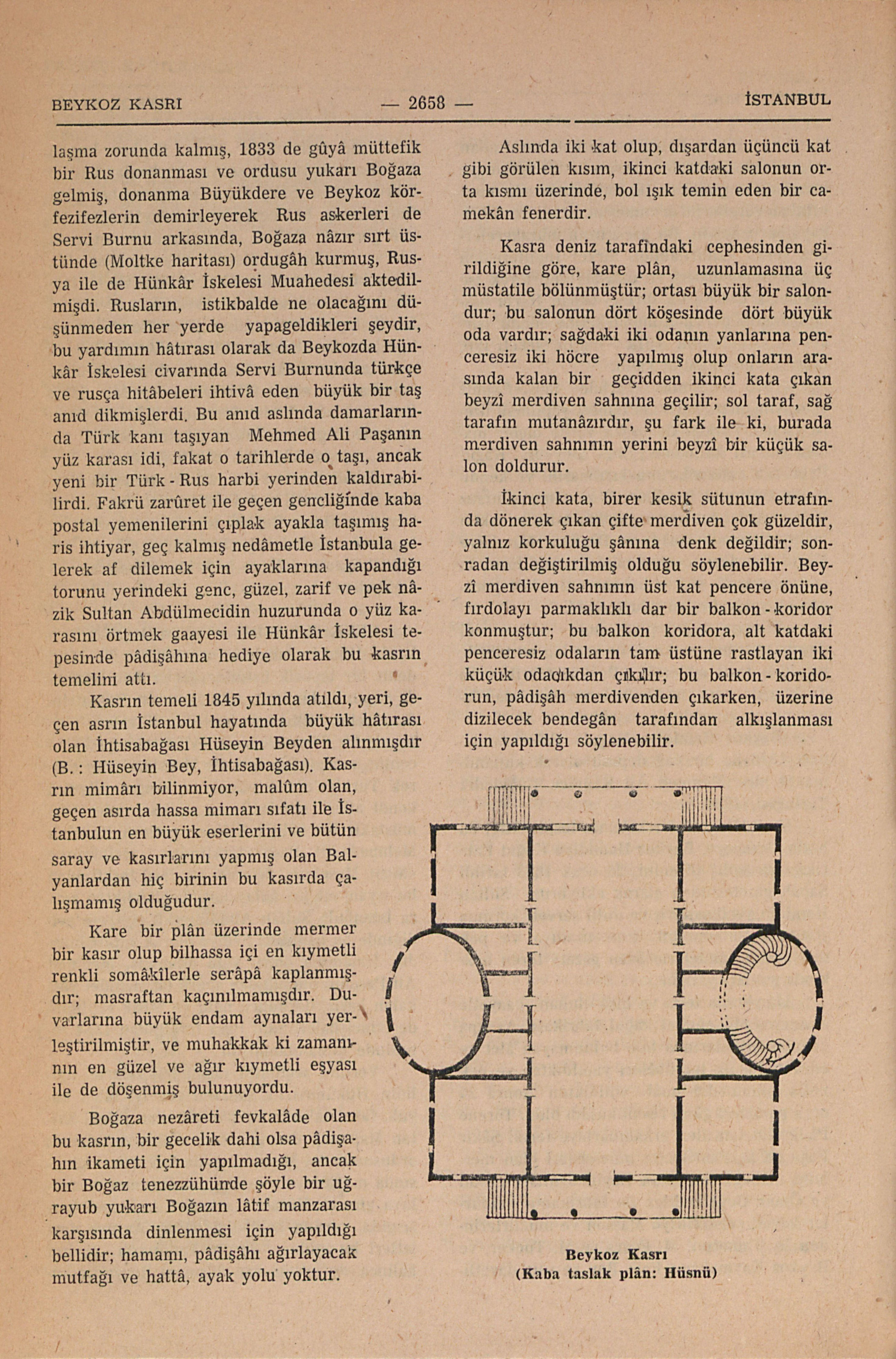 Yukarı Boğazlı Beykozda Hünkâr İskelesi mevkiinde, bir eteği deniz bir tepecik üstünde geçen asır ortasında yapılmış bir kasrı hümâyundur; Boğaziçinde yapılmış bir kâgir kasırdır. Kavalada yerleşmiş bir Türk ailesinin evlâdı olduğu halde cehlin kamçıladığı hırs ile Mısır’da isyan ederek Türkiye’nin o büyük ve zengin ülkesini kendi ailesi elinde irsen intikaal eder yarı müstakil bir vâlilik hâline getiren Kavalalı Mehmed Ali Paşa tarafından, târihimizde “Mısır Meselesi” diye acı bir fasıl teşkil eden bu isyan vak’ası anlaşmaya bağlandıktan sonra İstanbula Sultan Abdülmecidi ziyârete geldiğinden bu pâdişâha hediye olarak yaptırılmışdır. İtmamına ömrü vefa etmemiş, Mehmed Ali Paşanın ölümünden sonra bir müddet yarım kalan kasır, dördüncü oğlu ve Mısır vâliliğinden ikinci halife Said Paşa tarafından 1854 senesinde tamamlanmışdır. Yerinin seçilmesi târihi hâdiselerle ilgilidir. Hükümdarlık sanatını çok iyi bilen büyük, fakat tâlihsiz bir pâdişah olan İkinci Sultan Mahmud, derme çatma silâhlı ve talimsiz ordusunun âsî Mısır vâlisinin kuvvetleri karşısında mağlûbiyeti ve Mısır ordusunun Anadoluya girerek Kütahyaya kadar ilerlememis karşısında, yardım beklediği büyük Avrupa devletleri bu mühim durum arşısında seyirci kalınca, devletinin can düşmaın Rusya ile anlaşma zorunda kalmış, 1833 ...
