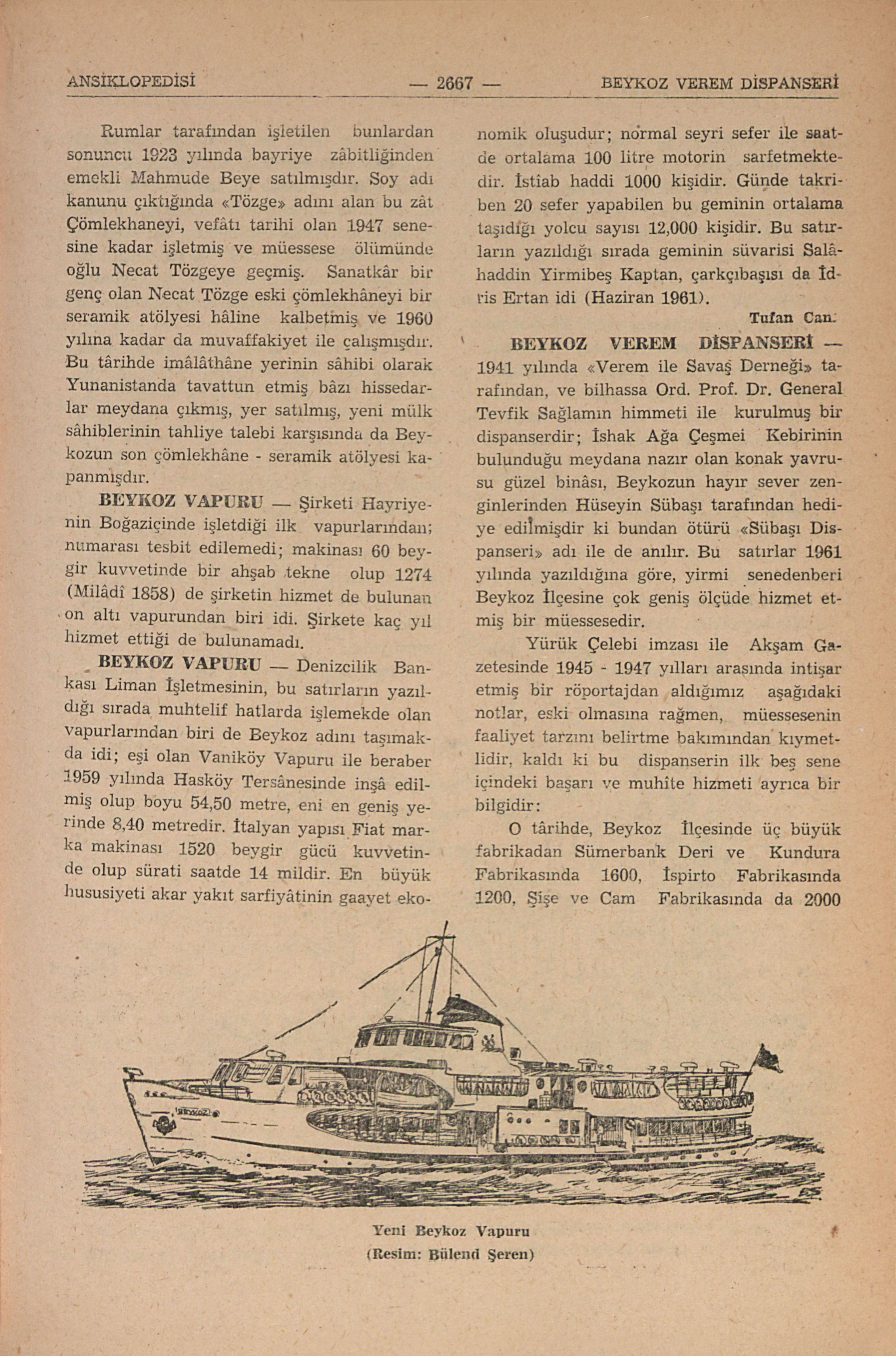 Denizcilik Bankası Liman İşletmesinin, bu satırların yazıldığı sırada muhtelif hatlarda işlemekde olan vapurlarından biride Beykoz adını taşımakda idi; eşi olan Vaniköy Vapuru ile beraber 1959 yılında Hasköy Tersânesinde inşâ edilmiş olup boyu 54,50 metre, eni en geniş yerinde 8,40 metredir. İtalyan yapısı Fiat marka makinası 1520 beygir gücü kuvvetinde olup sürati saatde 14 mildir. En büyük hususiyeti akar yakıt sarfiyâtinin gaayet ekonomik oluşudur; normal seyri sefer ile saatde ortalama 100 litre motorin sarfetmektedir. İstiab haddi 1000 kişidir. Günde takriben 20 sefer yapabilen bu geminin ortalama taşıdığı yolcu sayısı 12.000 kişidir. Bu satırların yazıldığı sırada geminin süvarisi Salâhaddin Yirmibeş Kaptan, çarkçıbaşısı da İdris Ertan idi. (Haziran 1961). Tufan Can. Yeni Beykoz Vapuru (Resim: Bülend Şeren)