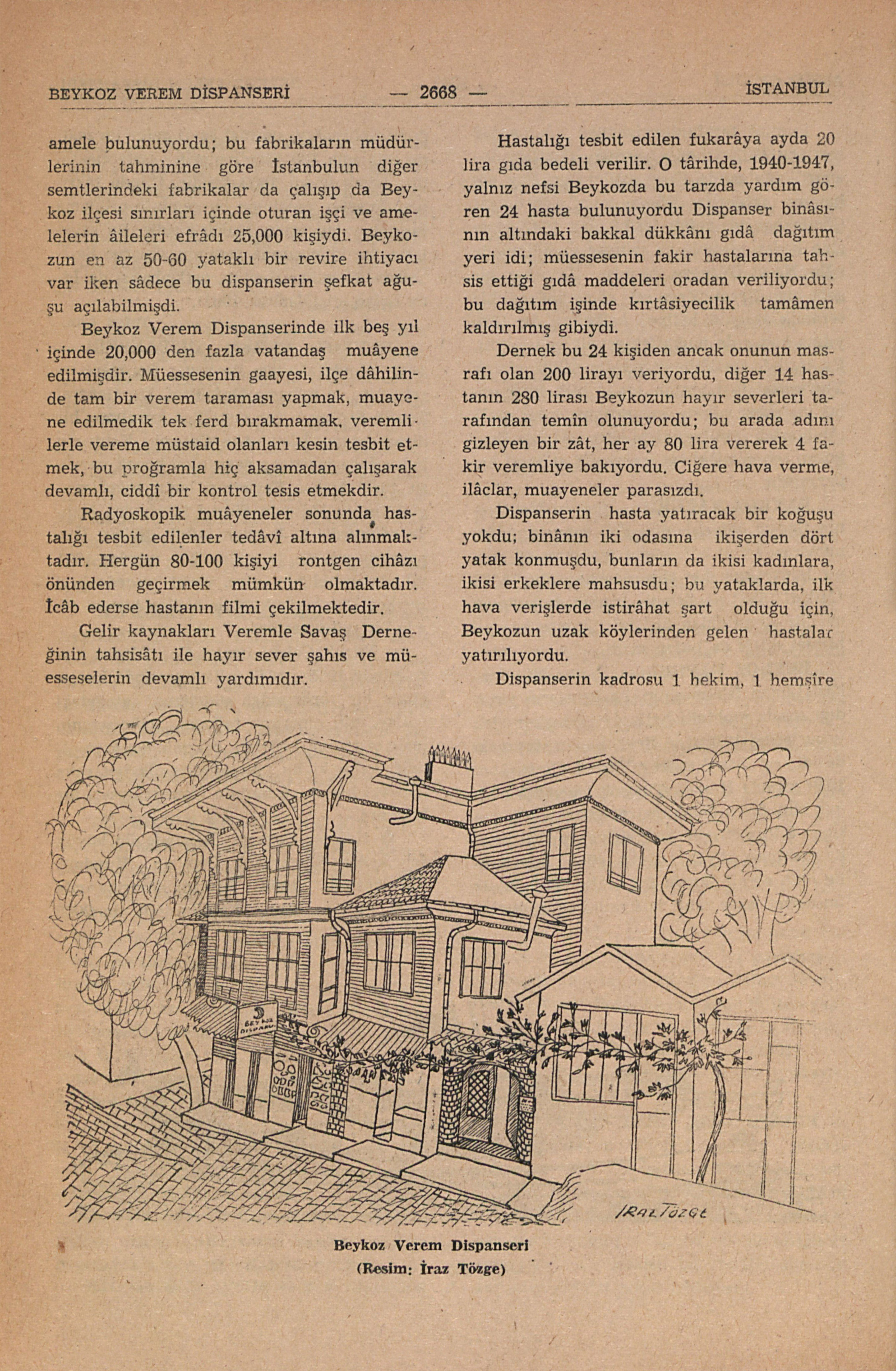 1941 yılında “Verem ile Savaş Derneği” tarafından, ve bilhassa Ord. Prof. Dr. General Tevfik Sağlamın himmeti ile kurulmuş bir dispanserdir; İshak Ağa Çeşmei Kebirinin bulunduğu meydana nazır olan konak yavrusu güzel binâsı, Beykozun hayır sever zenginlerinde Hüseyin Sübaşı tarafından hediye edilmişdir ki bundan ötürü “Sübaşı Dispanseri” adı ile de anılır. Bu satırlar 1961 yılında yazıldığına göre, yirmi senedenberi Beykoz İlçesine çok geniş ölçüde hizmet etmiş bir müessesedir. Yürük Çelebi imzası ile Akşam Gazetesinde 1945 - 1947 yılları arasında intişar etmiş bir röportajdan aldığımız aşağıdaki notlar, eski olmasına rağmen, müessesenin faaliyet tarzını belirtme bakımından kıymetlidir, kaldı ki bu dispanserin ilk beş sene içindeki başarı ve muhîte hizmeti ayrıca bir bilgidir: O târihde, Beykoz İlçesinde üç büyük fabrikadan Sümerbank Deri ve Kundura Fabrikasında 1600, İspirto Fabrikasında 1200, Şişe ve Cam Fabrikasında ve 2000 amele bulunuyordu; bu fabrikaların müdürlerinin tahminine göre İstanbulun diğer semtlerindeki fabrikalar da çalışıp da Beykoz ilçesi sınırları içinde oturan işçi ve amelelerin âileleri efrâdı 25,000 kişiydi. Beykozun en az 50-60 yataklı bir revire ihtiyacı var iken sâdece bu dispanserin şefkat ağuşu açılabilimişdi. Beykoz Verem Dispanserinde ilk beş yıl içi...