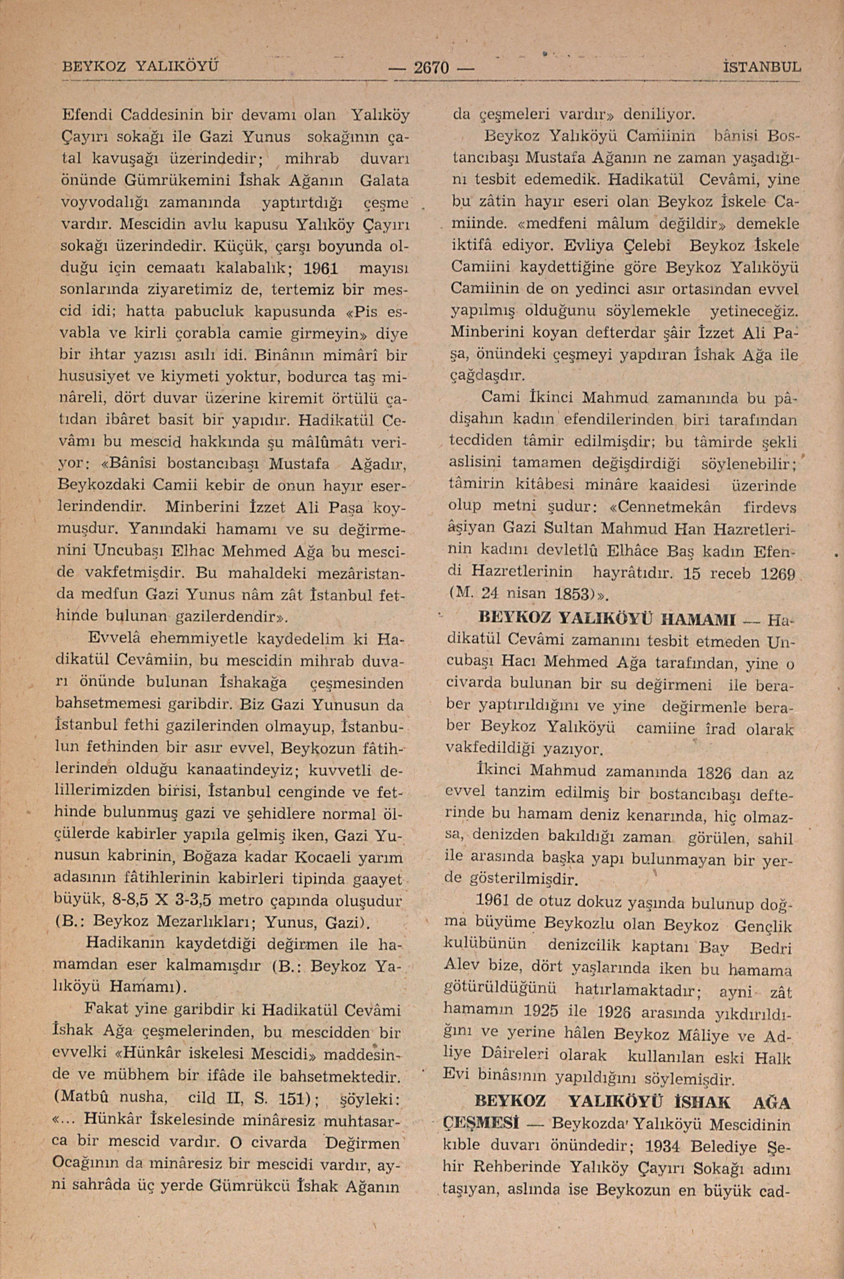 B.: Beykoz Mezarlıkları; Yunus, Gazi; B.: Beykoz Yalıköyü Hamamı