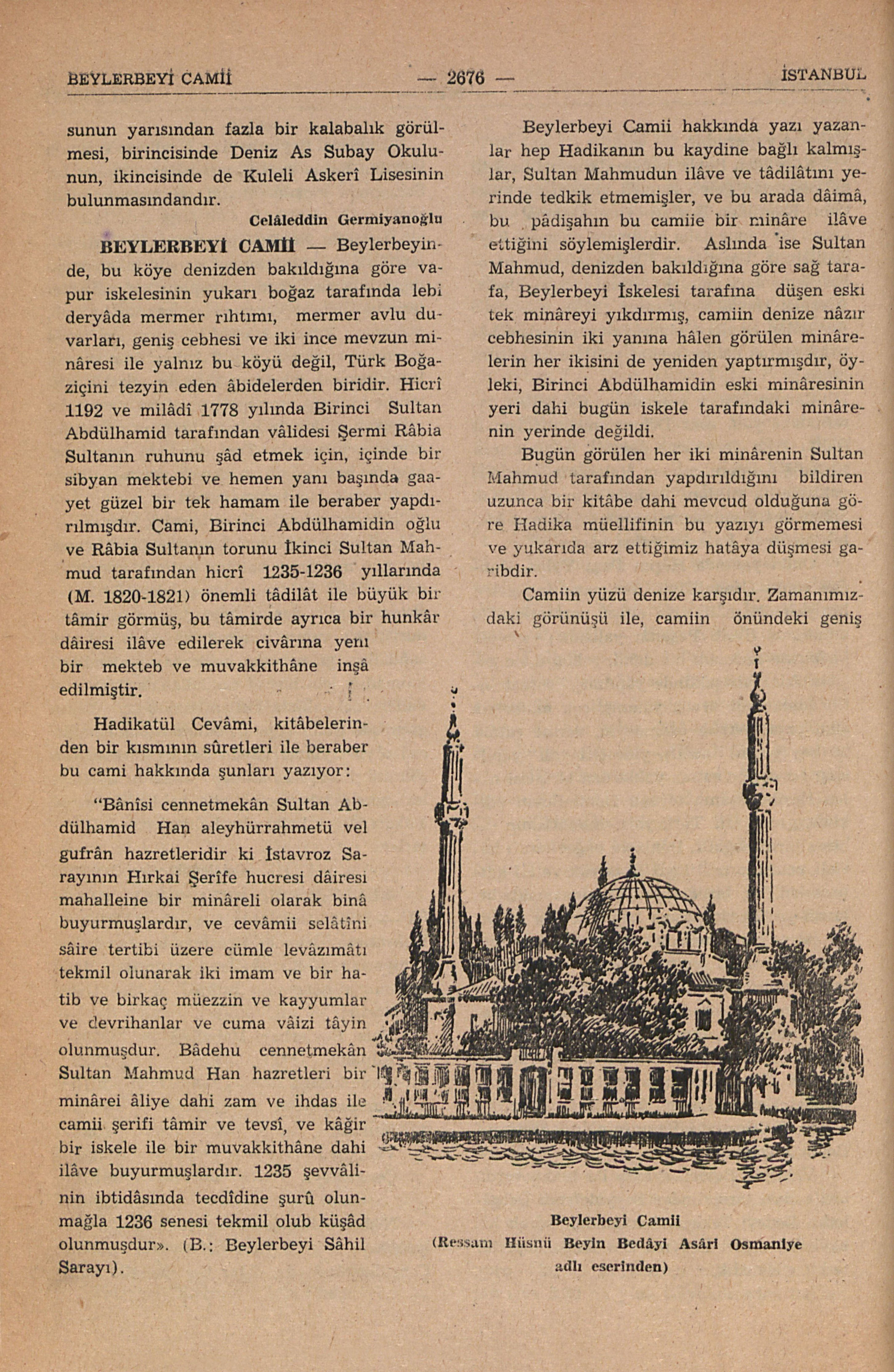 Beylerbeyi Camii hakkında yazı yazanlar hep Hadikanın bu kaydine bağlı kalmışlar, Sultan Mahmudun ilâve ve tâdilâtını yerinde tetkik etmemişler, ve bu arada dâimâ bu pâdişâhın bu camie bir rainâre ilâve ettiğini söylemişlerdir. Aslında ise Sultan Mahmud, denizden bakıldığına göre sağ tarafına, Beylerbeyi İskelesi tarafına düşen eski tek minâreyi yıkdırmış, Camiin denize nâzır cebhesinin iki yanına hâlen görülen minârelerin her ikisini de yeniden yaptırmışdır, öyleki, Birinci Abdülhamidin eski minâresidir yeri dahi bugün iskele tarafındaki minârenin yerinde değildi.