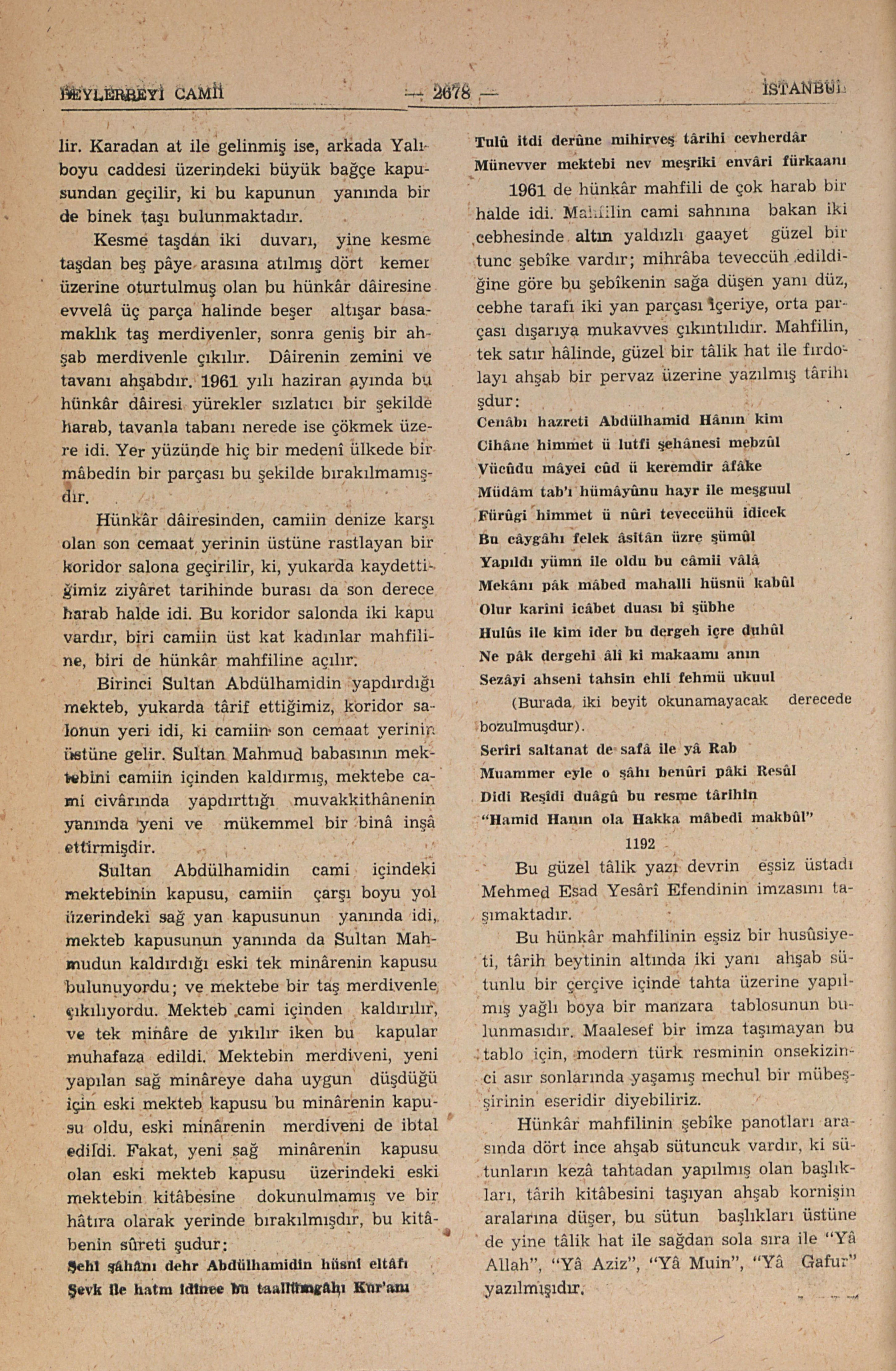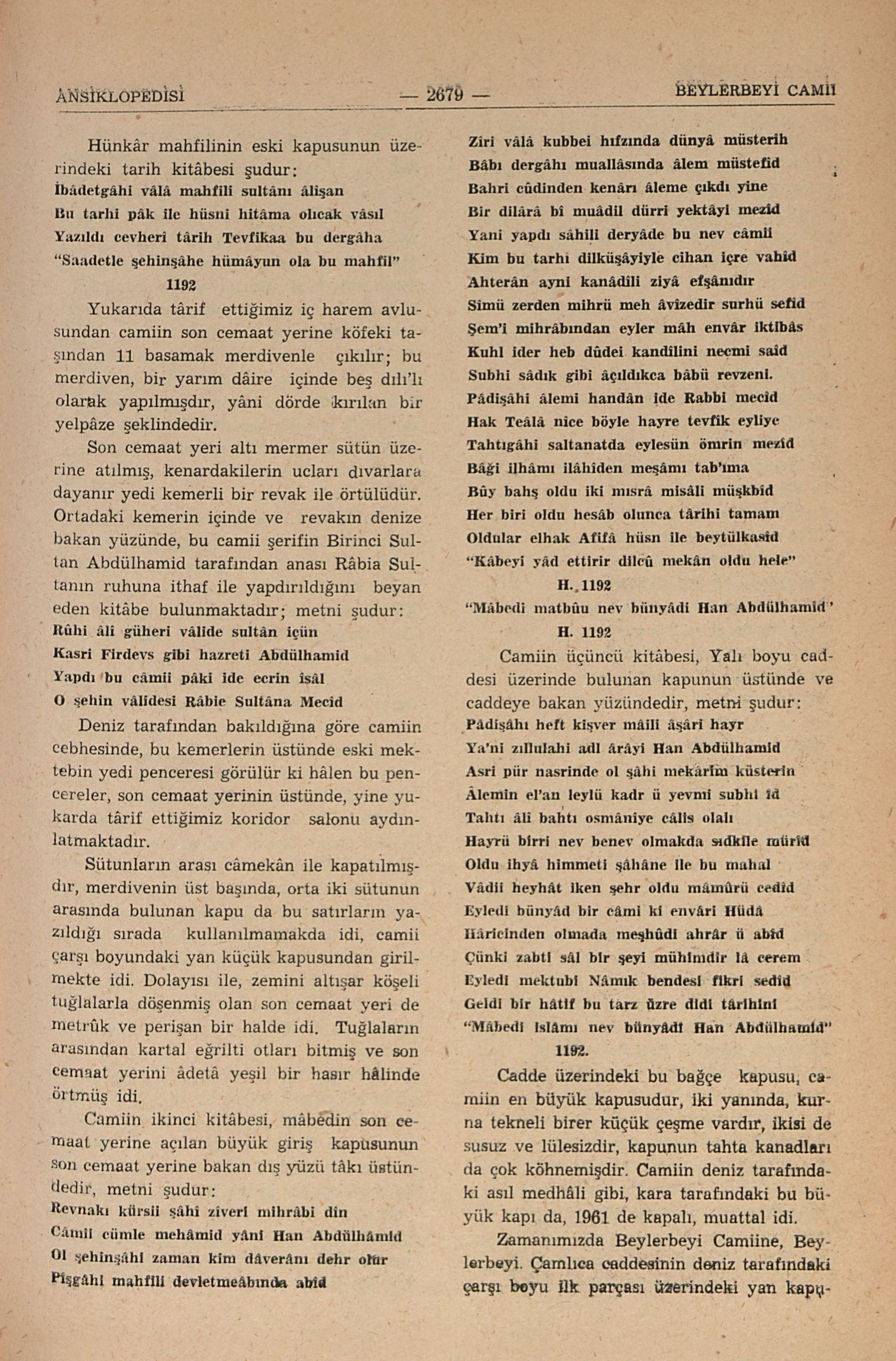 Deniz tarafından bakıldığına göre camiin sol minâresi kaaidesi ile bir şahıs mülkünün duvarı arasında da, yine İkinci Sultan Mahmud tarafından bir duvar çekilmişdir, bu duvarın arkası camiye aid ikinci bir harem avludur. Bu duvar da, Camiin son cemaat yeri önünde, yukarda târif ettiğimiz iç harem avlusunun etrafındaki duvarın bir yan parçasının aynıdır, bir büyük kapu ile iki yanında üçerden altı büyük pencere ile bezenmiş âbidevî bir duvardır. İkinci Sultan Mahmudun Beylerbeyi Camiini tâmir ve tevsiinin, ve dolayısı ile caminin yeni iki minâresinin kitâbesi işte bu kapunun üzerine konmuşdur ve Hadika müellifi tarafından görülmemişdir. Kitâbenin sûreti şudur: