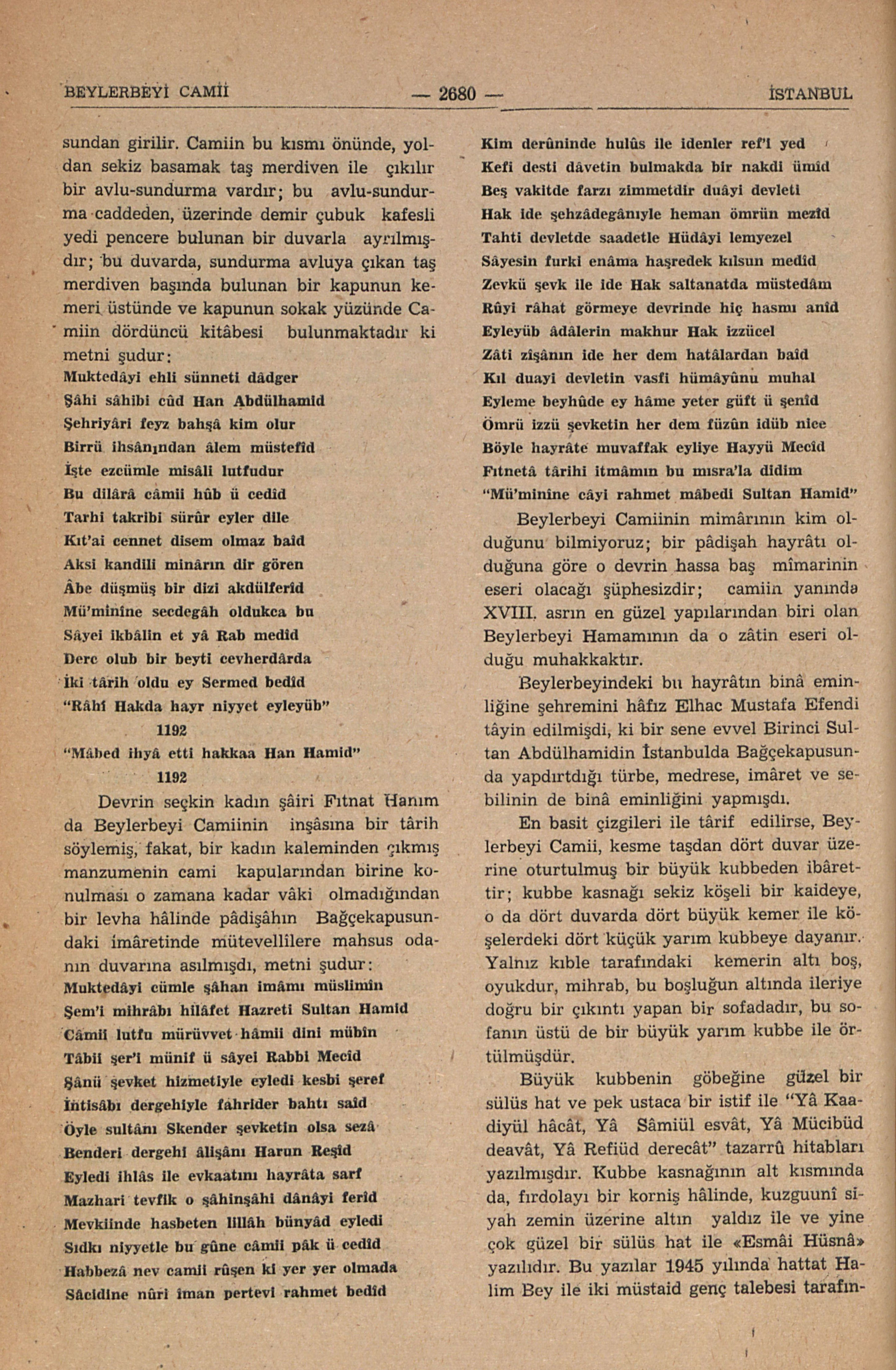 Devrin seçkin kadın şâiri Fıtnat Hanım da Beylerbeyi Caminin inşâsına bir târih söylemiş, fakat, bir kadın kaleminden çıkmış manzumenin cami kapularından birine konulması o zamana kadar vâki olmadığından bir levha hâlinde pâdişâhın Bağçekapusundaki imâretinde mütevellilere mahsus odanın duvarına asılmışdı, metni şudur:
