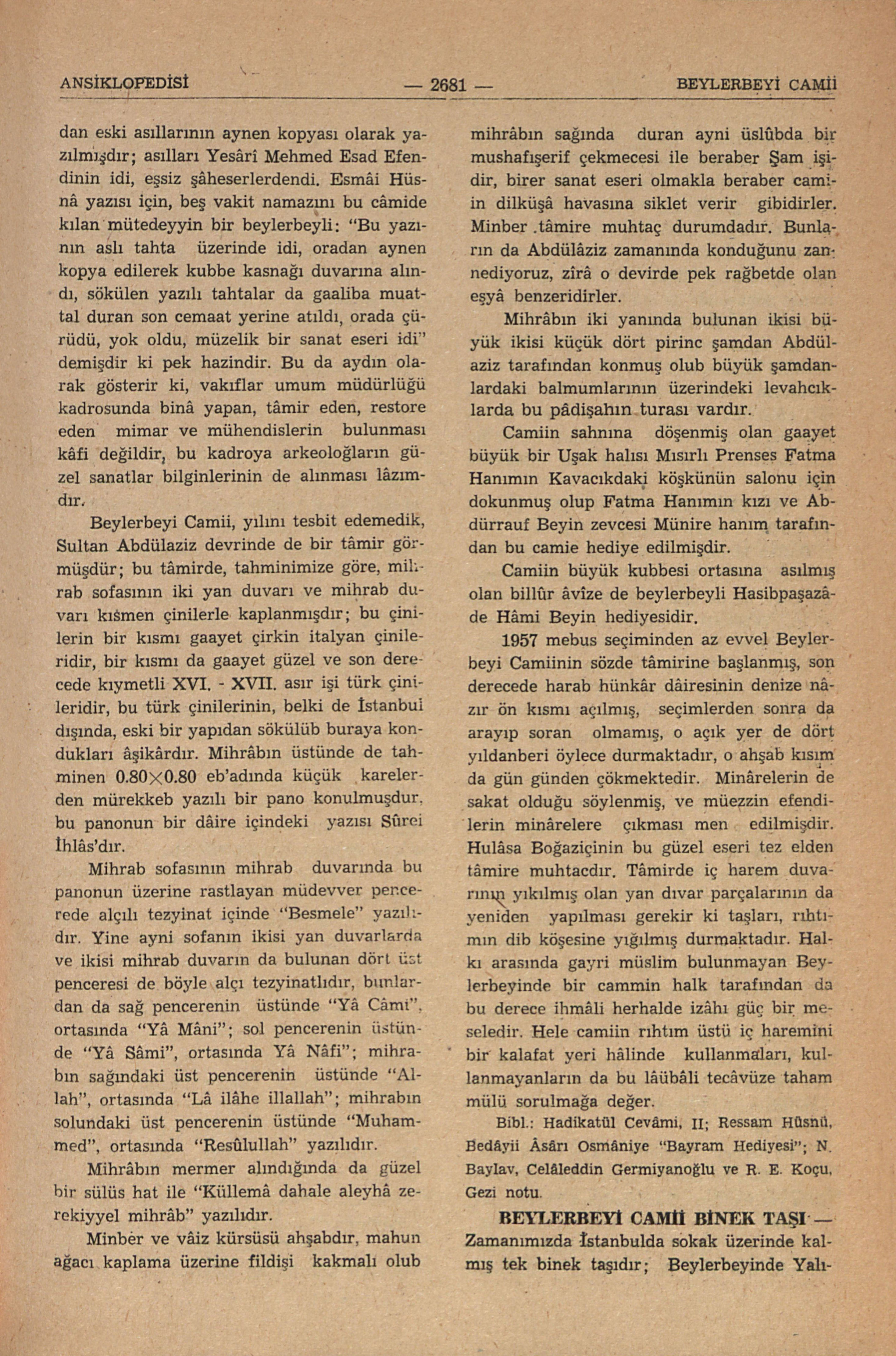 1957 mebus seçiminden az evvel Beylerbeyi Camiin sözde tâmirine başlanmış, son derecede harab hünkâr dâiresinin denize nâzır ön kısmı açılmış, seçimlerden sonra da arayıp soran olmaşı, o açık yer de dört yıldanberi öylece durmaktadır, o ahşab kısım da gün günden çökmektedir. Minârelerin de sakat olduğu söylenmiş, o müezzin efendilerin minârelere çıkması men edilmişdir. Hulâsa Boğaziçinin bu güzel eseri tez elden tâmire muhtacdır. Tâmirde iç harem duvarının yıkılmış olan yan duvar parçalarının da yeniden yapılması gerekir ki taşları, rıhtımın dib köşesine yığılmış durmaktadır. Halkı arasında gayri müslim bulunmayan Beylerbeyinde bir caminin halk tarafından da bu derece ihmâli herhalde izâhı güç bir meseledir. Hele camiin rıhtım üstü iç haremini bir kalafat yeri hâlinde kullanmaları, kullanmayanların da bu lâübâli tecâvüze tahammülü sorulmağa değer.
