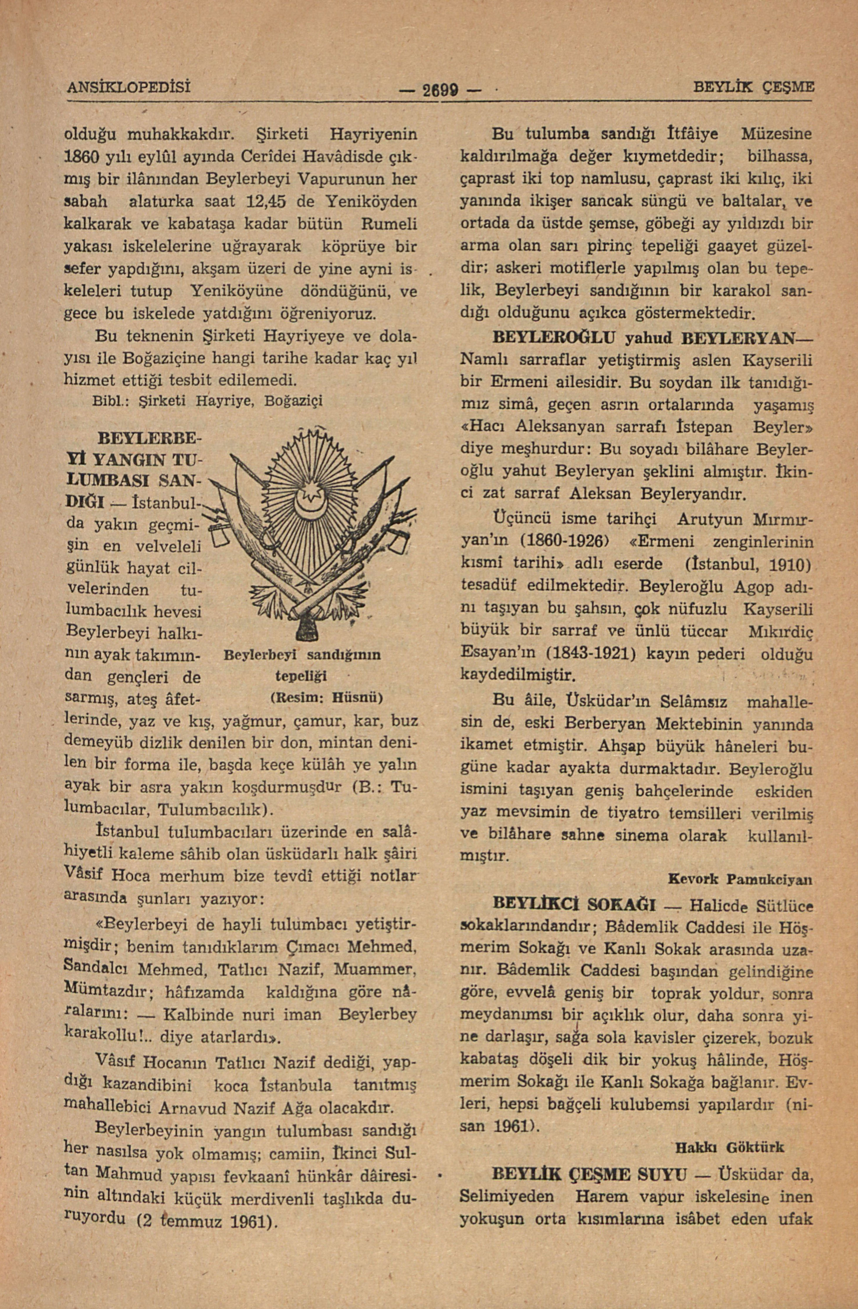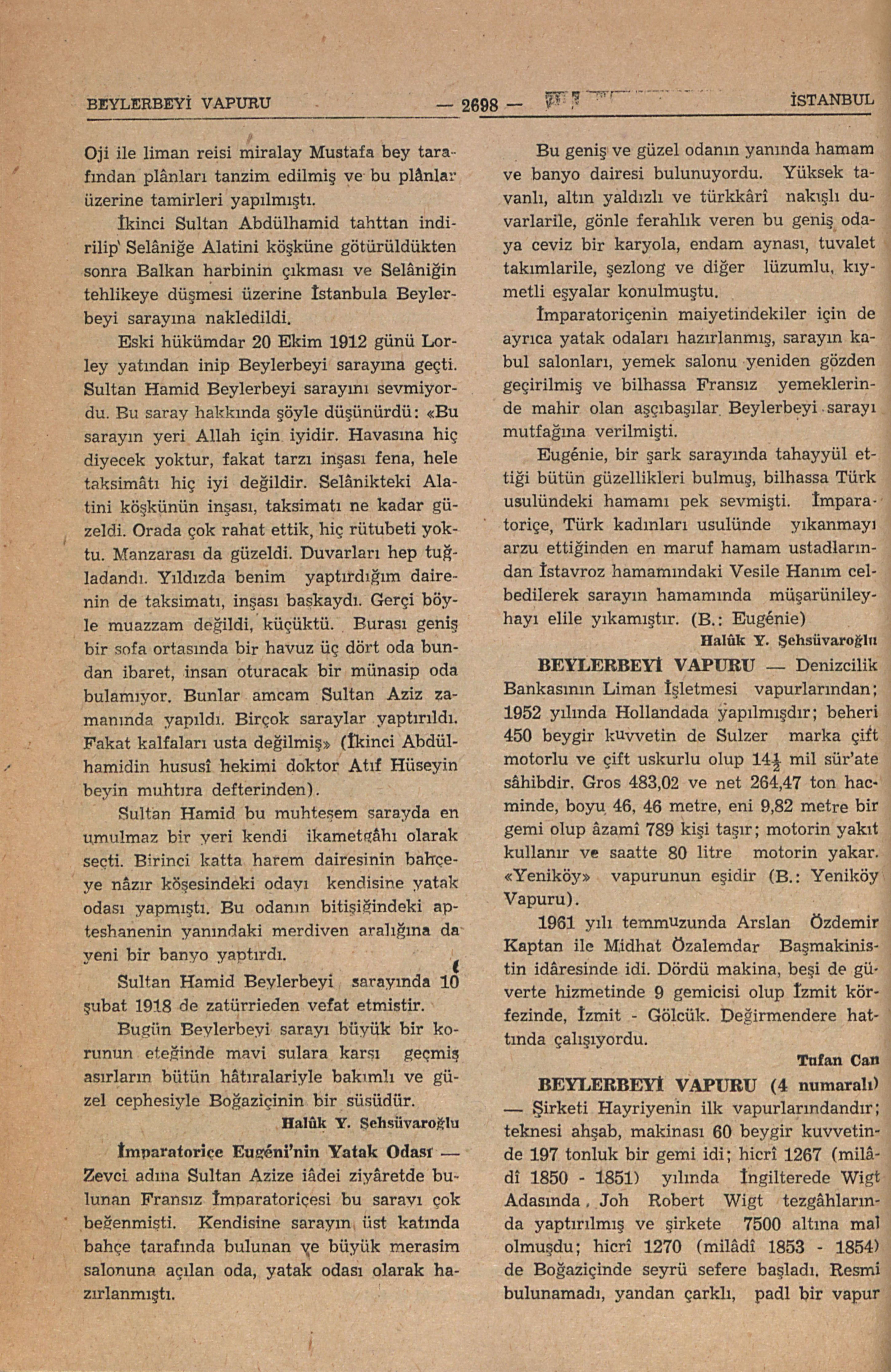 Şirketi Hayriyenin ilk vapurlarındandır teknesi ahşab, makinası 60 beygir kuvvetinde 197 tonluk bir gemi idi; hicrî 1267 (milâdî 1850 - 1851) yılında İngilterede Wigt Adasında Joh Robert Wigt tezgâhların da yaptırılmış ve şirkete 7500 altına mal olmuşdu; hicrî 1271 (milâdî 1853 - 1854) de Boğaziçinde seyrü sefere başladı. Resim bulunamadı, yandan çarklı, padl bir vapur olduğu muhakkakdır. Şirketi Hayriyenin 1860 yılı eylûl ayında Ceridei Havâdisde çıkmış bir ilânından Beylerbeyi Vapurunun her sabah alaturka saat 12,45 de Yeniköyden kalkarak ve kabataşa kadar bütün Rumeli yakası yapdığını, akşam üzeri de yine ayni iskeleleri tutup Yeniköyüne döndüğünü ve gece bu iskelede yatdığını öğreniyoruz. Bu teknenin Şirketi Hayriye ve dolayısı ile Boğaziçine hangi tarihe kadar kaç yıl hizmet ettiği tesbit edilemedi. Bibl.: Şirketi Hayriye, Boğaziçi