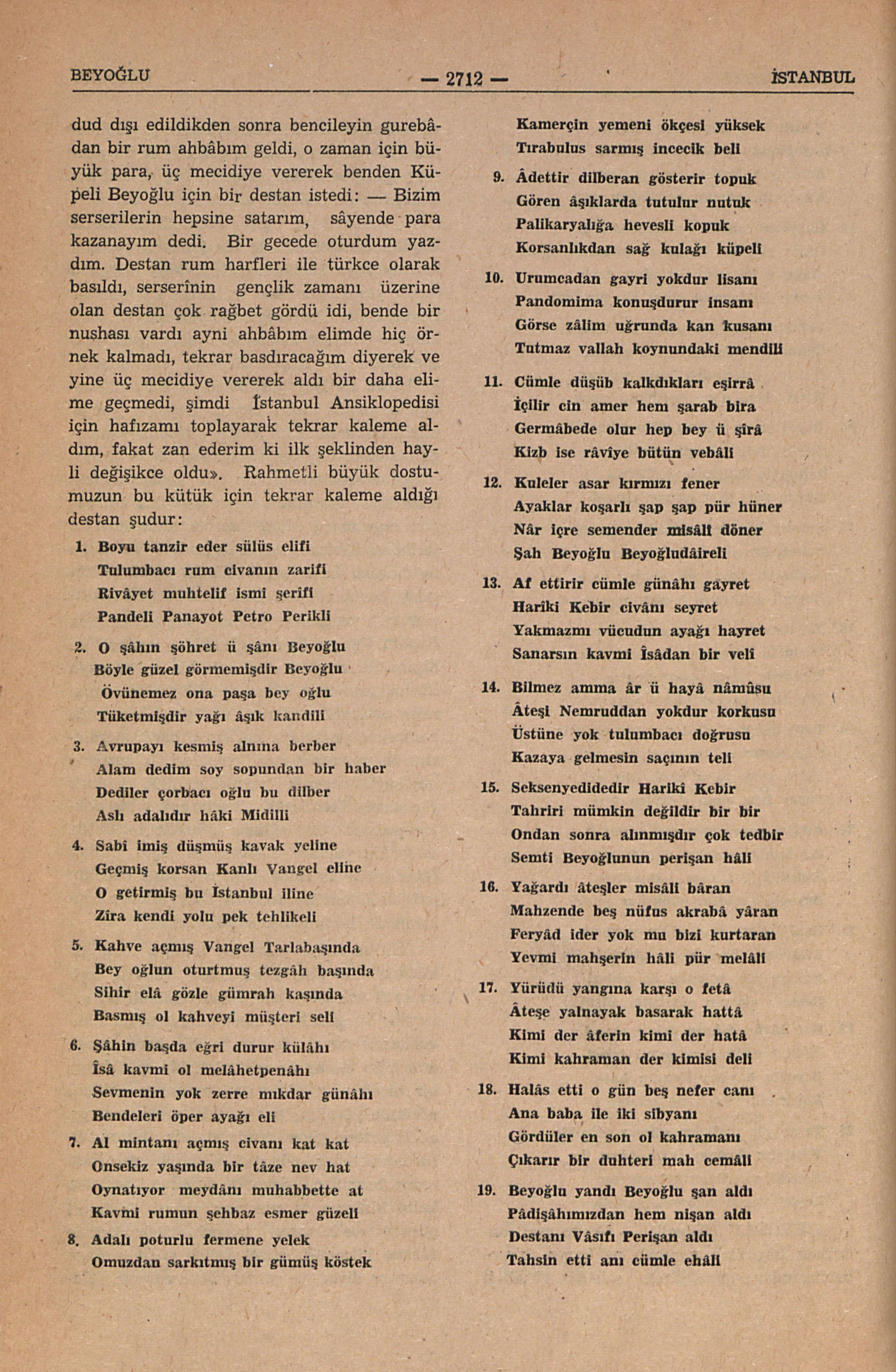 Bu serserîyi yakından tanımış olan Üsküdarlı halk şâiri Vâsıf Hoca: “Kavga, cerh ve katil vak’ası yokdu, fakat tehlikeli bir şerir idi; bir gün Kalyoncukolluğunda bir kahvehânede duvara konan iri bir kara sineği, oturduğu en az üç metroluk bir mesâfeden bir bıçak atarak duvara mıhlayıp ezdiğini gözümle gördüm; pos bıyıklı, sakalı metruş, adalı poturu giyer, temiz giyinir, tulumbacılık mümâyişi gümüş saat kösteğini yeleğinin omuz başından ilişdirip göğsüne sarkıtır, kalbi hizâsına da rumların nişan dedikleri gümüş madalyasını takardı. Tek kelime Türkçe bilmezdi, güzel fakat yüzü gülmez adamdı” diyor, ve şunları ilâve ediyor: “Hudud dışı edildikden sonra bencileyin gurebâdan bir rum ahbâbım geldi, o zaman için büyük para, üç mecidiye vererek benden Küpeli Beyoğlu için bir destan istedi: — Bizim serserilerin hepsine satarım, sâyende para kazanayım dedi. Bir gecede oturdum yazdım. Destan rum harfleri ile Türkçe olarak basıldı, serserinin gençlik zamanı üzerine olan destan çok rağbet gördü idi, bende bir nushası vardı ayni ahbâbın elimde hiç örnek kalmadı, tekrar basdıracağım diyerek ve yine üç mecidiye vererek aldı bir daha elime geçmedi, şimdi İstanbul Ansiklopedisi için hafızamı toplayarak tekrar kaleme aldım, fakat zan ederim ki ilk şeklinden hayli değişikce oldu”. Rahmetli büyük dostumun bu kütük için tekrar kaleme aldığı destan şudur: