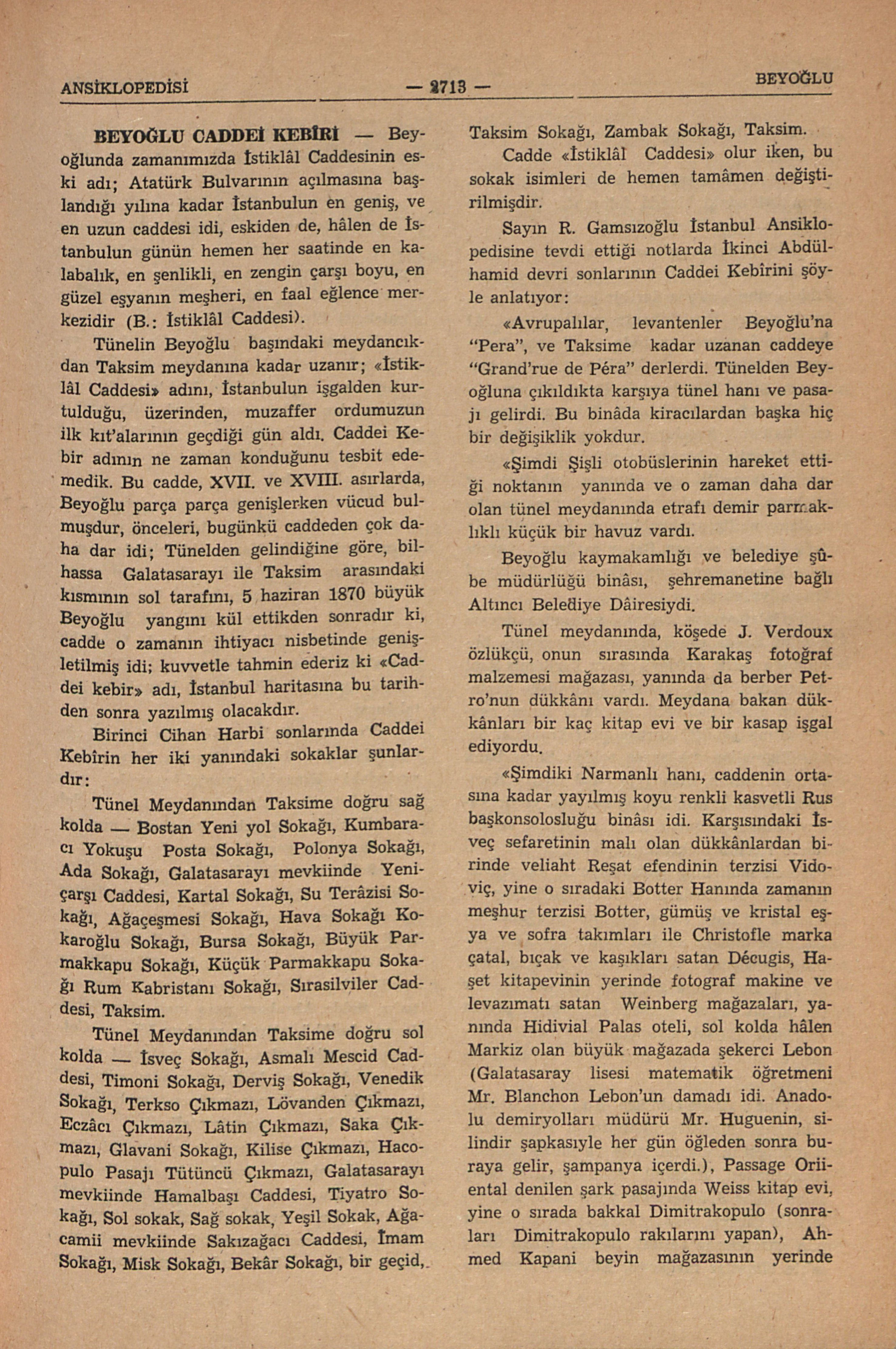 Beyoğlunda zamanımızda İstiklâl Caddesinin eski adı; Atatürk Bulvarının açılmasına başlandığı yılına kadar İstanbulun en geniş, ve en uzun caddesi idi, eskiden de, hâlen de İstanbulun günün hemen her saatinde en kalabalık, en şenlikli, en zengin çarşı boyu, en güzel eşyanın müşheri, en faal eğlence merkezidir. (B.: İstiklâl Caddesi).