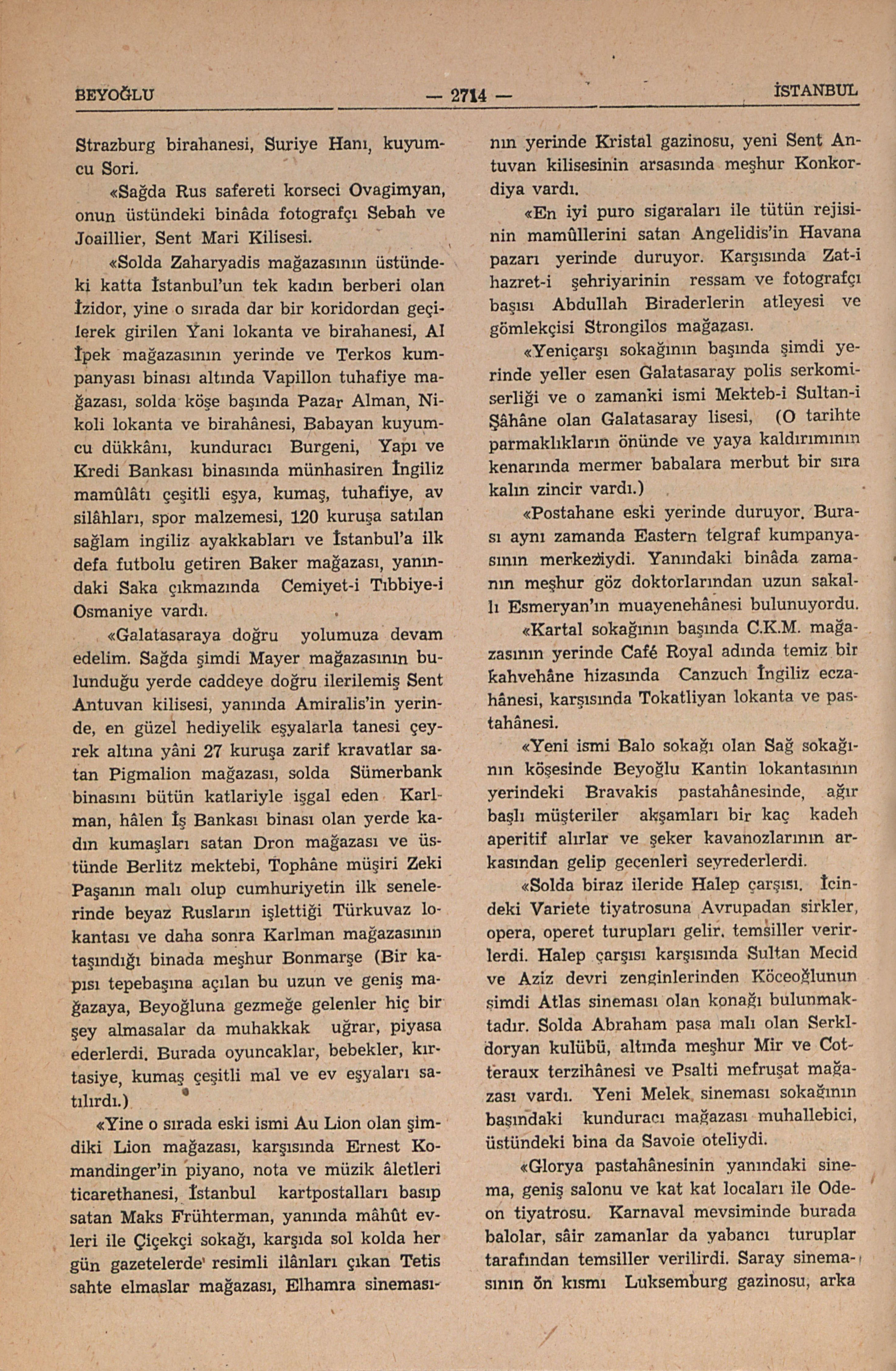 “Solda Zaharyadis mağazasının üstündeki, katta İstanbulun tek kadın berberi olan İzidor, yine o sırada, dar bir koridordan geçilerek girilen Yani lokanta ve birahânesi, Al İpek mağazasının yerinde ve Terkos kumpanyası binası altında Vapillon tuhafiye mağazası, solda köşe başında Pazar Alman, Nikoli lokanta ve birahânesi, Babayan kuyumcu dükkânı, kunduracı Burgeni, Yapı ve Kredi Bankası binasında münhasiren İngiliz mamûlâtı, çeşitli eşya, kumaş, tuhafiye ev silâhları, spor malzemesi, 120 kuruşa satılan sağlam İngiliz ayakkabıları ve İstanbula ilk defa futbolu getiren Baker mağazası, yanındaki Saka çıkmazında Cemiyet-i Tıbbiye-i Osmaniye vardı.