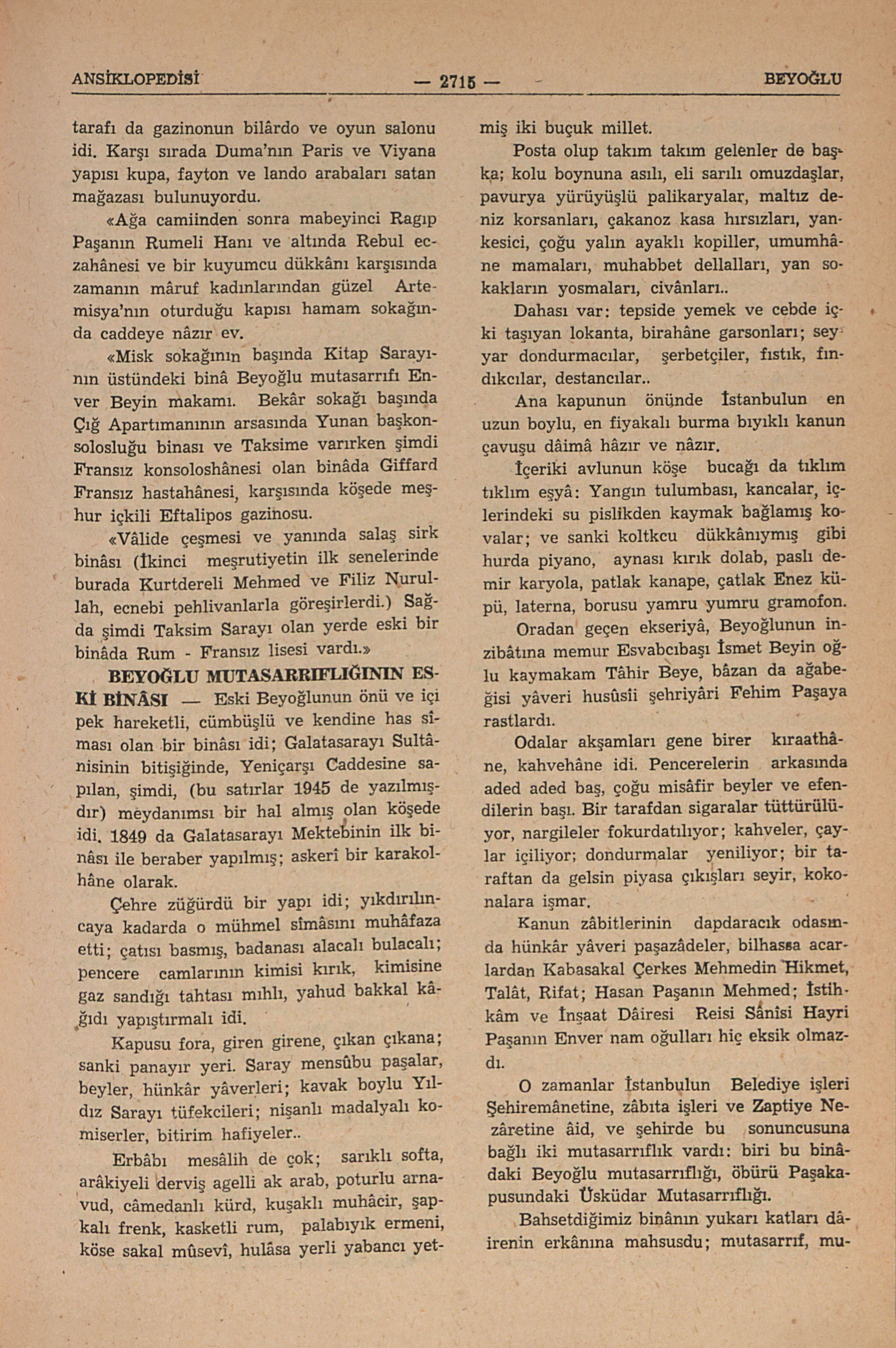 “Misk sokağının başında Kitap Sarayının üstündeki binâ Beyoğlu mutasarrıfı Enver Beyin makamı. Bekâr sokağı başında Çığ Apartımanının arsasında Yunan başkonsolosluğu binası ve Taksime varırken şimdi Fransız konsoloshânesi olan binâda Giffard hastahânesi, karşısında köşede meşhur içkili Eftalipos gazinosu.