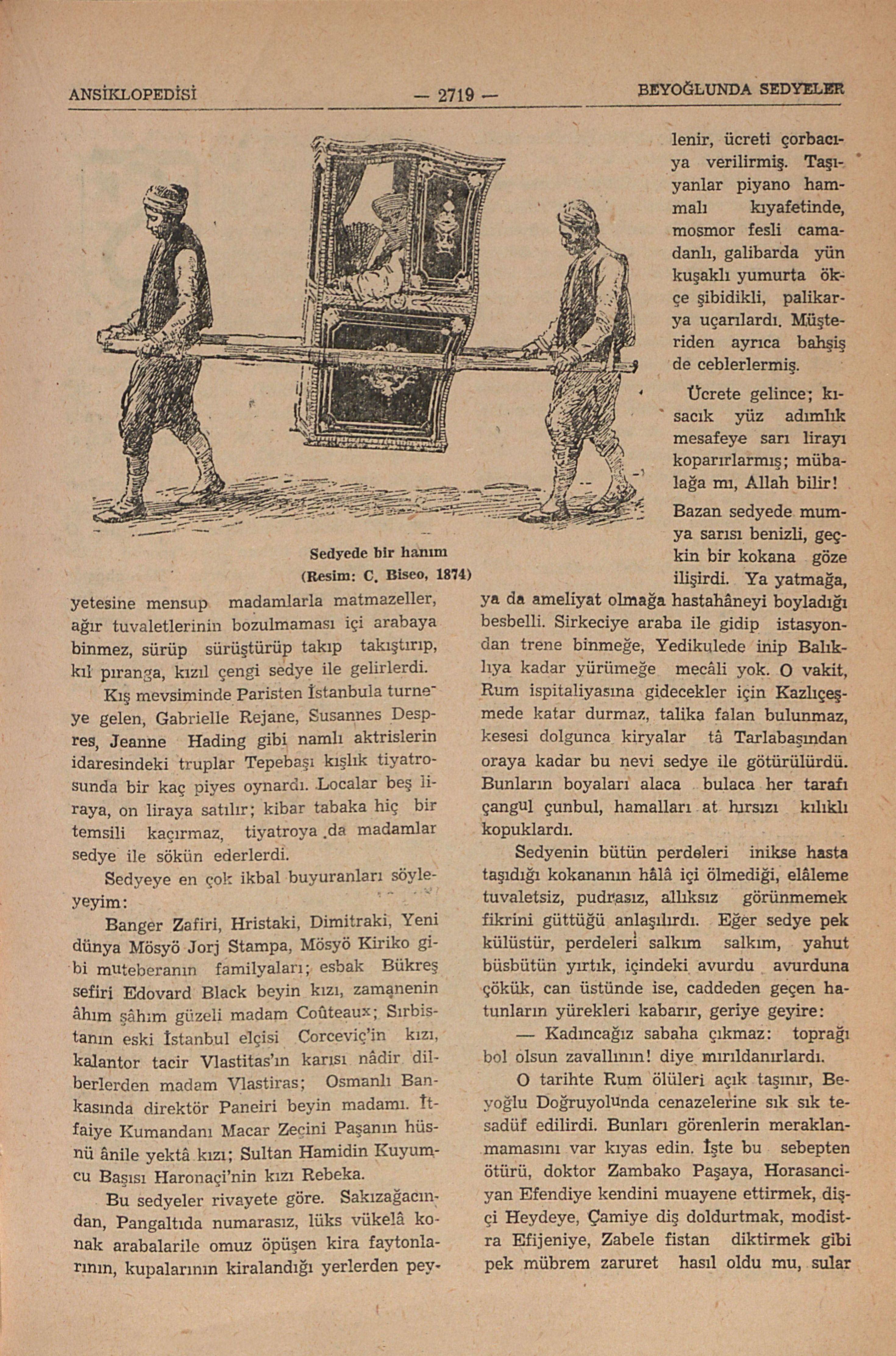 Abdülâziz zamanında İstanbulda çıkan “Musavver Medeniyet” mecmuasının 10 şubat 1290 (22 şubat 1875) tarihli nüshasında “Beyoğlunun Sedyeleri” başlıklı yazısında şu satırlar okunur: “Bu sedyeler yalnız Beyoğluna mahsustur. Dünyanın hiç bir yerinde yoktur. Kışın çamur belâsından sokaklarımızda gezmek zor olduğundan sedyeler Beyoğlu halkına hayli kolaylık vermektedir. Hele hastalar için faydası inkâr edilemez. Bunların adedi günden güne azalıyor. Araba nakil ücretlerinin ağırlığından dolayı buna rağbet çoktu, tramvay idaresinin teşkili ile zuhur eden kupa arabalarının fiatlarının itidale yakın bulunması sedyeye olan rağbeti azaltmıştır. Sedyeler hamal esnafınca haylice cesim bir ticaret metaı olduğu tarife muhtaç değildir.”