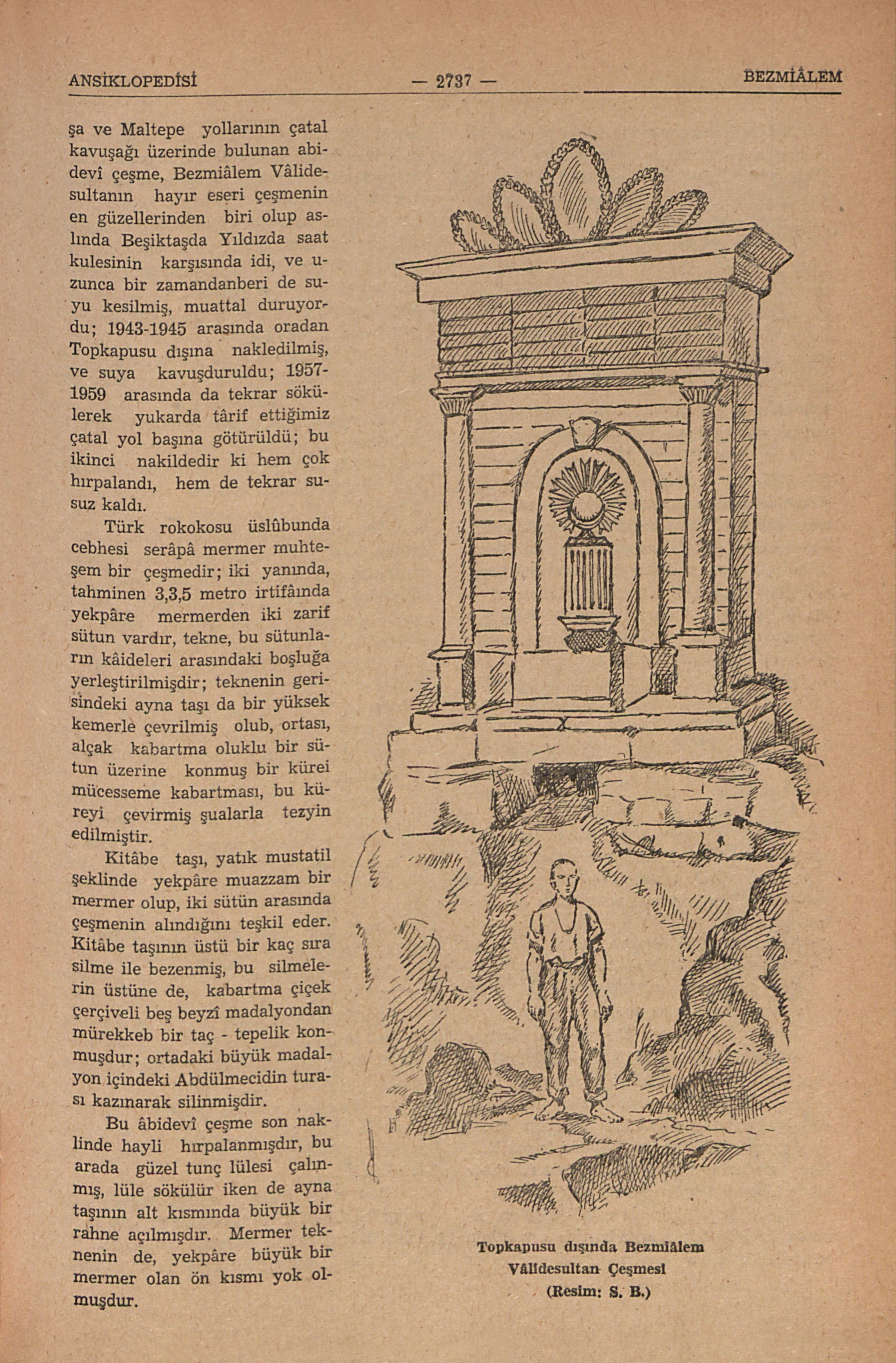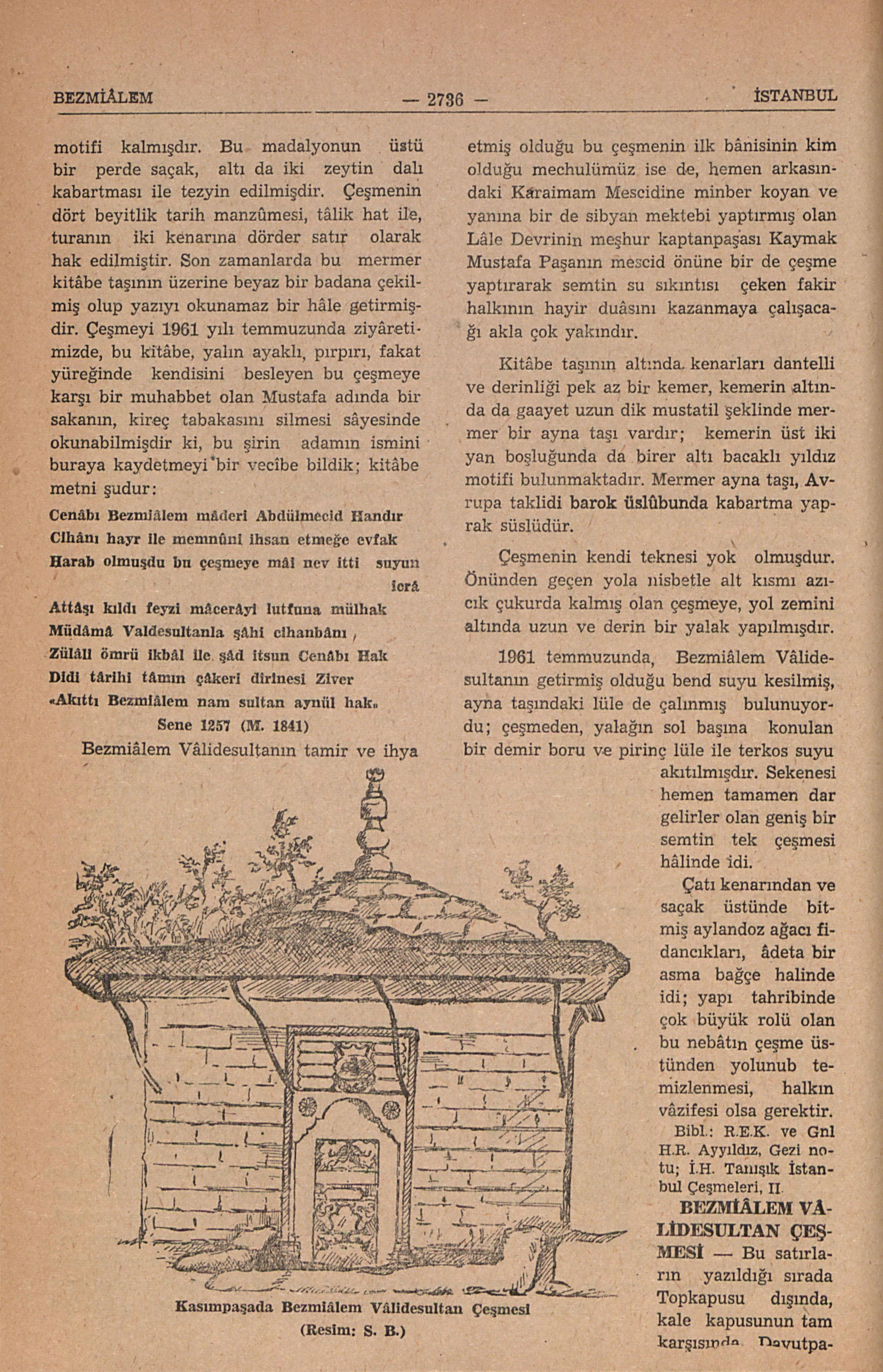 Bu satırların yazıldığı sırada Topkapusu dışında, kale kapusunun tam karşısında Davutpaşa ve Maltepe yollarının çatal kavuşağı üzerinde bulunan abidevî çeşme, Bezmiâlem Vâlidesultanın hayır eseri çeşmenin en güzellerinden biri olup aslında Beşikdaşda Yıldızda saat kulesinin karşısında idi, ve uzunca bir zamandanberi de suyu kesilmiş, muattal duruyordu; 1943-1945 arasında oradan Topkapusu dışına nakledilmiş, ve suya kavuşduruldu; 1957-1959 arasında da tekrar sökülerek yukarda târif ettiğimiz çatal yol başına götürüldü; bu ikinci nakildedir ki hem çok hırpalandı, hem de tekrar susuz kaldı.