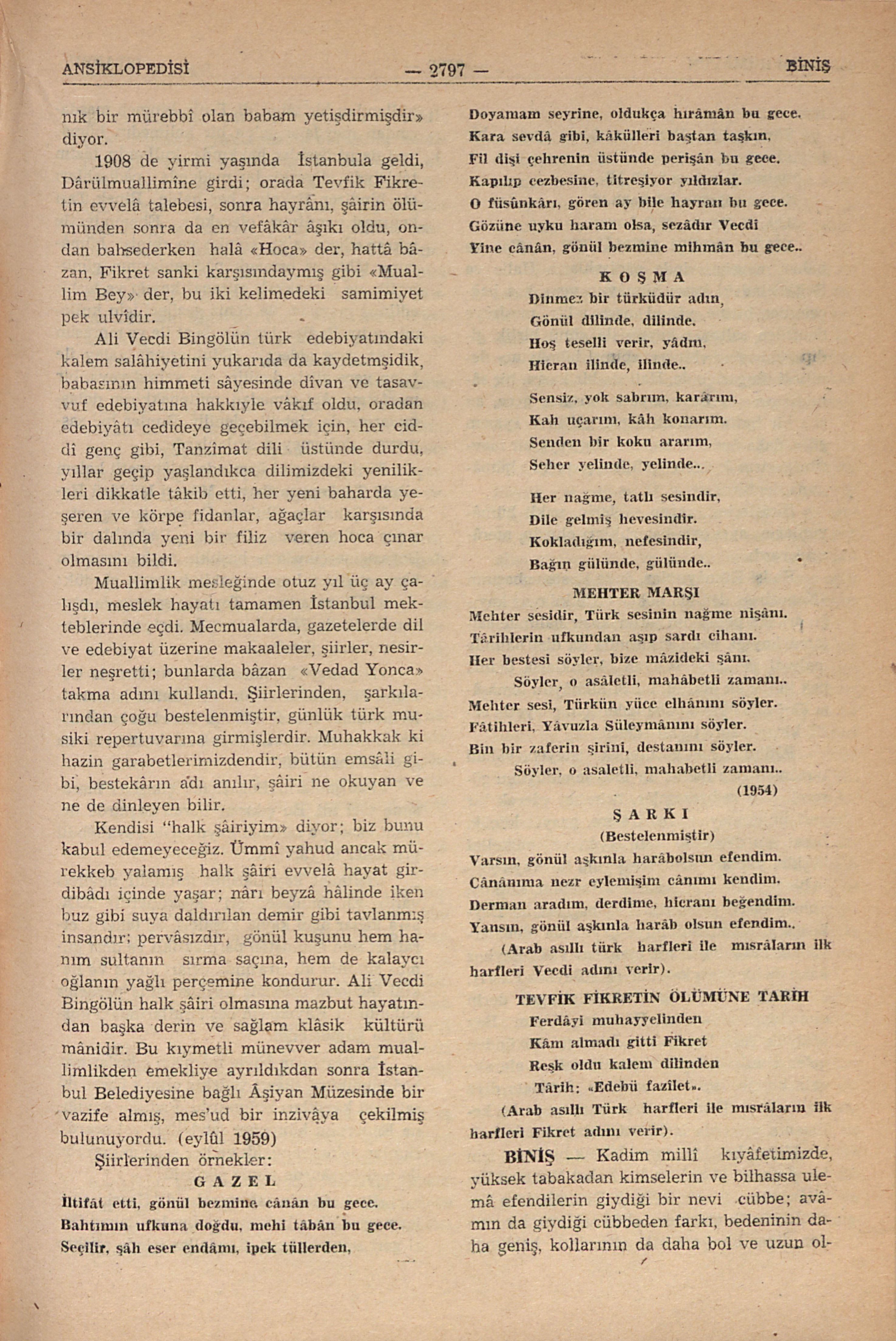 Kendisi “halk şâiriyim” diyor; biz bunu kabul edemeyeceğiz. Ümmî yahud ancak mürekkeb yalamış halk şâiri evvelâ hayat girdibâdı içinde yaşar; nârı beyzâ hâlinde iken buz gibi suya daldırılan demir gibi tavlanmış insandır; pervâsızdır, gönül kuşunu hem hanım sultanın sırma saçına, hem de kalaycı oğlanın yağlı perçemine kondurur. Ali Vecdi Bingölün halk şâiri olmasına mazbut hayatından başka derin ve sağlam klâsik kültürü mânidir. Bu kıymetli münevver adam muallimlikden emekliye ayrıldıkdan sonra İstanbul belediyesine bağlı Âşiyan Müzesinde bir vazife almış, mes’ud bir inzivâya çekilmiş bulunuyordu. (eylûl 1959).