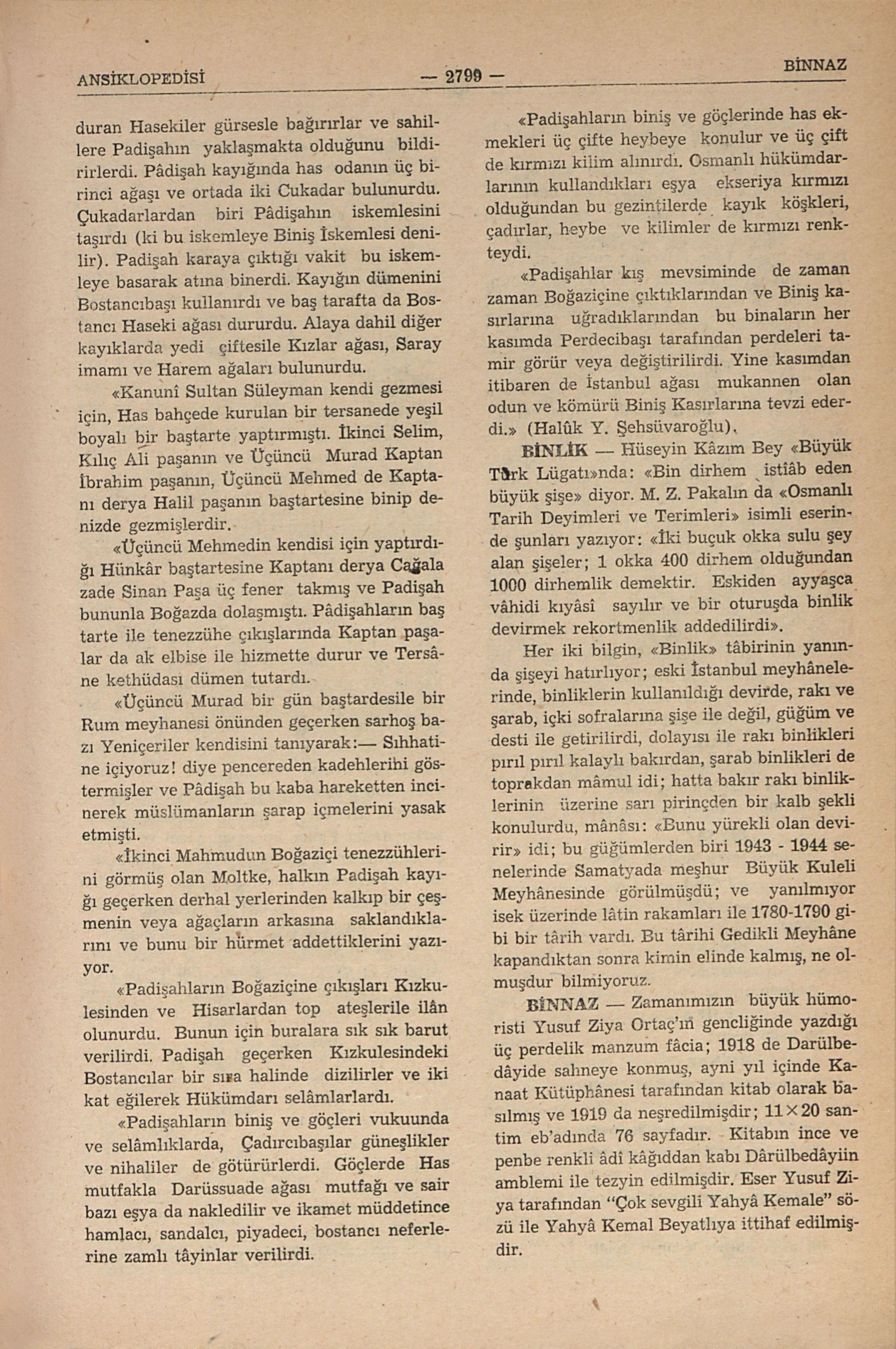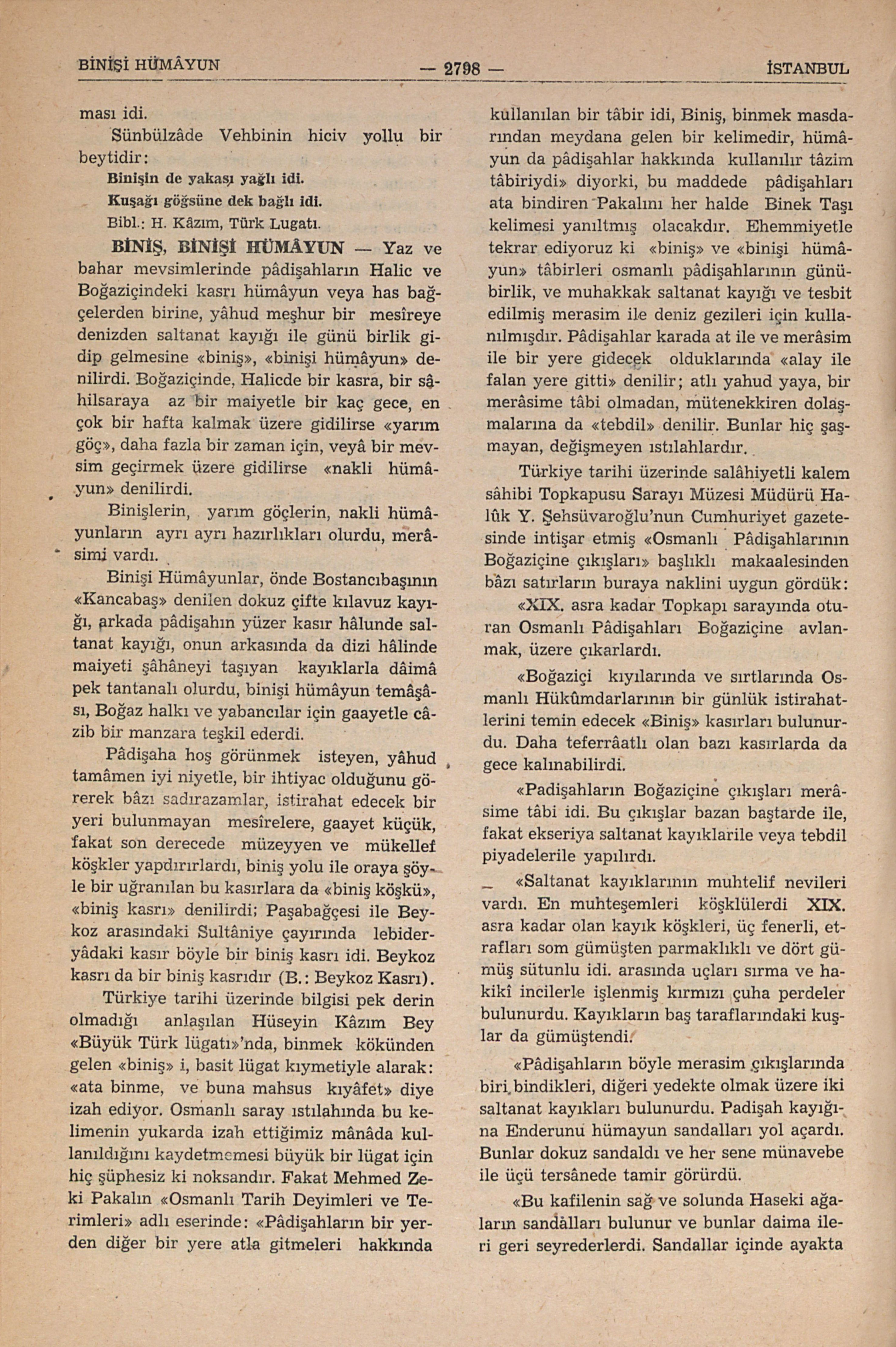 Türkiye tarihi üzerinde bilgisi pek derin olmadığı anlaşılan Hüseyin Kâzım Bey “Büyük Türk Lûgatı”nda, binmek kökünden gelen “biniş” i, basit lügat kıymetiyle alarak: “ata binme, ve buna mahsus kıyâfet” diye izah ediyor. Osmanlı saray ıstılahında bu kelimenin yukarda izah ettiğimiz mânâda kullanıldığını kaydetmemesi büyük bir lügat için hiç şüphesiz ki noksandır. Fakat Mehmetd Zeki Pakalın “Osmalı Tarih Deyimleri ve Terimleri” adlı eserinde: “Pâdişahların bir yerden diğer bir yere atla gitmeleri hakkında kullanılan bir tâbir idi. Biniş, binmek masdarından meydana gelen bir kelimedir, hümâyun da pâdişahlar hakkında kullanılır tâzim tâbiriydi” diyorki, bu maddede pâdişahları ata bindiren Pakalın her halde Binek Taşı kelimesi yanıltmış olacakdır. Ehemmiyetle tekrar ediyoruz ki “biniş” ve “binişi hümâyun” tâbirleri osmanlı pâdişahlarının günübirlik, ve muhakkak saltanat kayığı ve tesbit edilmiş merasim ile deniz gezileri ile kullanılmışdır. Pâdişahlar karada at ile ve merâsim ile bir yere gidecek olduklarında “alay ile falan yere gitti” denilir; atlı yahud yaya, bir merâsime tâbi olmadan, mütenekkiren dolaşmalarına da “tebdil” denilir. Bunlar hiç şaşmayan, değişmeyen ıstılahlardır.