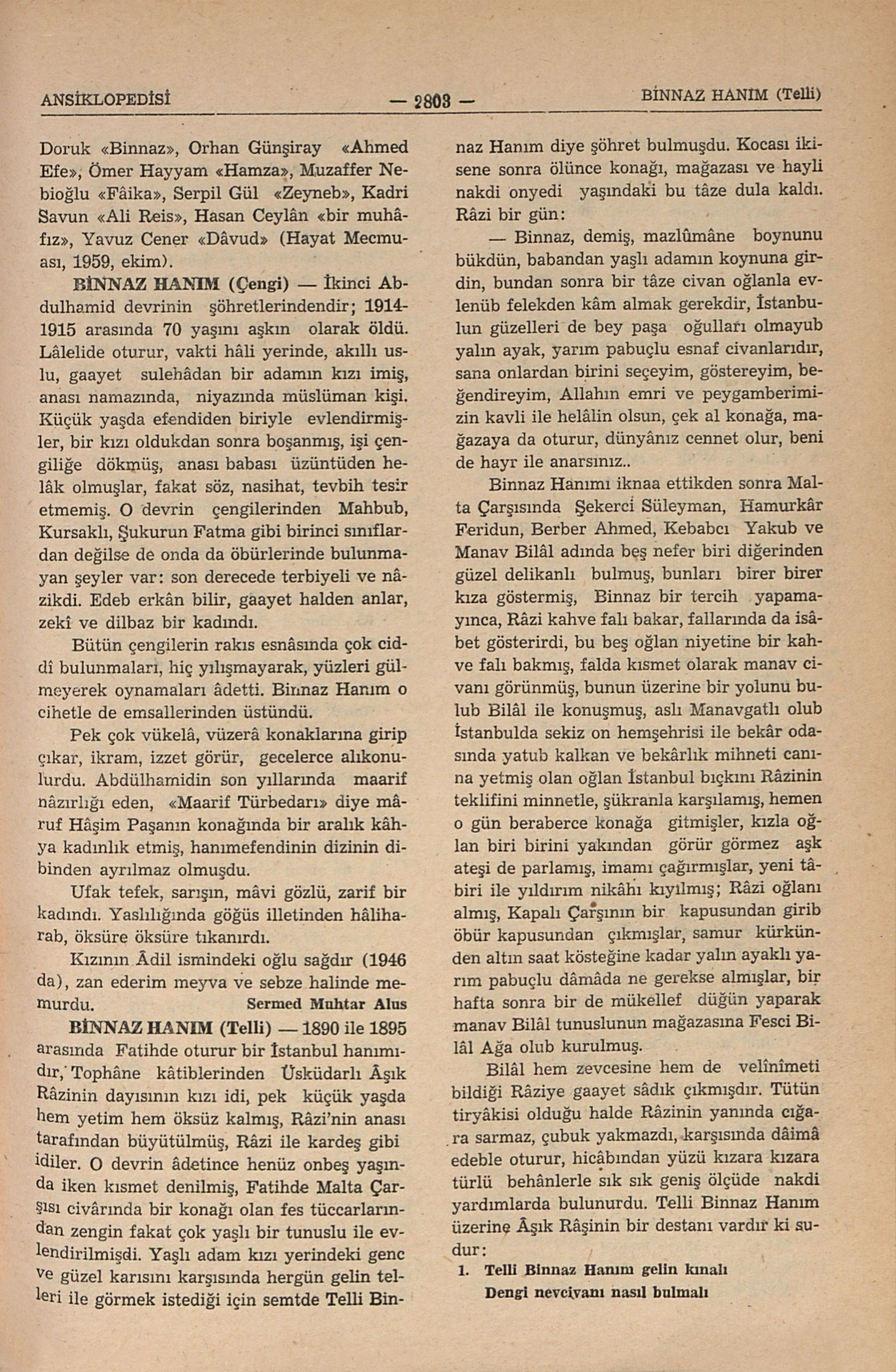 1890 ile 1895 sırasında Fatihde oturur bir İstanbul hanımıdır, Tophâne kâtiblerinden Üsküdarlı Âşık Râzi’nin dayısının kızı idi, pek küçük yaşda hem yetim hem öksüz kalmış, Râzi’nin anası tarafından büyütülmüş Râzi ile kardeş gibiydiler. O devrin âdetince henüz onbeş yaşındayken kısmet denilmiş, Fatihde Malta Çarşısı civârında bir konağı olan fes tüccarlarından zengin fakat çok yaşlı bir tunuslu ile evlendirilmişdi. Yaşlı adam kızı yerindeki genc güzel karısını karşısında hergün gelin telli ile görmek istediği icin semtde Telli Binnaz Hanım diye şöhret bulmuşdu. Kocası iki sene sonra ölünce konağı, mağazası ve hayli nakdi onyedi yaşındaki bu tâze dula kaldı. Râzi bir gün:
