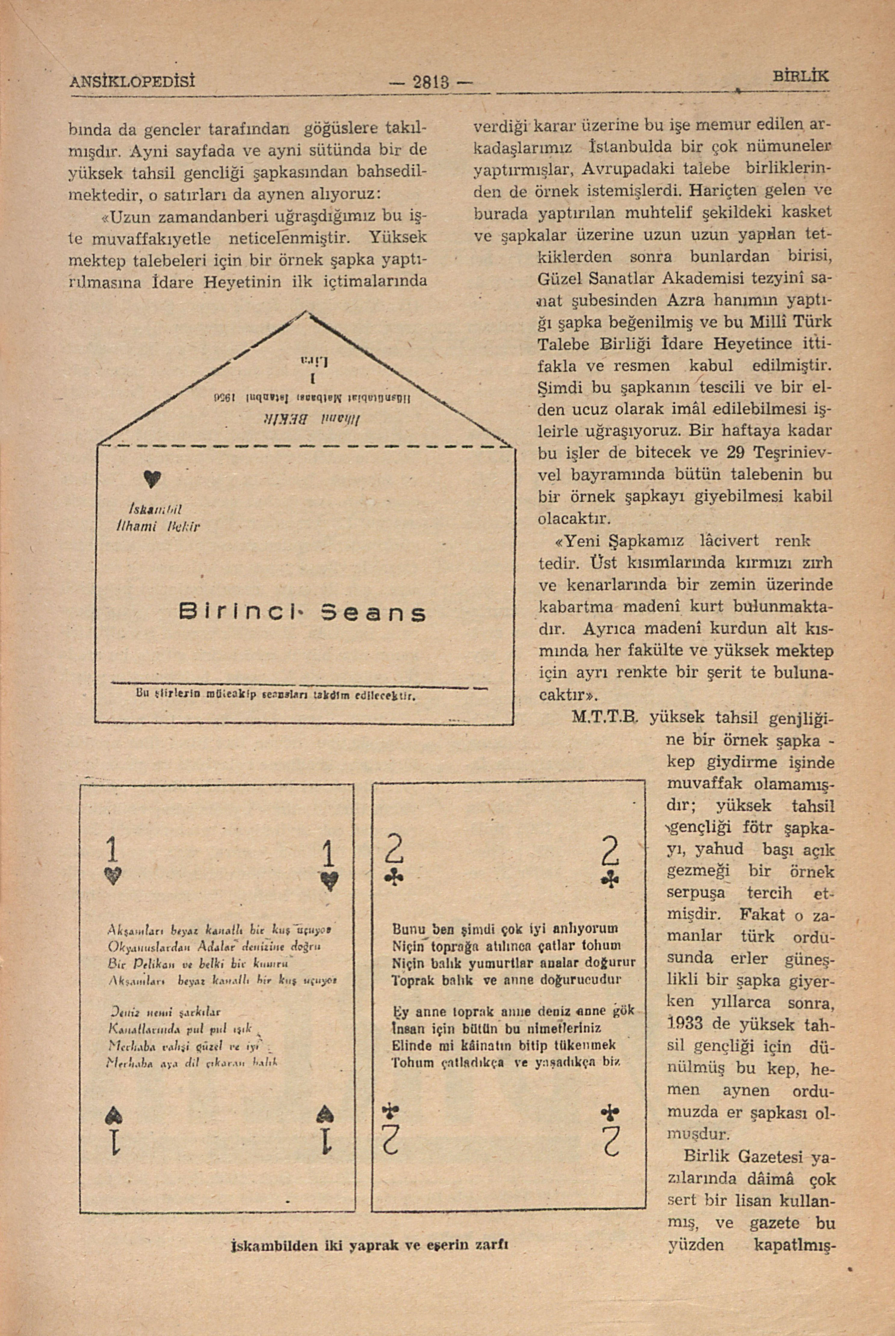 Arma yaşamamıştır, zamanımızda da M.T.T.B. ini temsil eder, ve hattâ 27 mayıs inkilâbında da gencler tarafından göğüslere takılmışdır. Ayni sayfada ve ayni sütunda bir de yüksek tahsil gencliği şapkasından bahsedilmektedir, o satırları da aynen alıyoruz: