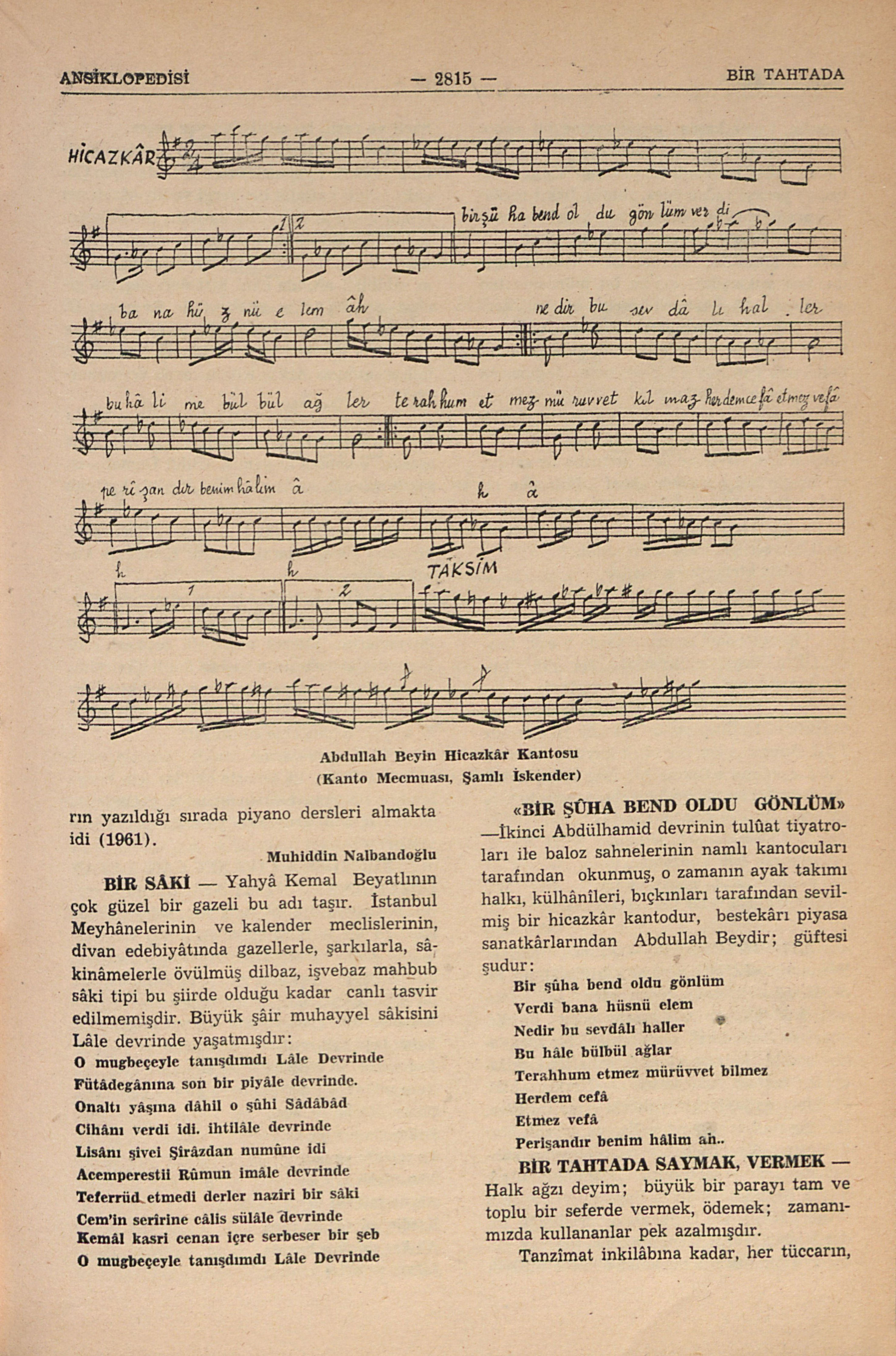 İkinci Abdülhamid devrinin tuluât tiyatroları ile baloz sahnelerinin namlı kantocuları tarafından okunmuş, o zamanın ayak takımı halkı, külhânîleri, bıçkınları tarafından sevilmiş bir hicazkâr kantodur, bestekârı piyasa sanatkârlarından Abdullah Beydir; güftesi şudur: