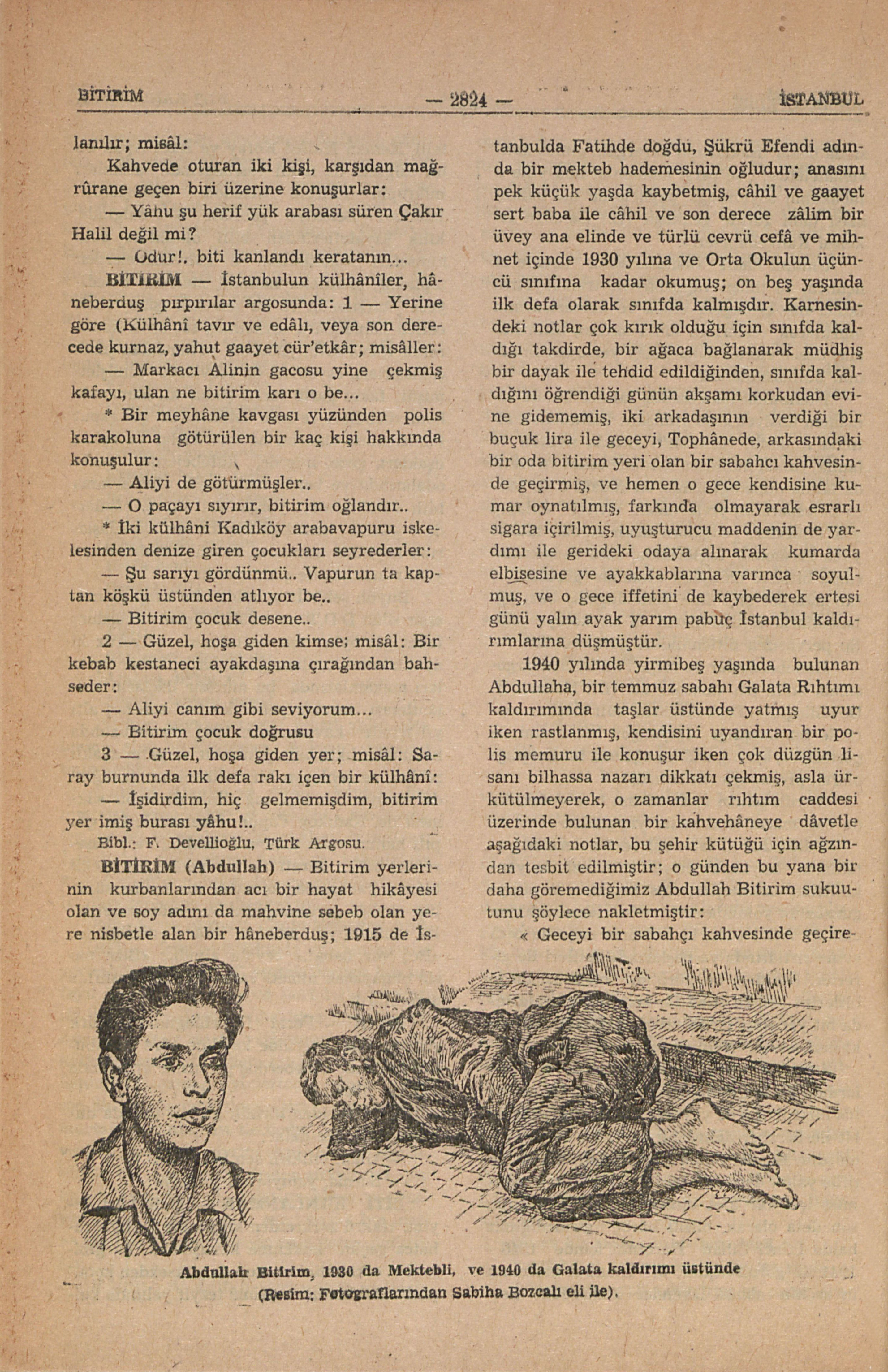 1940 yılında yirmibeş yaşında bulunan Abdullaha, bir temmuz sabahı Galata Rıhtımı kaldırımında taşlar üstünde yatmış uyur iken rastlanmış, kendisini uyandıran bir polis memuru ile konuşur iken çok düzgün lisanı bilhassa nazarı dikkatı çekmiş, asla ürkütülmeyerek, o zamanlar rıhtım caddesi üzerinde bulunan bir kahvehâneye dâvetle aşağıdaki notlar, bu şehir kütüğü için ağzından tesbit edilmişdir; o günden bu yana bir daha göremediğimiz Abdullah Bitirim sukuutunu şöylece nakletmiştir: