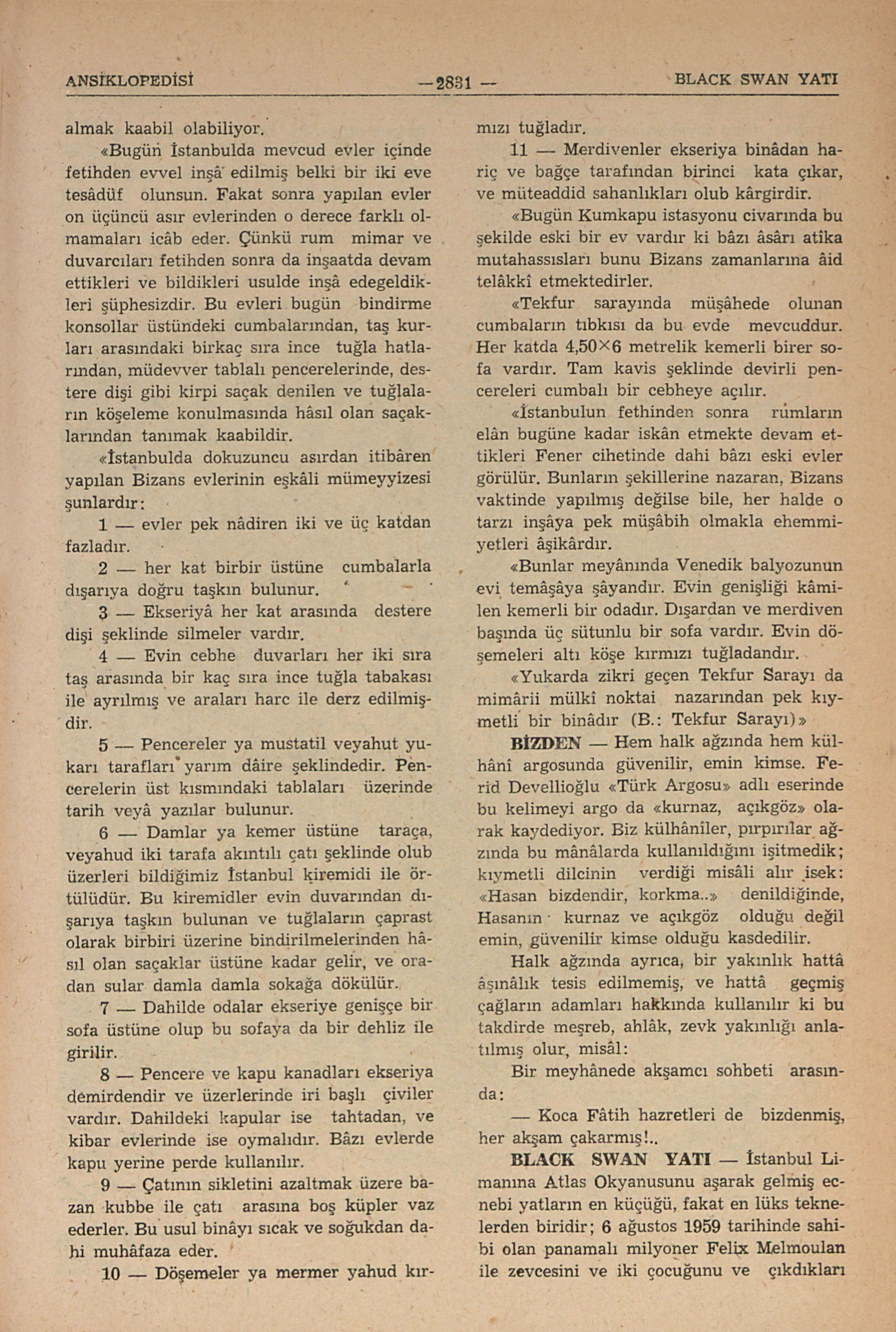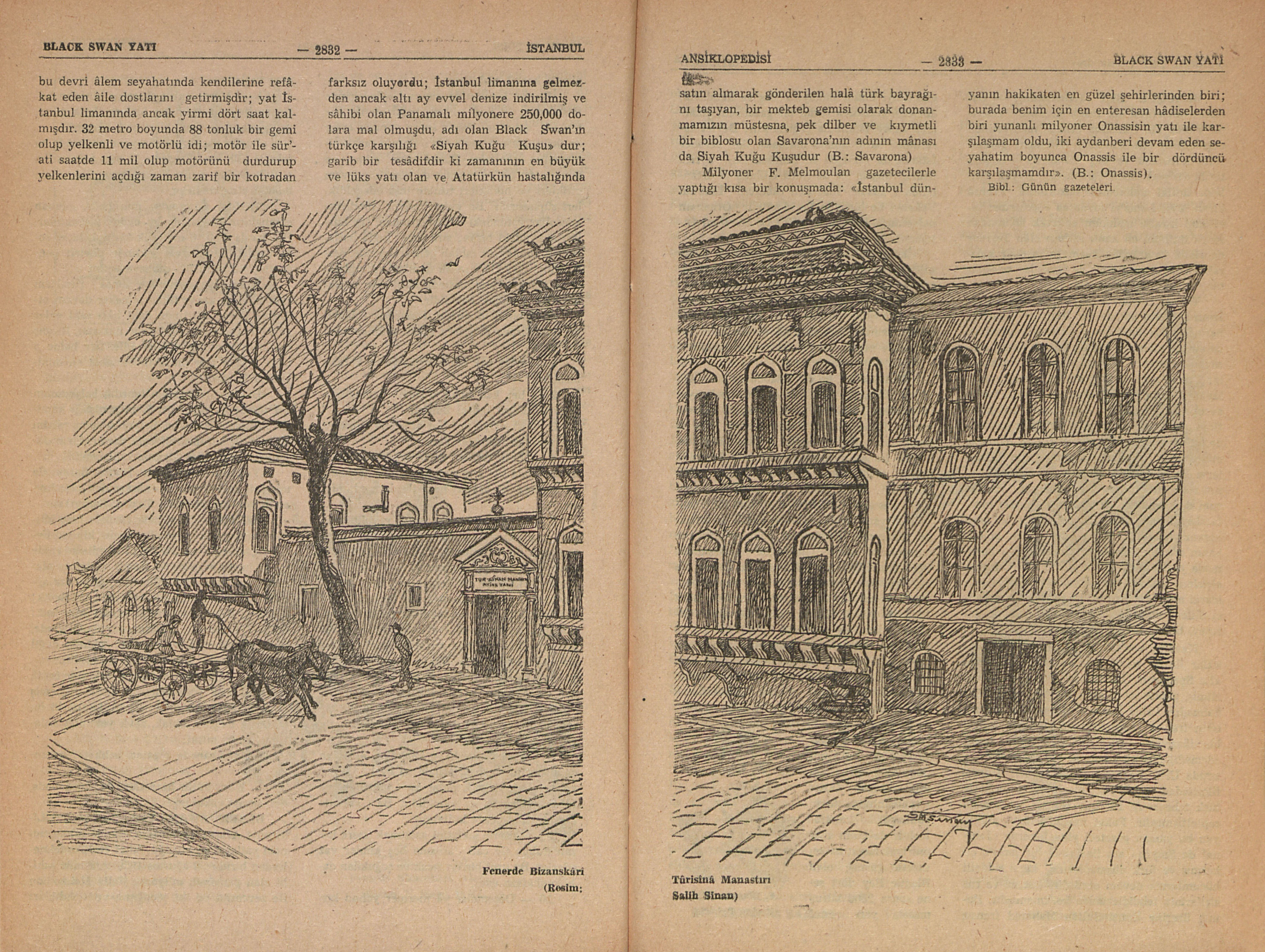İstanbul Limanına Atlas Okyanusuna aşarak gelmiş ecnebi, yatların en küçüğü, fakat en lüks teknelerden biridir; 6 ağustos 1959 tarihinde sahibi olan panamalı milyoner Felix Melmoulan ile zevcesini ve iki çocuğunu ve çıkdıkları bu devri âlem seyahatında kendilerine refâkat eden âile dostlarını getirmişdir; yat İstanbul limanında ancak yirmi dört saat kalmışdır. 32 metro boyunda 88 tonluk bir gemi olup yelkenli ve motörlü idi; motör ile sür’ati saatde 11 mil olup motörünü durdurup yelkenlerini açdığı zaman zarif bir kotradan farksız oluyordu; İstanbul limanına gelmezden ancak altı ay evvel denize indirilmiş ve sâhibi olan Panamalı milyonere 250,00 dolara mal olmuşdu, adı olan Black Swan’ın türkçe karşılığı “Siyah Kuğu Kuşu”dur; garib bir tesâdifdir ki zamanının en büyük ve lüks yatı olan ve Atatürkün hastalığında satın alınarak gönderilen halâ türk bayrağını taşıyan, bir mekteb gemisi olarak donanmamızın müstesna, pek dilber ve kıymetli bir biblosu olan Savarona’nın adının mânası da Siyah Kuğu Kuşudur. (B.: Savarona)