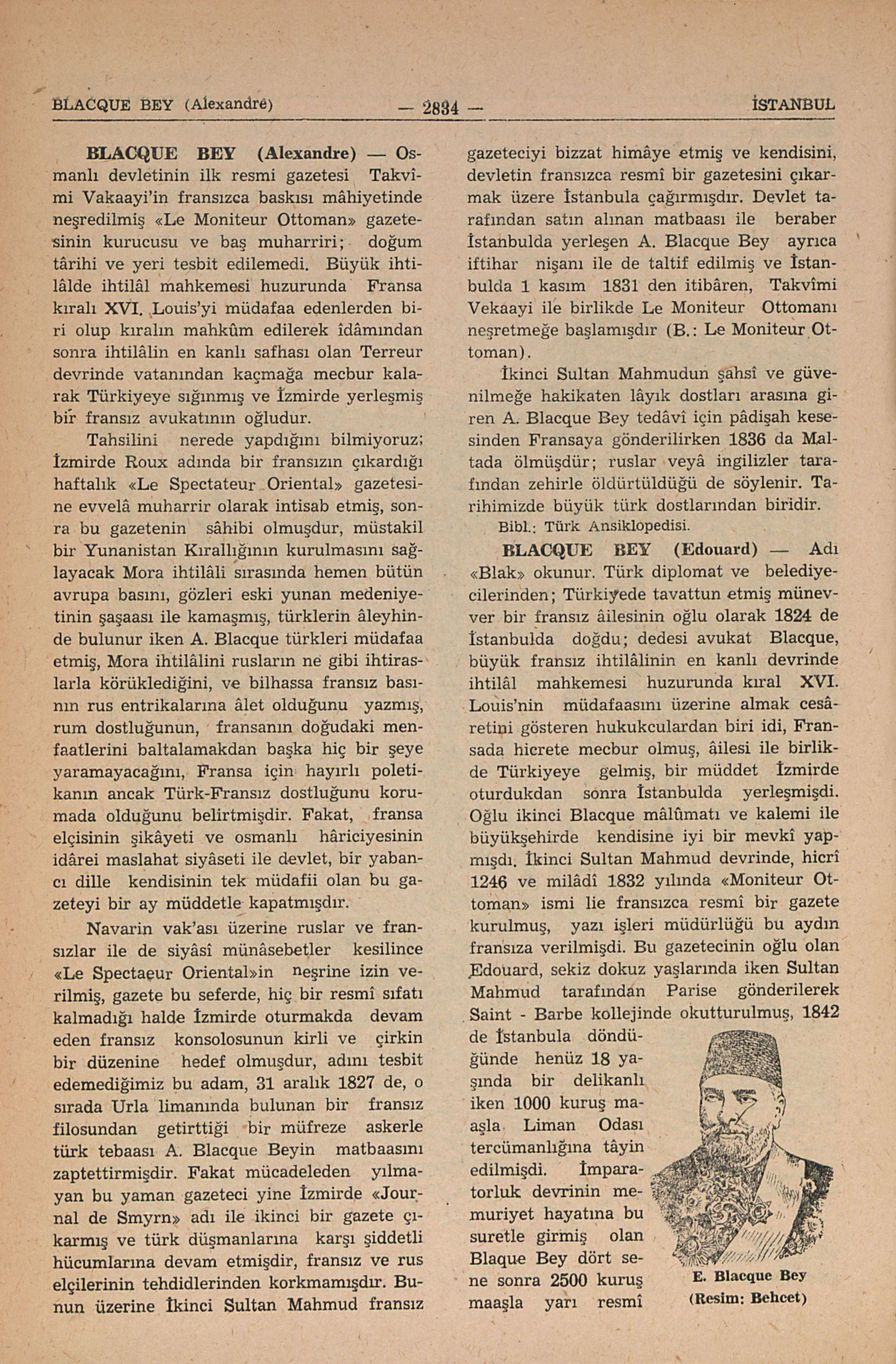 İkinci Sultan Mahmudun şahsî ve güvenilmeğe hakikaten lâyık dostları arasına giren A. Blacque Bey tedâvi için pâdişah kesesinden Fransaya gönderilirken 1836 da Maltada ölmüşdür; ruslar veyâ ingilizler tarafından zehirle öldürüldüğü de söylenir. Tarihimizde büyük türk dostlarından biridir.