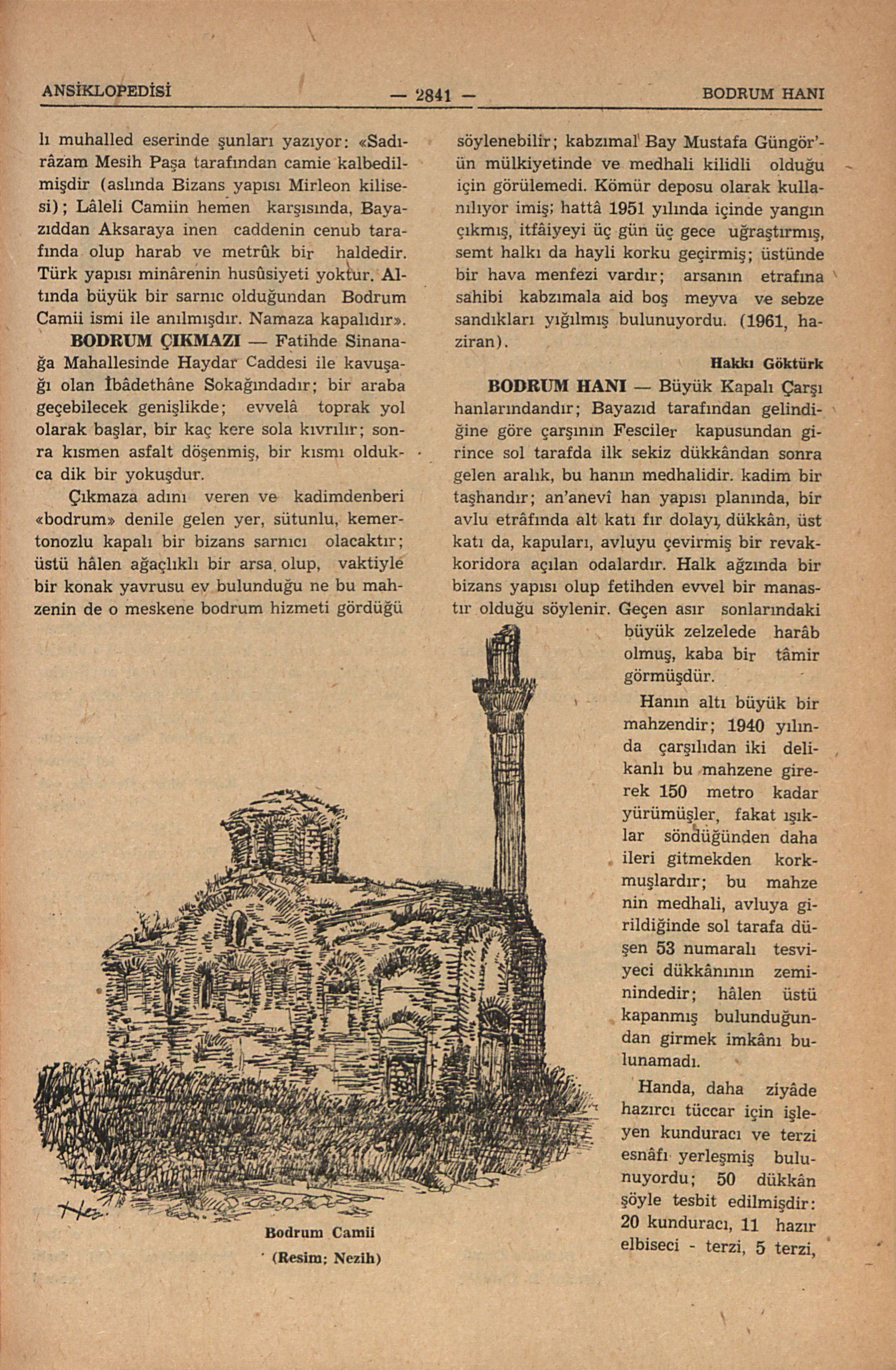 Hanın altı büyük bir mahzendir; 1940 yılında çarşıdan iki delikanlı bu mahzene girerek 150 metro kadar yürümüşler, fakat ışıklar söndüğünden daha ileri gitmekden korkmuşlardır; bu mahzenin medhali, avluya girildiğinde sol tarafa düşen 53 numaralı tesviyeci dükkânının zeminindedir; hâlen üstü kapanmış bulunduğundan girmek imkânı bulunamadı.