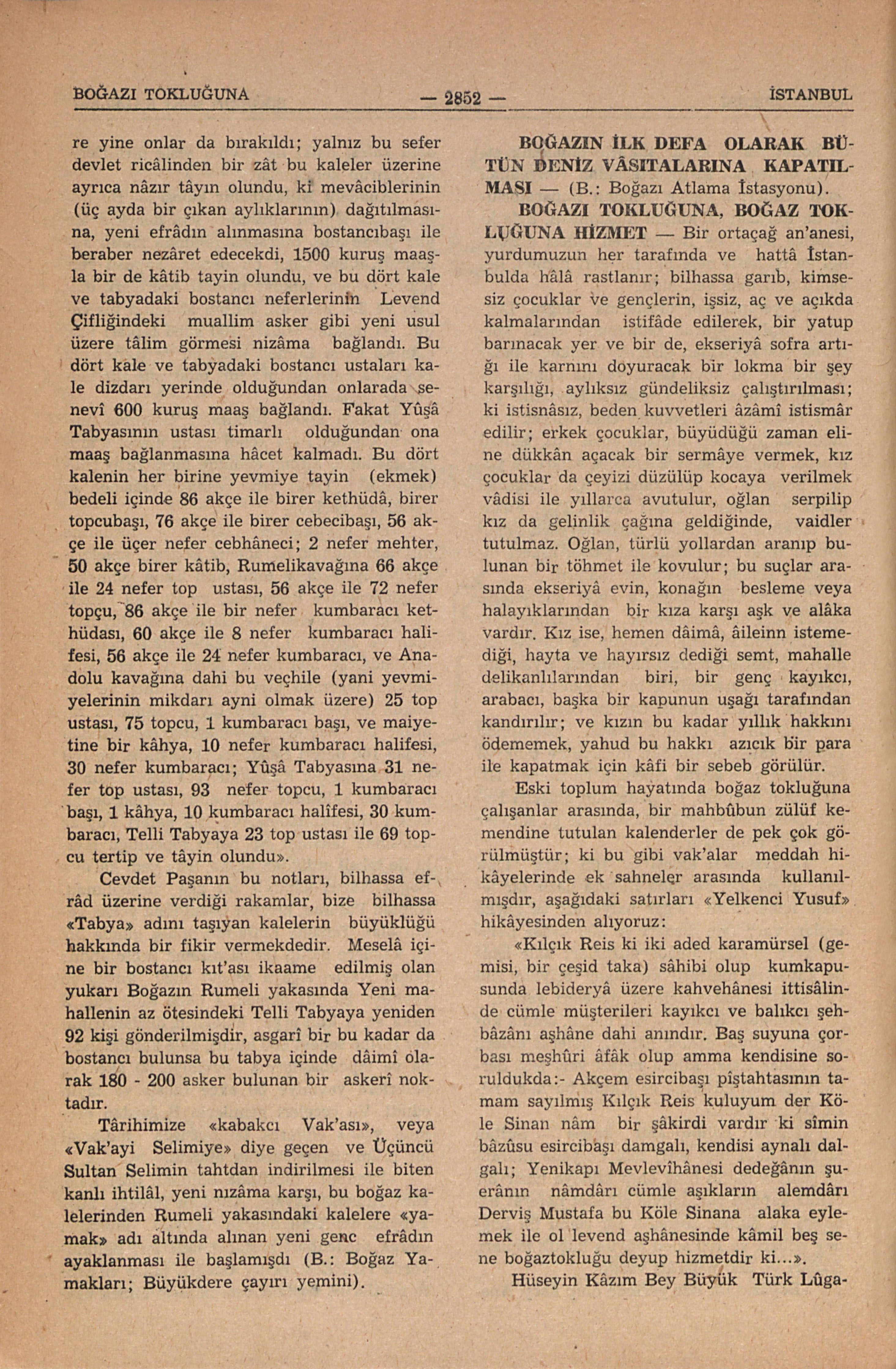 Hüseyin Kâzım Bey Büyük Türk Lûgatına: “Boğazı tokluğuna hizmet, parasız pulsuz himmet, nerede bu bolluk!..” deyimini kaydediyor: Sânizâde tarihinden de şu cümleyi alıyor: “Zuefâyi ameleyi hemenboğazı tokluğuna gibi çalışdırmağı bayağı bî muhâbâ âdet etmiş olduklarına binâen....”