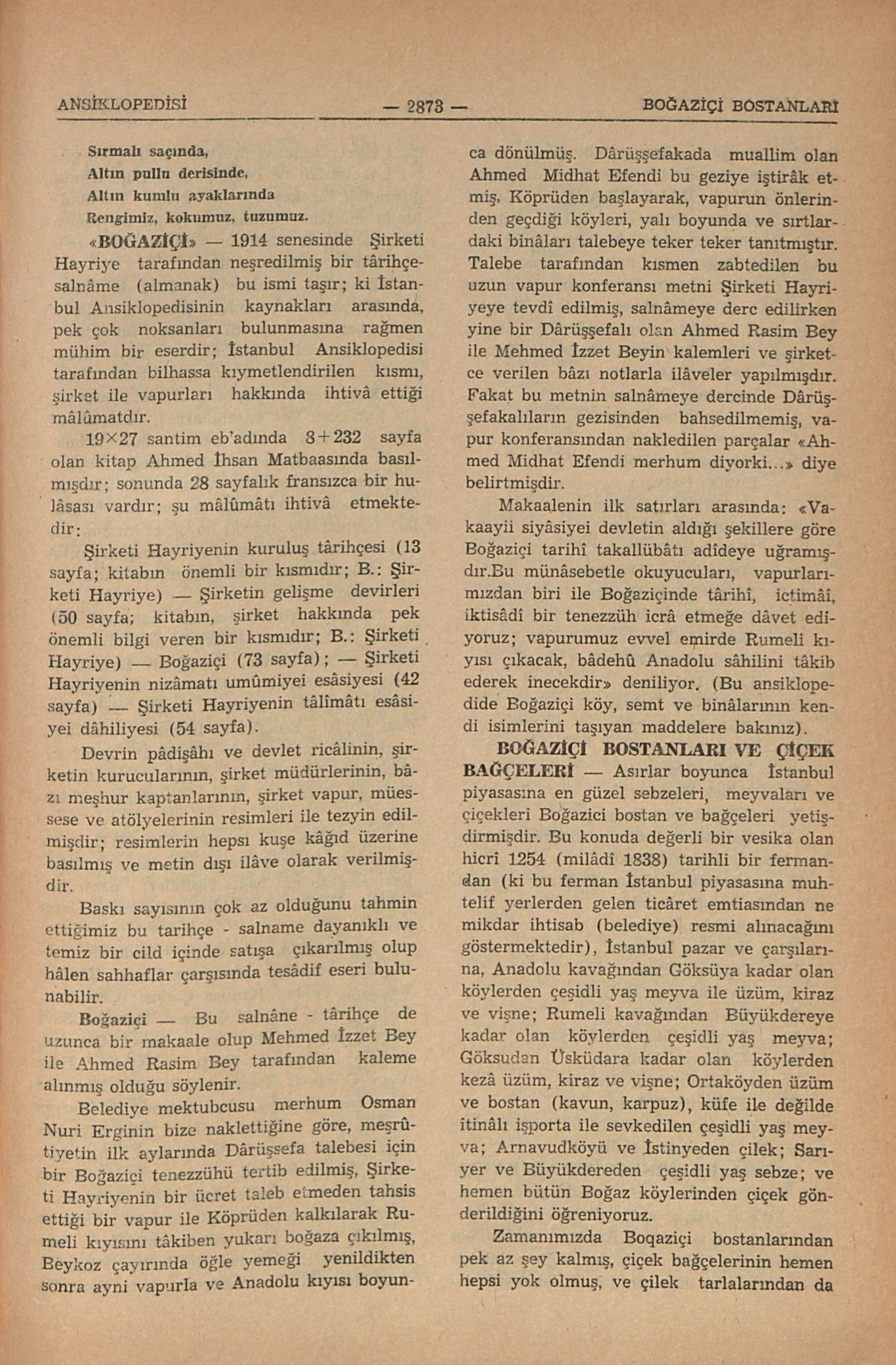 1914 senesinde Şirketi Hayriye tarafından neşredilmiş bir târihçesalnâme (almanak) bu ismi taşır; ki İstanbul Ansiklopedisinin kaynakları arasında, pek çok noksanları bulunmasına rağmen mühim bir eserdir; İstanbul Ansiklopedisi tarafından bilhassa kıymetlendirilen kısmı, şirket ile vapurları hakkında ihtivâ ettiği mâlûmatdır.