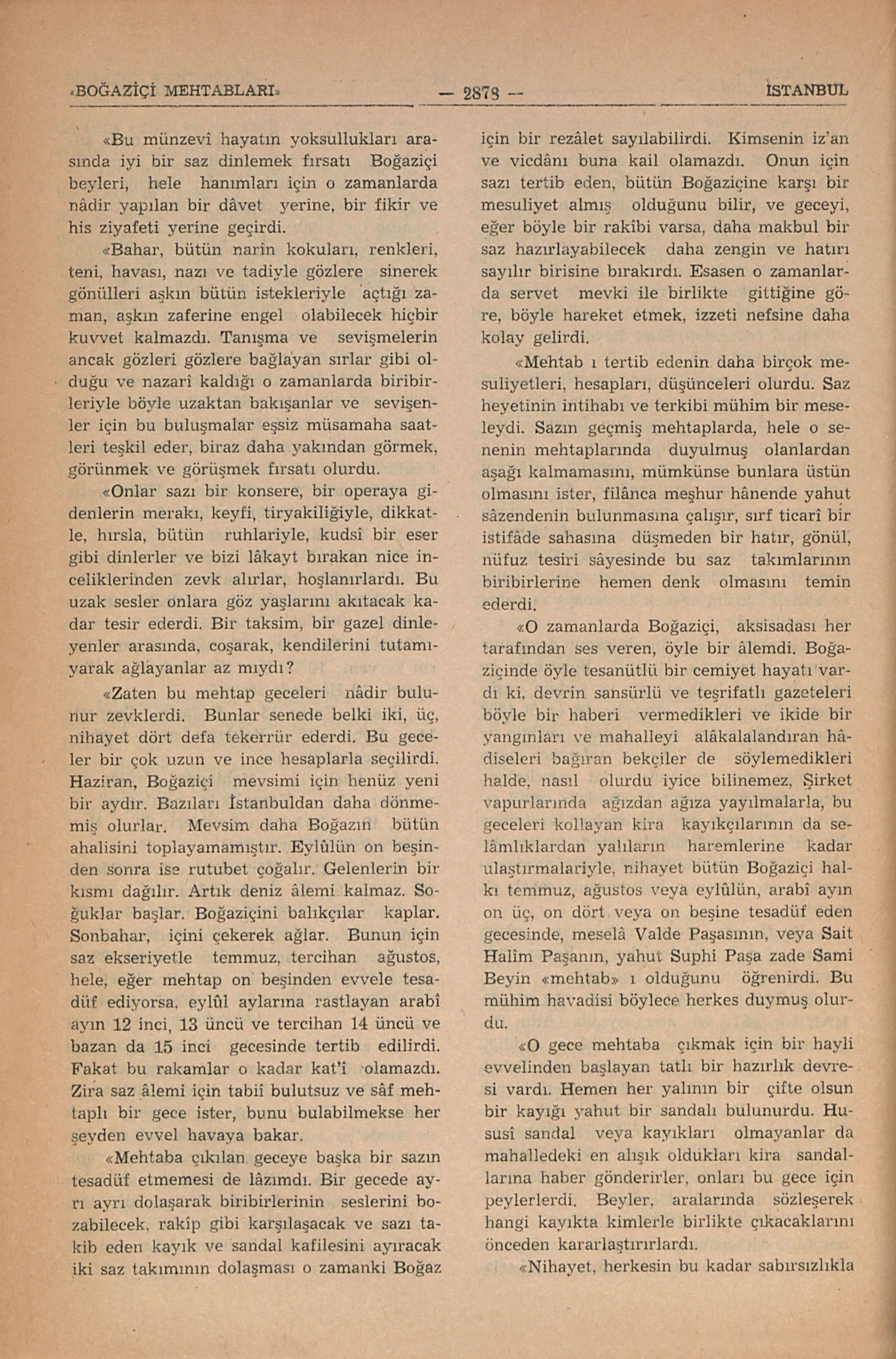 “Mehtap âlemiyle bütün Boğaziçinin çalkanmasına rağmen bu gecenin bir saz gecesi olacağını mutlaka herkes işitmiş olamazdı. Fakat saz Boğaziçinin geçerken herkes tarafından duyulur, ve bunu tâ uykuları içinde rûyalarında eski zevklerini dâvetleri sananlar, uykularından uyanarak gönüllerinin ezeli âşinası olan bu peri ve deniz kızı seslerinin dâvetlerine koşmak isterlerdi. Gençler bu umulmadık zevk haberiyle hemen yataklarından fırlarlar, acele acele giyinerek kayıkhanelere inerler, sandallarının bir hamlede suya indirirler ve evdekilerini de gezintiye teşvik ederlerdi.