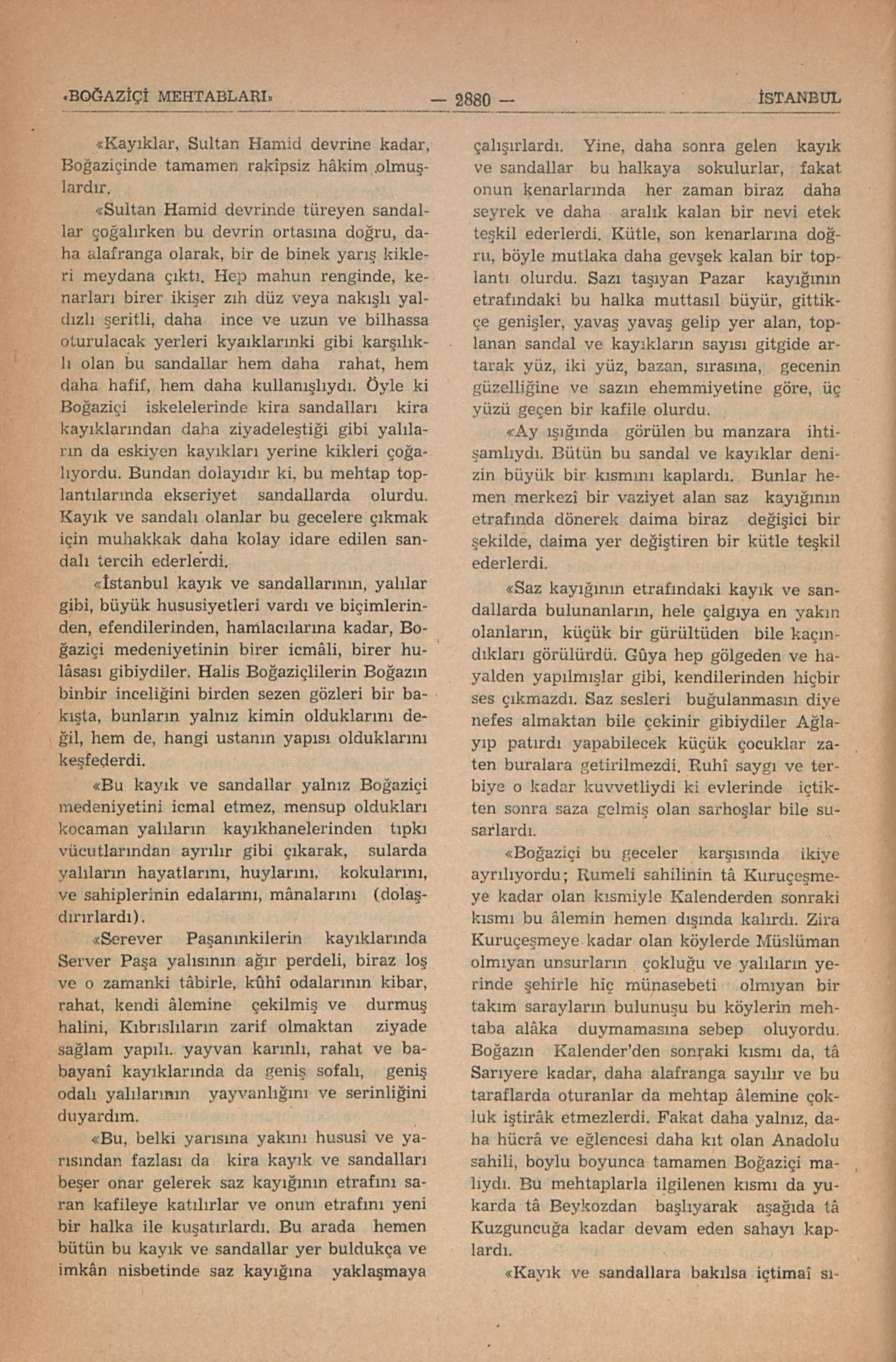 “Bu sandal ve kayık kervanı, Boğaziçinde, bir taraftan aşağıya veya yukarıya doğru devam eden doğru gidişinin yanında, diğer taraftan, gûya bir topaç gibi, etrafında döndüğü hissini veren bir harekette de bulunurdu. Zira bütün kafile muntazaman yavaş yavaş ilerlerken kenarlarında bulunan bir kayık bazan daha hızlı yol alarak, bu bir halka bibi yuvarlak kafilenin bir yanından önüne geçer, sizin yanınıza gelir. Bazan baştaki bir sandal mahsus arkaya kalır. Ortaya, sonra, gerilere düşer. Bazı sandalları ileride kaybeder, sonra geride bulurdunuz. Esasen sular dâima aktıklarından üstlerindeki sandallarında bir yerde kalmalarına imkân yoktur. İşte yalnız sulara tâbiymişler gibi sanki kendi irâdelerinin dışında görünen bu hareketler onların bir de oldukları yerde döndükleri hissini verirdi.