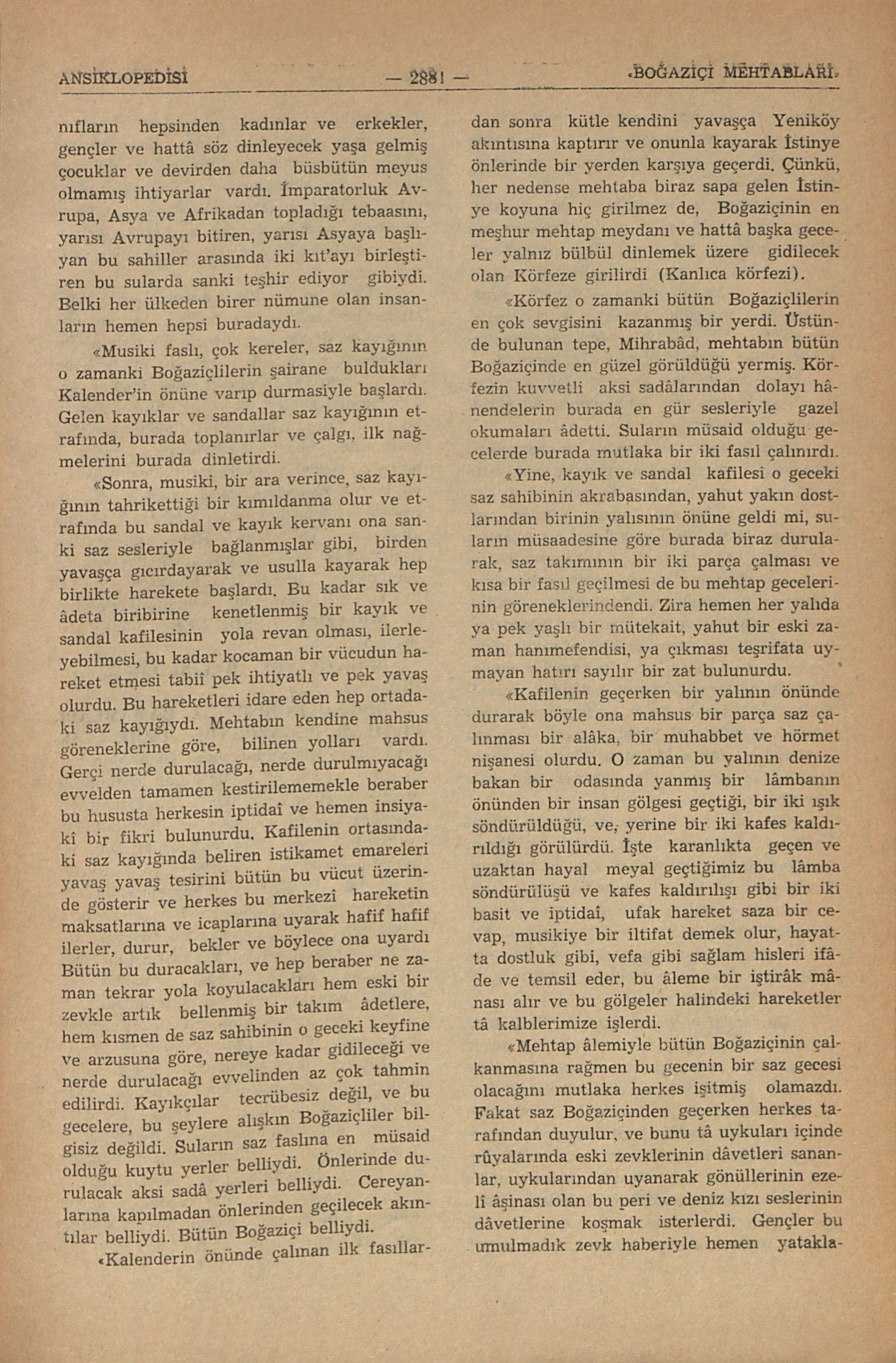 “Sonra, musiki, bir ara verince, saz kayığının tahrikettiği bir kımıldanma olur ve etrafında bu sandalla ve kayık kervanı ona sanki saz sesleriyle bağlanmışlar gibi, birden yavaşça gıcırdayarak ve usulla kayarak hep birlikte harekete başlardı. Bu kadar sık ve âdet biribirine kenetlenmiş bir kayık ve sandal kafilesinin yola revan olması, ilerleyebilmesi, bu kadar kocaman bir vücudun hareket etmesi tabiî pek ihtiyatlı ve pek yavaş olurdu. Bu hareketleri idare eden hep ortadaki saz kayığıyıdı. Mehtabın kendine mahsus göreneklerine göre, bilinen yolları vardı. Gerçi nerde duracağı, nerde durulmayacağı evvelden tamamen kestirilememekle beraber bu hususta herkesin iptidaî ve hemen insiyakî bir fikri bulunurdu. Kafilenin ortasındaki saz kayığında beliren istikamet emareleri yavaş yavaş tesirini bütün bu vücut üzerinde gösterir ve herkes bu merkezi hareketin maksatlarına ve icaplarına uyarak hafif hafif ilerler, durur, bekler ve böylece ona uyardı. Bütün bu duracakları, ve hep beraber ne zaman tekrar yola koyulacakları hem eski bir zevkle artık bellenmiş bir takım âdetlere, hem kısmen de saz sahibinin o geceki keyfine ve arzusuna göre, nereye kadar gidileceği ve nerde durulacağı evvelinden az çok tahmin edilirdi. Kayıkçılar tecrübesiz değil, ve bu gecelere, bu şeylere alışkın Boğaziçliler bilgisiz değildi. Suların saz faslına en müsaid olduğu kuytu yerler belliydi. Önlerinde durulacak aksi sadâ yerleri belliydi. Cereyanlarına kapılmadan önlerinden geçilecek akıntılar belliydi. Bütün Boğaziçi belliydi.