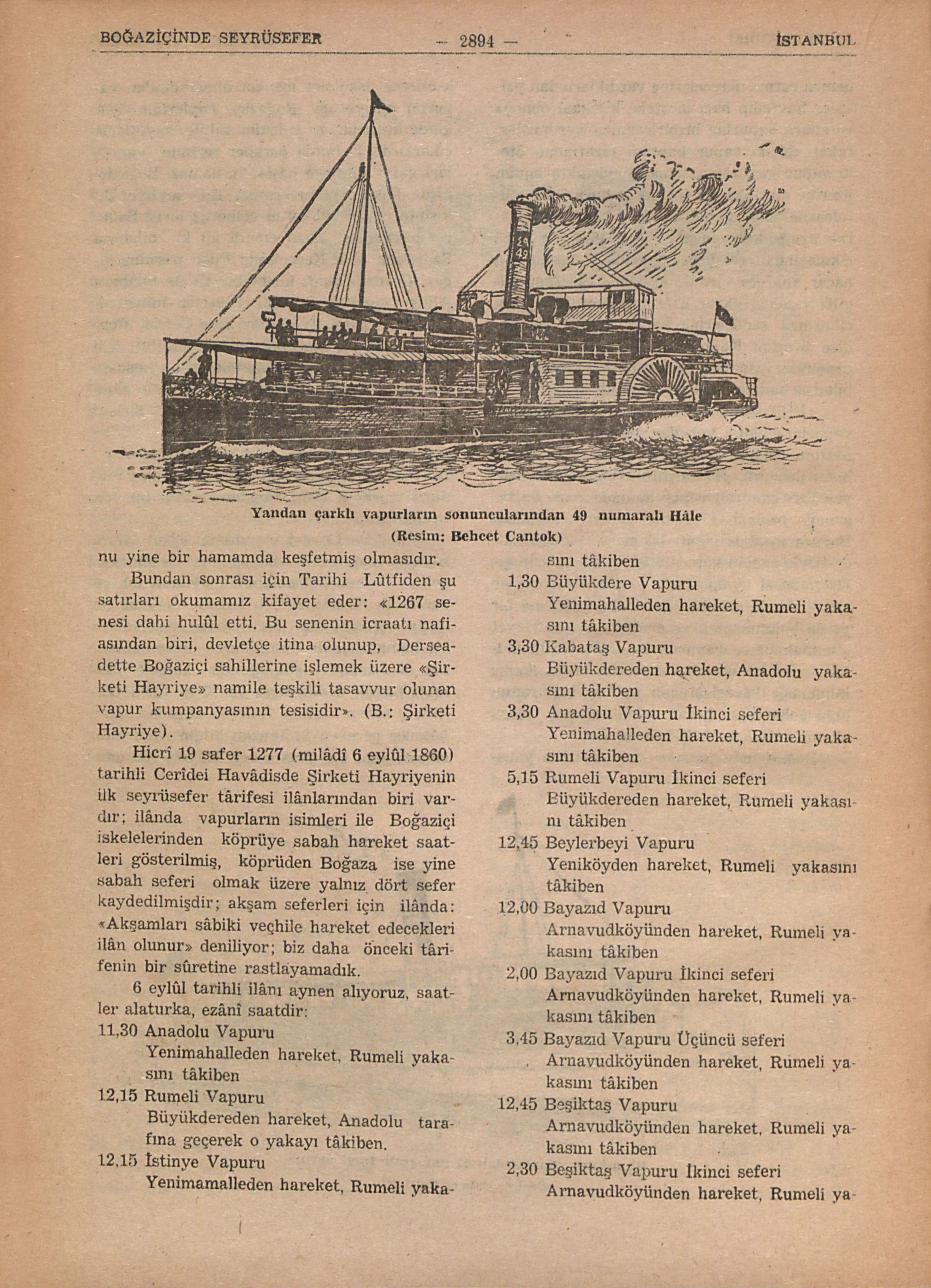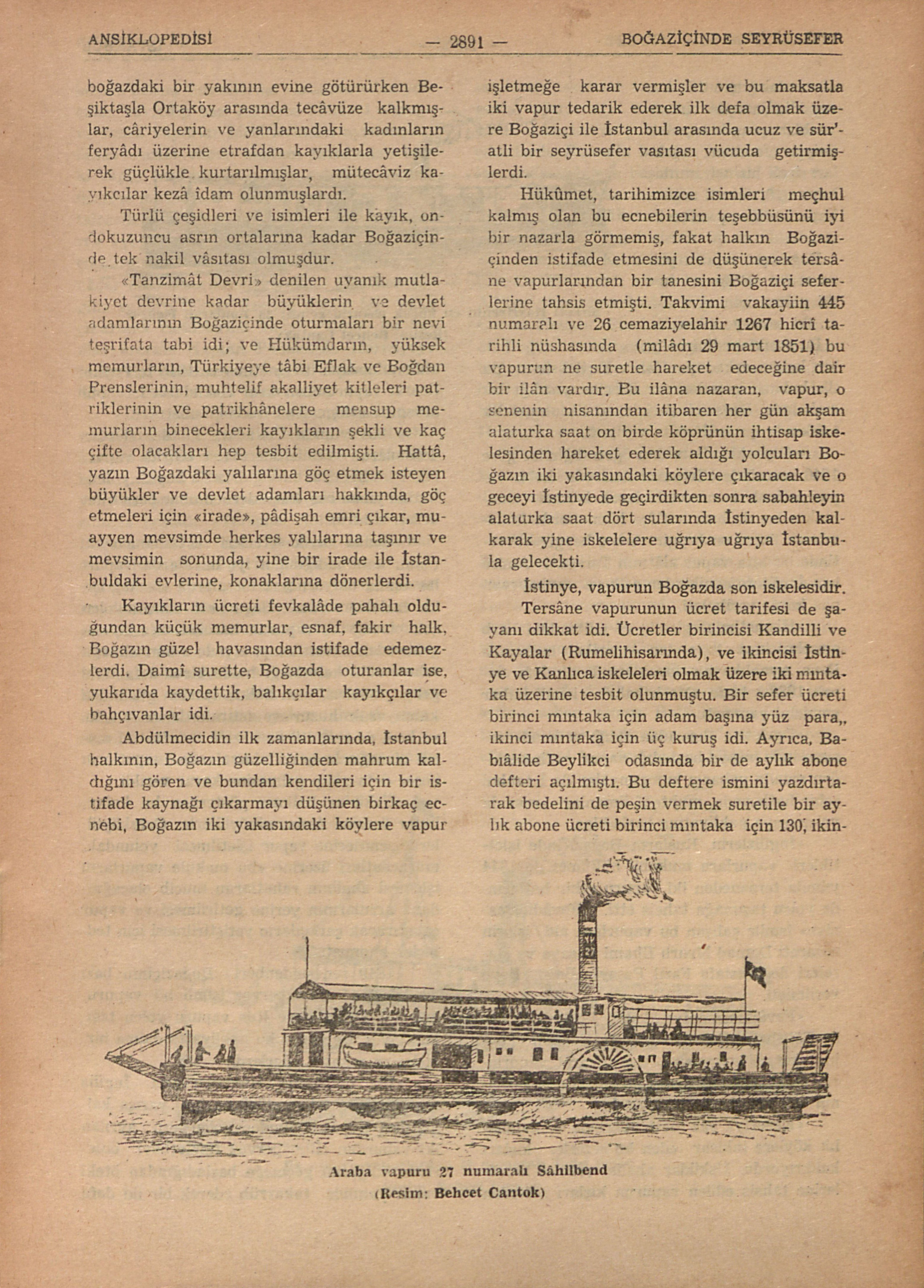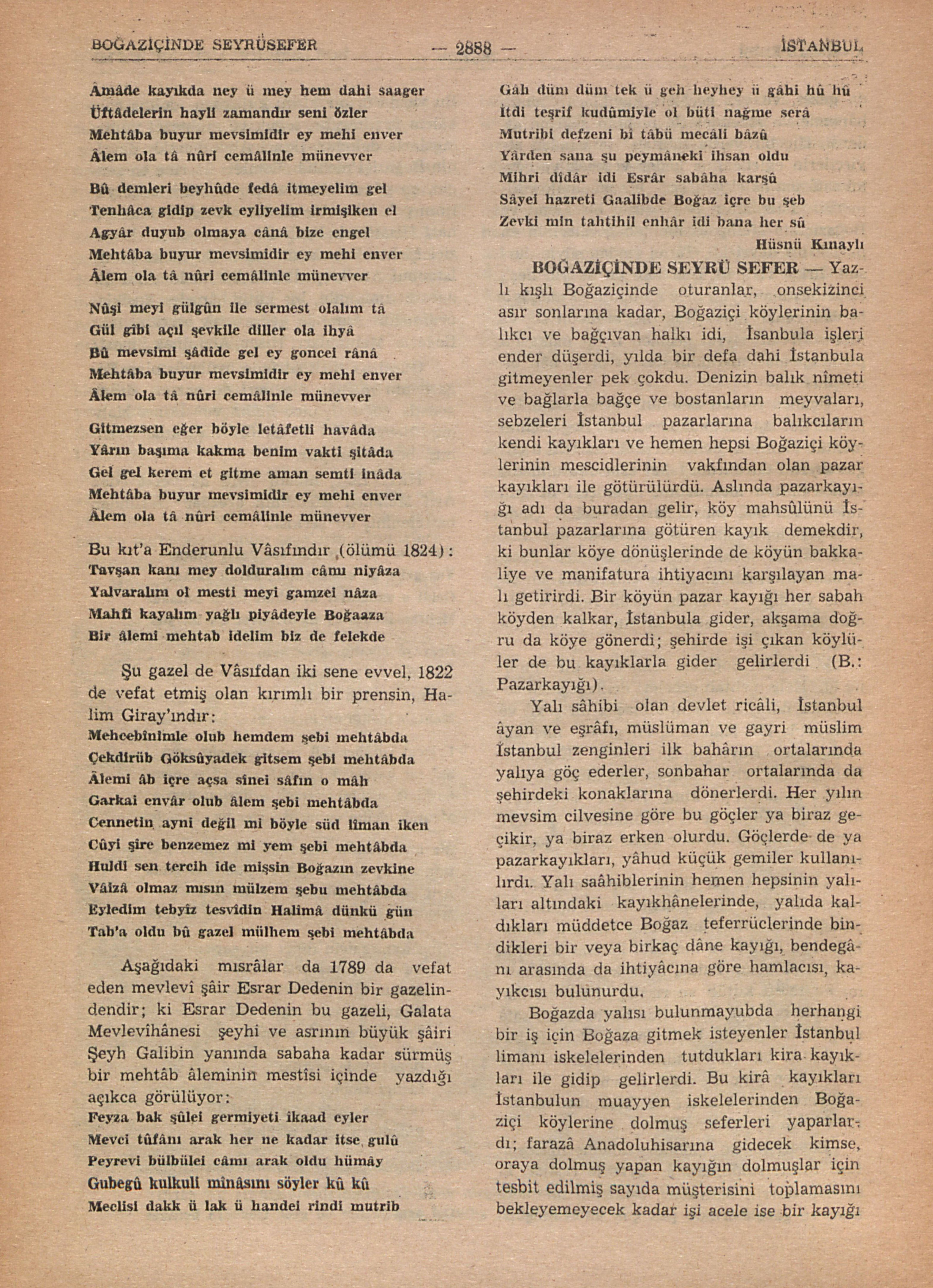 Yazlı kışlı Boğaziçinde oturanlar, onsekizinci asır sonlarına kadar, Boğaziçi köylerinin balıkcı ve bağçıvan halkı idi, İstanbula işleri ender düşerdi, yılda bir defa dahi İstanbula gitmeyenler pek çokdu. Denizin balık nîmeti ve bağlarla bağçe ve bostanların meyvaları, sebzeleri İstanbul pazarlarına balıkcıların kendi kayıkları ve hemen hepsi Boğaziçi köylerinin mescidlerinin vakfından olan pazar kayıkları ile götürülürdü. Aslında pazarkayığı adı da buradan gelir, köy mahsûlünü İstanbul pazarlarına götüren kayık demekdir, ki bunlar köye dönüşlerinde de köyün bakkaliye ve manifatura ihtiyacını karşılayan malı getirirdi. Bir köyün pazar kayığı her sabah köyden kalkar, İstanbula gider, akşama doğru da köye gönerdi; şehirde işi çıkan köylüler de bu kayıklarla gider gelirlerdi (B.: Pazarkayığı). Yalı sâhibi olan devlet ricâli, İstanbul âyan ve şerâfı, müslüman ve gayri müslim İstanbul zenginleri ilk bahârın ortalarında yalıya göç ederler, sonbahar ortalarında da şehirdeki konaklarına dönerlerdi. Her yılın mevsim cilvesine göre bu göçler ya biraz gecikir, ya biraz erken olurdu. Göçlerde de ya pazarkayıkları, yâhud küçük gemiler kullanılırdı. Yalıh saâhiblerinin hemen hepsinin yalıları altındaki kayıkhânelerinde, yalıda kaldıkları müddetce Boğaz teferrüclerinde bindikleri bir veya birk...