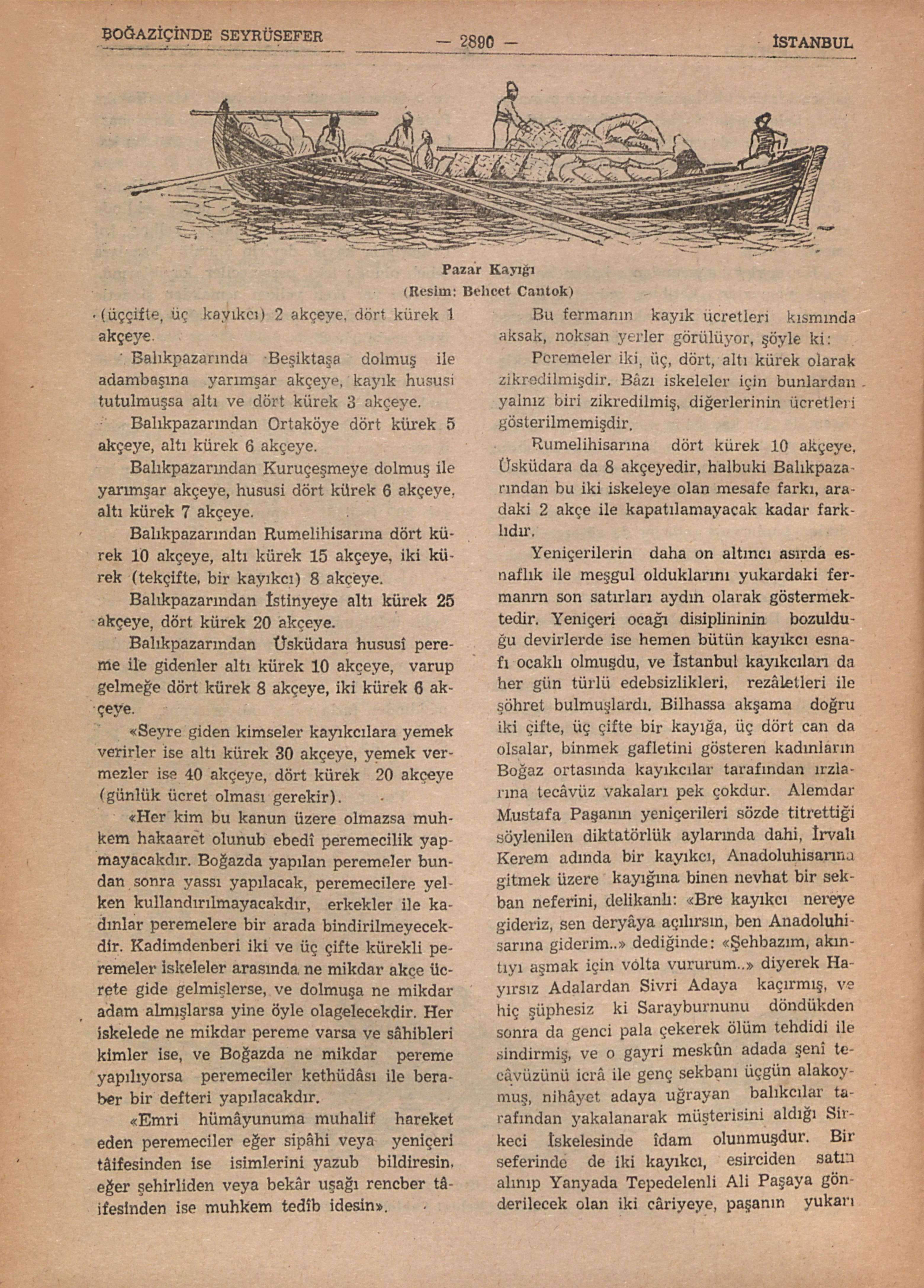 Yazlı kışlı Boğaziçinde oturanlar, onsekizinci asır sonlarına kadar, Boğaziçi köylerinin balıkcı ve bağçıvan halkı idi, İstanbula işleri ender düşerdi, yılda bir defa dahi İstanbula gitmeyenler pek çokdu. Denizin balık nîmeti ve bağlarla bağçe ve bostanların meyvaları, sebzeleri İstanbul pazarlarına balıkcıların kendi kayıkları ve hemen hepsi Boğaziçi köylerinin mescidlerinin vakfından olan pazar kayıkları ile götürülürdü. Aslında pazarkayığı adı da buradan gelir, köy mahsûlünü İstanbul pazarlarına götüren kayık demekdir, ki bunlar köye dönüşlerinde de köyün bakkaliye ve manifatura ihtiyacını karşılayan malı getirirdi. Bir köyün pazar kayığı her sabah köyden kalkar, İstanbula gider, akşama doğru da köye gönerdi; şehirde işi çıkan köylüler de bu kayıklarla gider gelirlerdi (B.: Pazarkayığı). Yalı sâhibi olan devlet ricâli, İstanbul âyan ve şerâfı, müslüman ve gayri müslim İstanbul zenginleri ilk bahârın ortalarında yalıya göç ederler, sonbahar ortalarında da şehirdeki konaklarına dönerlerdi. Her yılın mevsim cilvesine göre bu göçler ya biraz gecikir, ya biraz erken olurdu. Göçlerde de ya pazarkayıkları, yâhud küçük gemiler kullanılırdı. Yalıh saâhiblerinin hemen hepsinin yalıları altındaki kayıkhânelerinde, yalıda kaldıkları müddetce Boğaz teferrüclerinde bindikleri bir veya birkaç dâne kayığı, bendegânı arasında da ihtiyâcına göre hamlacısı, kayıkcısı bulunurdu. Boğazda yalısı bulunmayubda herhangi bir iş için Boğaza gitmek isteyenler İstanbul limanı iskelelerinden tutdukları kira kayıkları ile gidip gelirlerdi. Bu kirâ kayıkları İstanbulun muayyen iskelelerinden Boğaziçi köylerine dolmuş seferleri yaparlardı; farazâ Anadoluhisarına gidecek kimse, oraya dolmuş yapan kayığın dolmuşlar için tesbit edilmiş sayıda müşterisini toplamasını bekleyemeyecek kadar işi acele ise bir kayığı şahsen kiralar idi. İstanbul Limanının muayyen iskeleleri ile Boğaziçi köylerinin iskeleleri arasında işleyen bu kira kayıklarının dolmuş fiatları ve hususi fiatları İstanbul kadılığınca, daha on altıncı asırda, kayıkların büyüklüğüne, yani bir çifte, ki çifte, üç çifte ve dört çifte oluşuna göre ayrı ayrı tesbit edilmişdi. Bir devlet kapusundan, kalemden faka dengi memurlar, kâtibler, yahud ayni mahalleden üç beş yâri sâdık, veyâ bir esnaf topluluğundan birkaç kişi sözleşip de tâtil günleri Boğaziçine seyrâna gidecek olduklarında, nevâle zenbilleri; çayırlara, su başlarına, deniz kenarına serip oturmak için bir hasır ile bir kaç kilim seccâde de götürecek olduklarından bir veya bir kaç kayığı bütün günlüğüne tutarlar idi. Bâzı esnaf toplulukları da ustaları, kalfaları ve çırakları ile her yaz Boğaziçinin muayyen bir mesiresine giderler, yanlarında çadırlar da götürerek orada birkaç gece, hatta bir hafta kadar kalırlardı, küçük yatak denkleri, erzak çuvalları, tencere kazan gibi kap kacakla İstanbul esnafının bu Boğaz seyranları bir küçük göç manzarası alırdı ve onlar da kendilerini ve ağırlıklarını götürüp getirecek kayıkları pazarlıkla tutarlardı. Mesîrede ne kadar kalınacak ise, günü birlik, beş gün, bir hafta, kayıkcıların beslenmesini de İstanbul Kadılığı (Belediye), yine daha on altıncı asırda düşünmüşdü (B.: Esnaf). Boğaziçi sularının bir süsü olub zamanımıza maalesef tek örneği kalmamış olan kayık zarif bir tekne idi, “piyâde” ve “pereme” isimleri altında anıla gelmişlerdir, peremeler piyâdelerden az kabaca olub kira kayıkları, dolayısı ile bütün dolmuş kayıkları pereme nev’inden idi; on yedinci asır ortalarından itibâren pereme adı tamamen terkedilmiş, kira ve dolmuş kayıklarına da piyâde, veyâ sadece kayık denilmişdir (B.: Kayık; Pereme; Piyâde; Yağlıpiyâde; Kancabaş; Beşçifte; Üççifte; Dalyan kayığı; Balıkcı kayığı; Gırgır; Alamana). Kira kayığı olan peremelerin icâbında takılıp alınır bir direkleri ve üçgen şeklinde bir de yelkenleri vardı; fakat yelken, ânî rüzgârlarla kayığı devirip ölümlü kazalara sebeb olduğu için, peremeciler, kayıklarında müşteri var iken yelken açmakdan şiddetle men edilmişlerdi, yelkeni ancak kayık boş iken açabilirlerdi. Dolmuş kayıklarına kadınlarla erkeklerin karışık olarak binmeleri, kezâ tüysüz oğlanların yabancı ereklerle kayığa binmeleri şiddetle yasakdı, görüldükleri zaman bundan peremeciler mesul olurdu. Aşağıdaki satırları Dîvâni Hümâyundan İstanbul Kadılığına gönderilmiş hicrî 25 receb 995 (milâdî 1 temmuz 1586) tarihli bir fermandan zamanımızın diline çevirerek alıyoruz: “İstanbul kadısına hüküm ki; “Hâlen Boğazda yapılan peremeler evvelki üslûbundan çıkıp daha uzun ve ensiz yapılıyormuş, ve peremeciler yelken kullanıyormuş, ve peremelere avretlerle oğlanları erkeklerle karışık bindiriyorlarmış, ve haddinden fazla yolcu alıyorlarmış, yelken kullanma ve fazla yolcu alma yüzünden pek çok kayık batmış, peremeciler nice nüfûsun telefine sebeb olmuşlar. “Peremecilerin kadimden beri alına gelen ücrete kanaat etmeyüb müşterilerinin, ve bilhassa ırz ehli kimselerle kadınların peşlerinden koşarak edebsizlikler yapdığı da ihbar olundu. “Alınacak ücretler şudur: Fındıklıdan Yemiş İskelesine dört kürek (iki çifte, iki kayıkcı) 2 akçeye Balıkpazarından Tophâneye altı kürek (üççifte, üç kayıkcı) 2 akçeye, dört kürek 1 akçeye. Balıkpazarında Beşiktaşa dolmuş ile adambaşına yarımşar akçeye, kayık hususi tutulmuşsa altı ve dört kürek 3 akçeye. Balıkpazarından Ortaköye dört kürek 5 akçeye, altı kürek 6 akçeye. Balıkpazarından Kuruçeşmeye dolmuş ile yarımşar akçeye, husu
