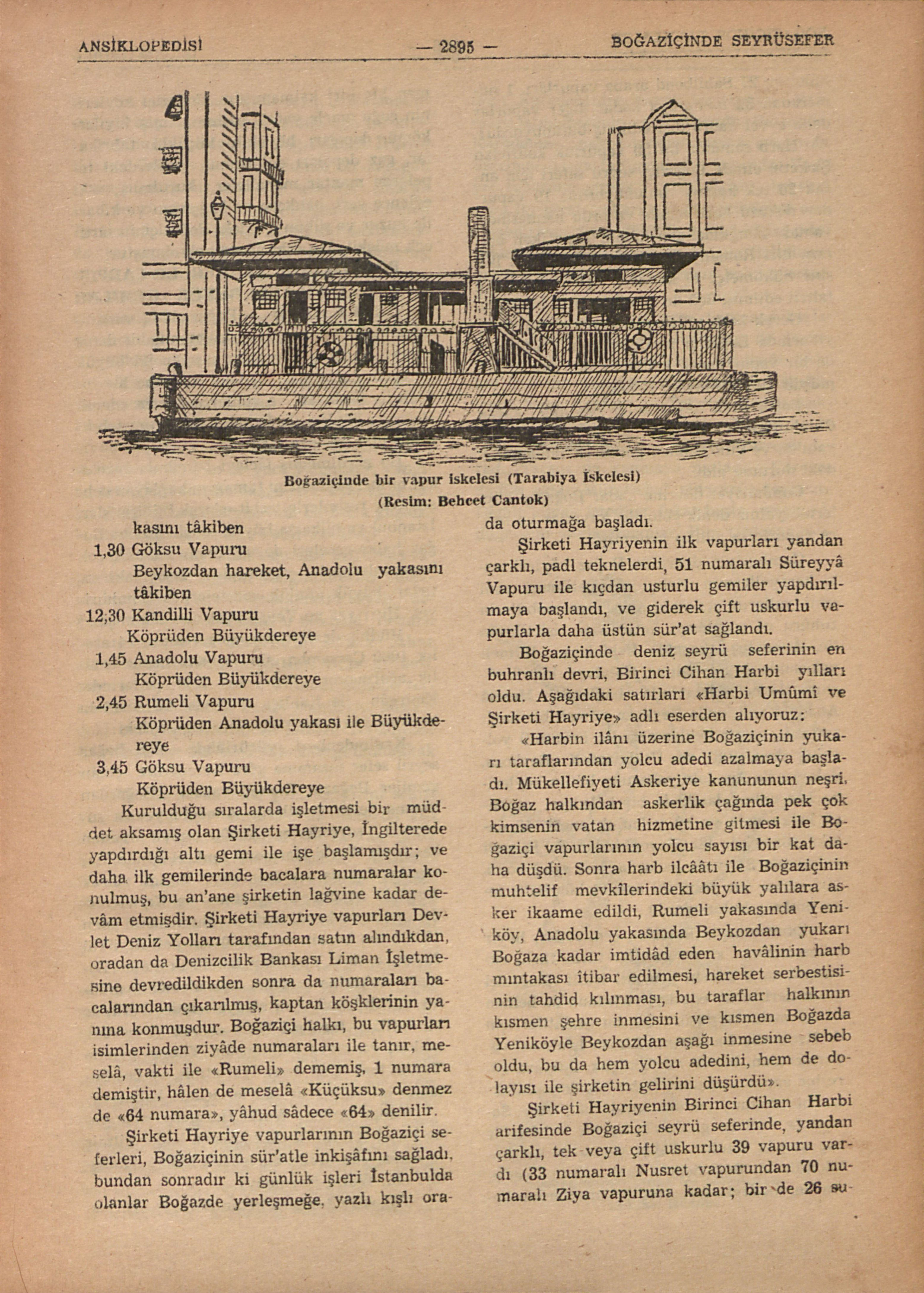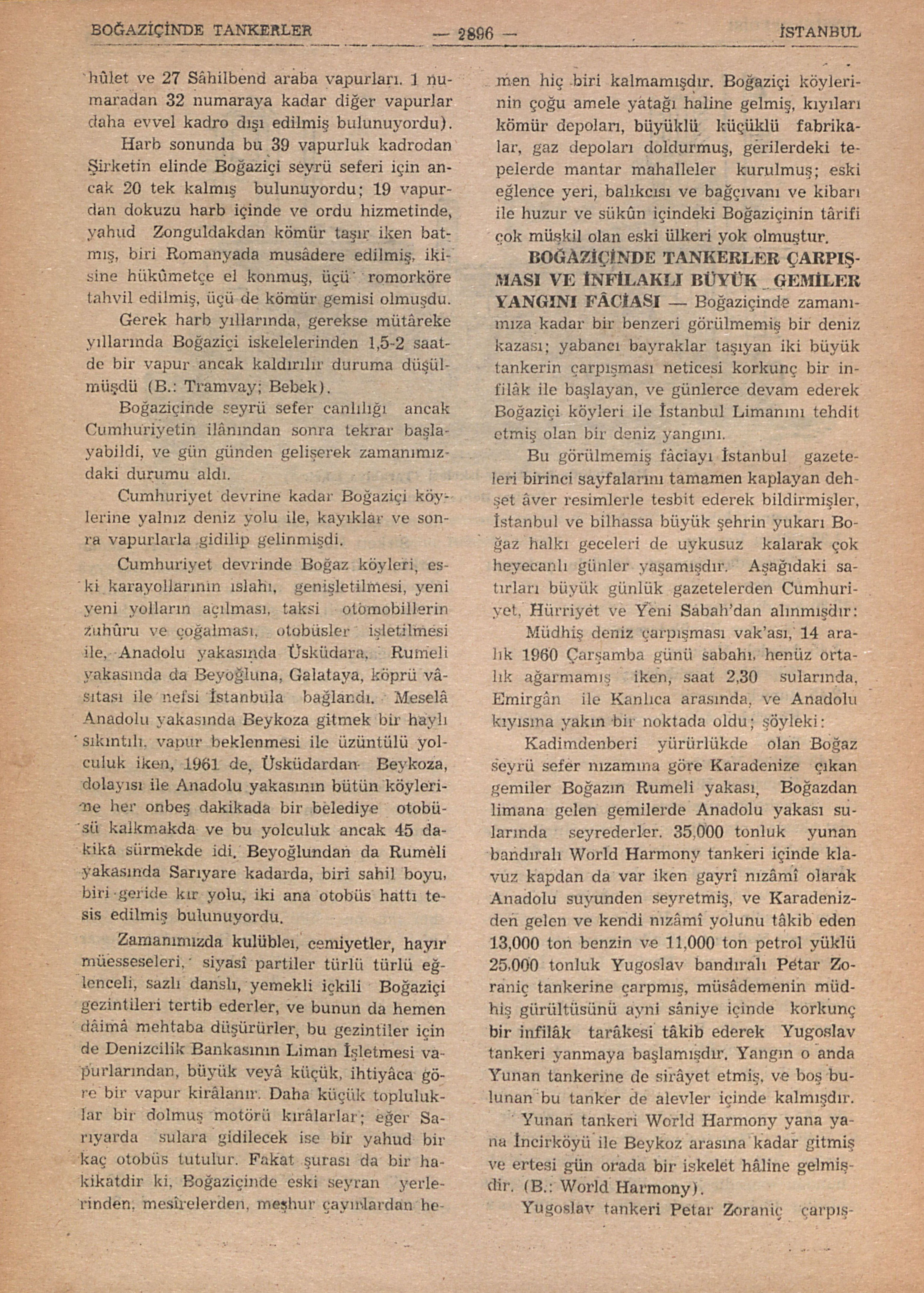 B.: Pazarkayığı; B.: Esnaf; B.: Kayık; Pereme; Piyâde; Yağlıpiyâde; Kancabaş; Beşçifte; Üççifte; Dalyan kayığı; Balıkcı kayığı; Gırgır; Alamana; B.: Şirketi Hayriye; B.: Tramvay; Bebek