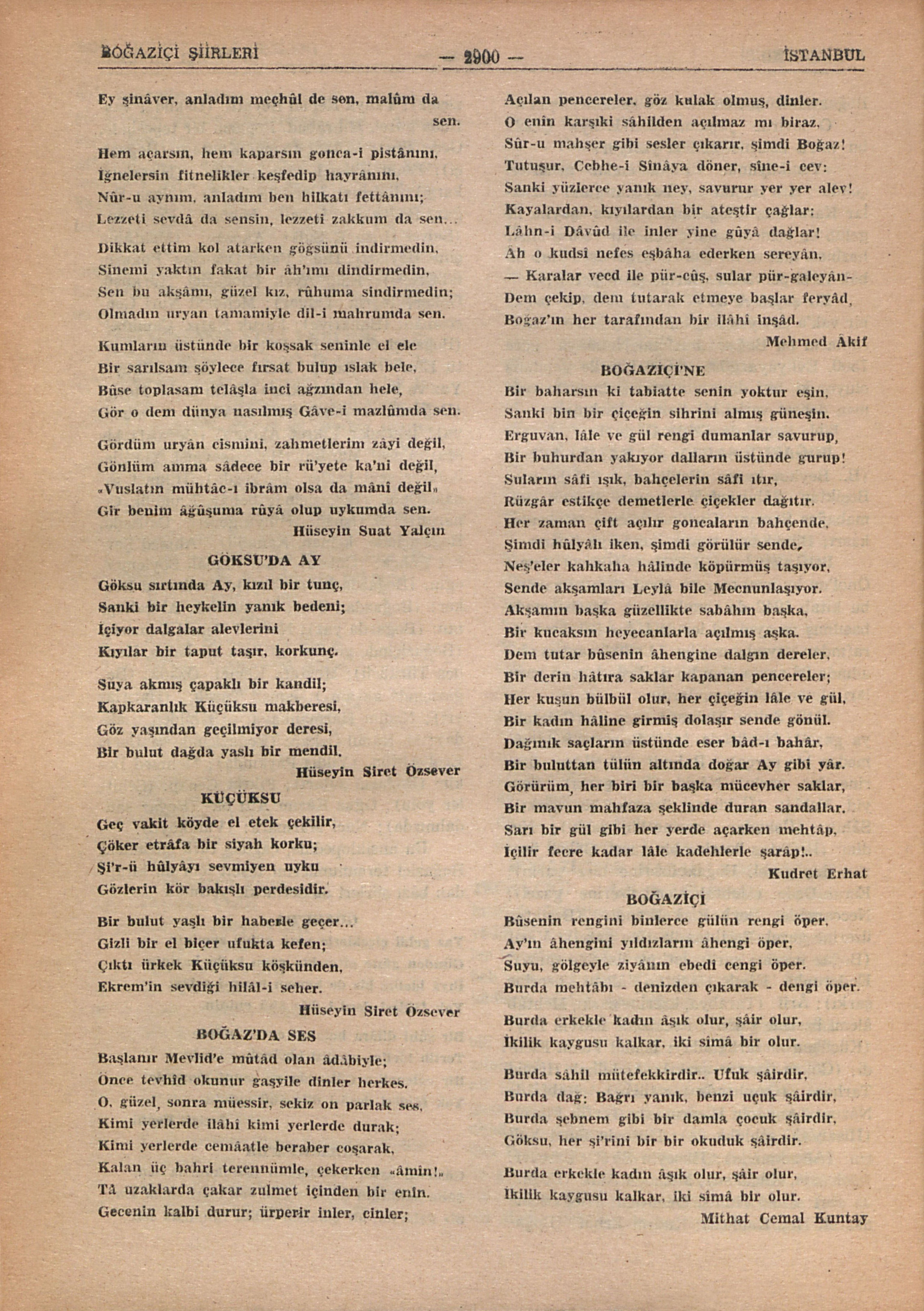 Fâtih Sultan Mehmed (Avni): (Galatalıya gazel); Nev’izâde Atâî; Fenni (Sâhilnâmeden bir parça); Rahmi: (Beşiktaş üzerine bir şarkı); Nâşid: ( Bir şarkı); Seyyid Vehbi; (Üsküdar üzerine bir şarkı); Sâhib: (Üskudar üzerine bir şarkı); Nedim: (Beşiktaş üzerine bir gazel, Göksü üzerine bir gazel, Boğaz üzerine bir şarkı); Esrar Dede: (Mehtâb âlemi üzerine gazel); Neccarzâde Şeyh Rizâ Efendi: (Beşiktaş üzerine gazel, Beşiktaş üzerine gazel); Vâsıf (Boğaz üzerine şarkı, İstinye üzerine şarkı); Enderunlu Fâzıl: (Mektâb âlemi üzerine şarkı); Ârif: (Tarabya, üzerine şarkı, Mehtâb âlemi üzerine şarkı); Recâizâde Ekrem Bey: (Küçüksu mezarlığında); İsmail Fenni Efendi: (Göksu üzerine şarkı); Abdulhak Hâmid Tarhan: (Çamlıcada bir türbe). Nabizâde Nâzım: (Anadolu Hisarında); Tevfik Fikret: (Hisardaki şehidlik de); Hüseyin Suad Yalçın: (Altınkumda); Hüseyin Sîret Özsever: (Göksuda, Küçüksu); Mehmet Âkif: (Boğazda ses); Fuad Hulûsi Demirelli: (Boğaziçine hasret, Hey Kanlıca); Kudret Erhat: (Boğaziçine); Yahyâ Kemal Beyatlı: (Üsküdar vasfında gazel, Mihrâbâd, Boğazın bir tepesinde, Gece, Ses); Midhat Cemal Kuntay: (Boğaziçi); Emin Bülend Serdaroğlu: (Hisarlara karşı); İbrahim Alaeddin Gövsa: (Nazlı Boğaz, Boğaziçi); İsmail Hikmet Ertaylan: (Sidrei Huzur); Sıdkı Akozan: (Mehtâbın şiiri, Beykoz); Halid Fahri Ozansoy: Boğazın dilberleri); Edip Ayel: (Boğaziçi türküsü, Göksu, Teşrin, Yalılar); Mehmed Nuri Gencosman: (Bahâriye); Faruk Nafız Çamlıbel: (Boğaziçi, Göksu, Kış bağçeleri); Necdet Rüştü Efe: (Boğazda Mehtab, Arnavudköyü, Yaz ve Boğaz, Kavaklar); Rıfkı Melûl Meriç: (Boğazda seyran); Safa Erkün: (Çamlıcaya); İskender Fikret Akdora: (Boğazda bir ses); Yusuf Mardin: (Boğaz sevgisi, Yûşâda, Sarıyer seni bekler, Beykozda); Hikmet Şinasi Önol: (Boğaziçinde bahar, Kandilli, Çınaraltı); S. Cenan: (Hülyâ gecesi, Dâüssıla, Boğaziçinde keman, Kandilli); Ahmed Şevket Bohça: (Göksu); Sâdi Kemâlî Söylemezoğlu): (Boğazda bir seyahat); Ercümend Berker: (Boğazdan Ses); Ercümend Alacakaptan: (Boğazda yaz); Nevzad Kemal Özmeriç: (Boğaziçinde geceler, Boğaza bir bakış, Kanlıca Türküsü); Mustafa Kemal Özkök: (Boğaziçinde akşam); İsmail Turalı: (Hatırlayış); Nedim Harmankaya: (Sâhilden uzakda); M. Kâmil Özkan: (Boğaziçinde saatler). Erol Aktün. (Yıldız Parkında); Mehmed Bekir: (Boğazın suları); Fikret Cenap: (Şehitler yolu); Oğuz Kâzım Altı ok: (Beyaz sandalınızda); Naci Marmara: (Vaniköyü).