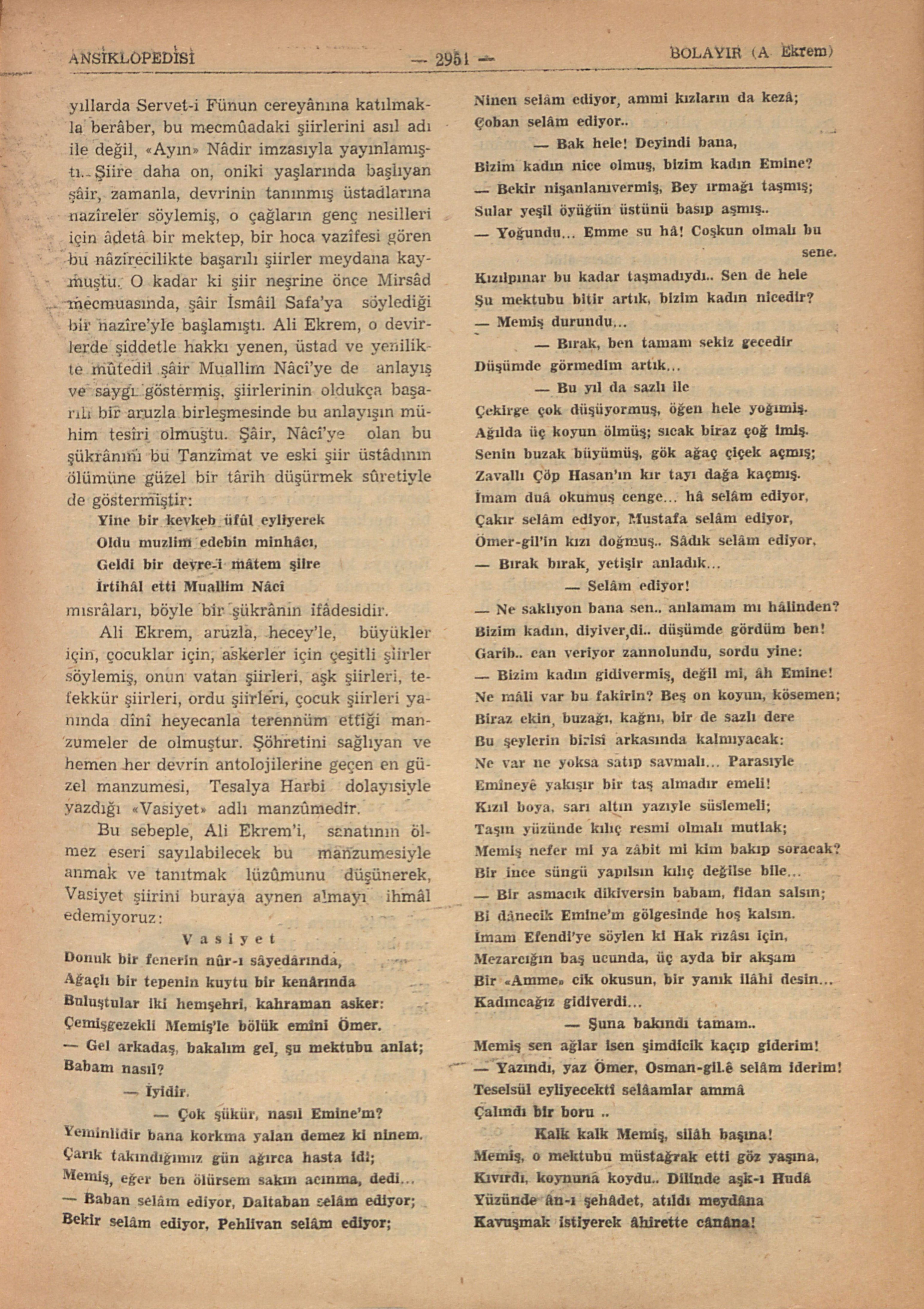 Bu sebeple, Ali Ekrem’i, sanatının ölmez eseri sayılabilecek bu manzumesiyle anmak ve tanıtmak lüzûmunu düşünerek, Vasiyet şiirini buraya aynen almayı ihmâl edemiyoruz: