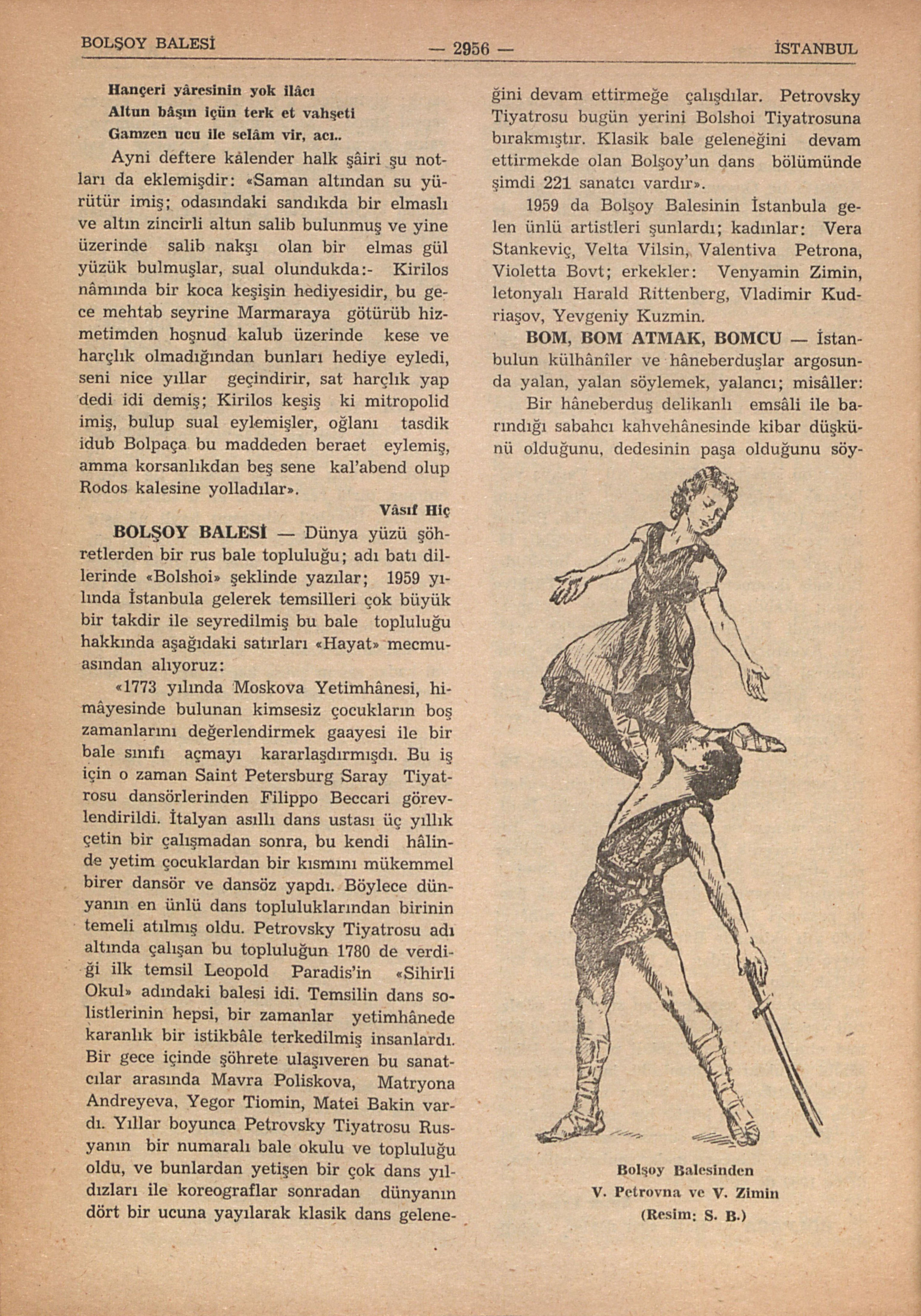 İstanbulun külhâniler ve hâneberduşlar argosunda yalan, yalan söylemek, yalancı; misâller: Bir hâneberduş delikanlı emsâli ile barındığı sabahcı kahvehânesinde kibar düşkünü olduğunu, dedesinin paşa olduğunu söylerken biri atılır: — İnanmayın ulan, hepsi bomdur, fırlamadır (piçdir) o, nerden bilecek dedesini.. * Bir balıkcı kahvehânesinde ihtiyar bir balıkıc, gençliğinde Beylerbeyinde kayığı devrilerek denize düşen güzel bir hanım sultanı nasıl kurtardığını, o hanım sultanın kendisine âşık olduğunu, bir gece sandalla yalıya giderek bir arab bacının kendisini pencereden yalıya aldığını, genç kadınla nasıl muhabbet ettiklerini, hanım sultan kendisine evlenmeyi teklif ettiği, hattâ paşa babasının da buna râzı olacağını söylediği halde gönlü kendi küffü olan başka bir güzel kızda olduğu için bu teklifi red ettiğini ballandırarak anlatırken bir ses: — Hasan Baba yine bom atıyor!. — Sus ulan, tatlı tatlı dinliyoruz işte... * Bir kahvehânede pırpırı bir oğlan kahveciye, oranın müdâvimlerinden bir seyyar börekcinin kendisini yanına çırak olarak alacağını söyler; kahveci: — Güvenme, bomcu nâmussuzun biridir, sana kötü oyun oynar, gözünü aç, ayağını denk al...