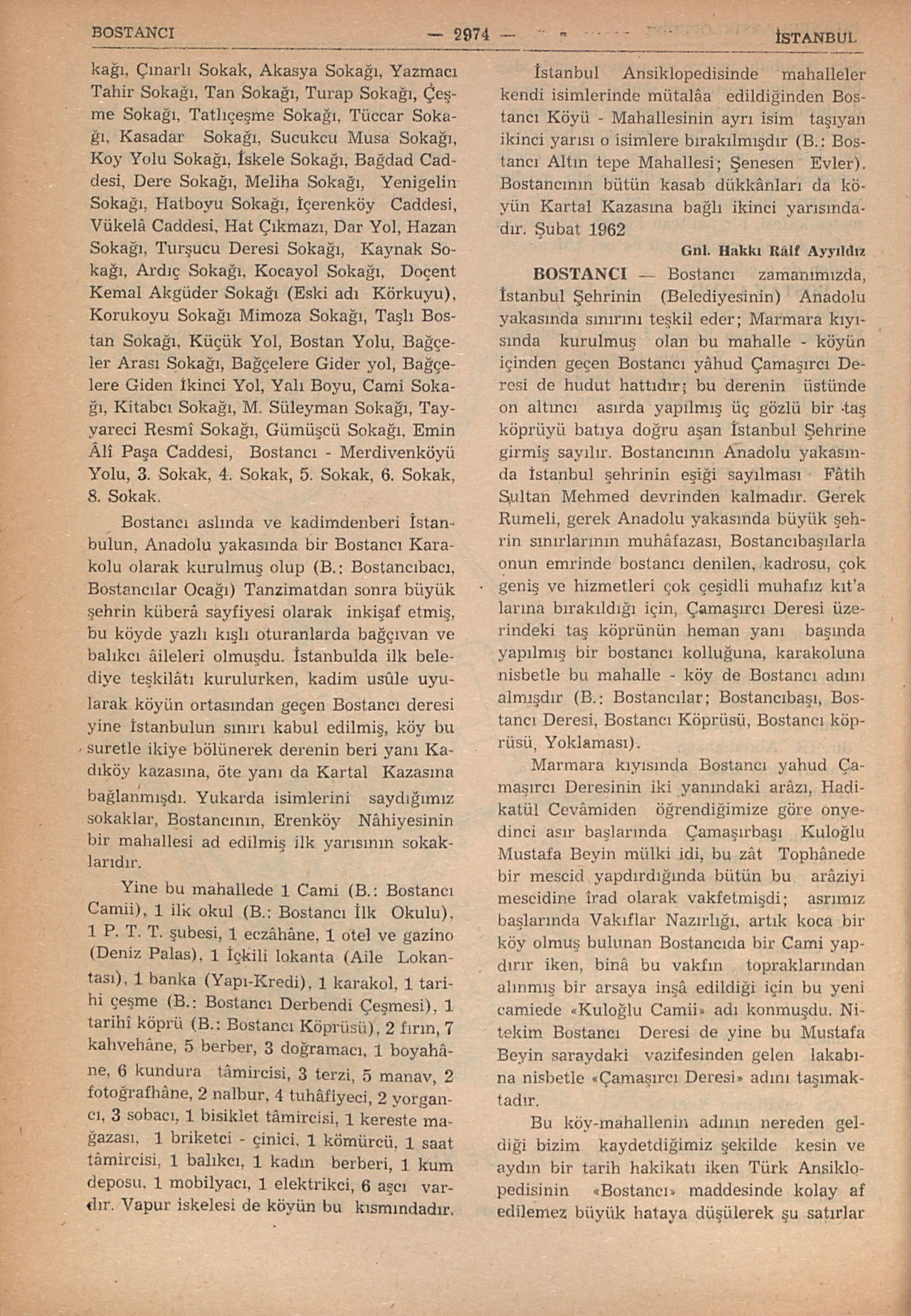 Bostancı aslında ve kadimdenberi İstanbulun, Anadolu yakasında bir Bostancı Karakolu olarak kurulmuş olup (B.: Bostancıbacı, Bostancılar Ocağı) Tanzimatdan sonra büyük şehrin küberâ sayfiyesi olarak inkişaf etmiş, bu köyde yazlı kışlı oturanlarda bağçıvan ve balıkcı âileleri olmuşdu. İstanbulda ilk belediye teşkilâtı kurulurken, kadim usûle uyularak köyün ortasından geçen Bostancı deresi yine İstanbulun sınırı kabul edilmiş, köy bu suretle ikiye bölünerek derenin beri yanı Kadıköy kazasına, öte yanı da Kartal Kazasına bağlanmışdı. Yukarda isimlerini saydığımız sokaklar, Bostancının, Erenköy Nâhiyesinin bir mahallesi ad verilmiş ilk yarısının sokaklarıdır.
