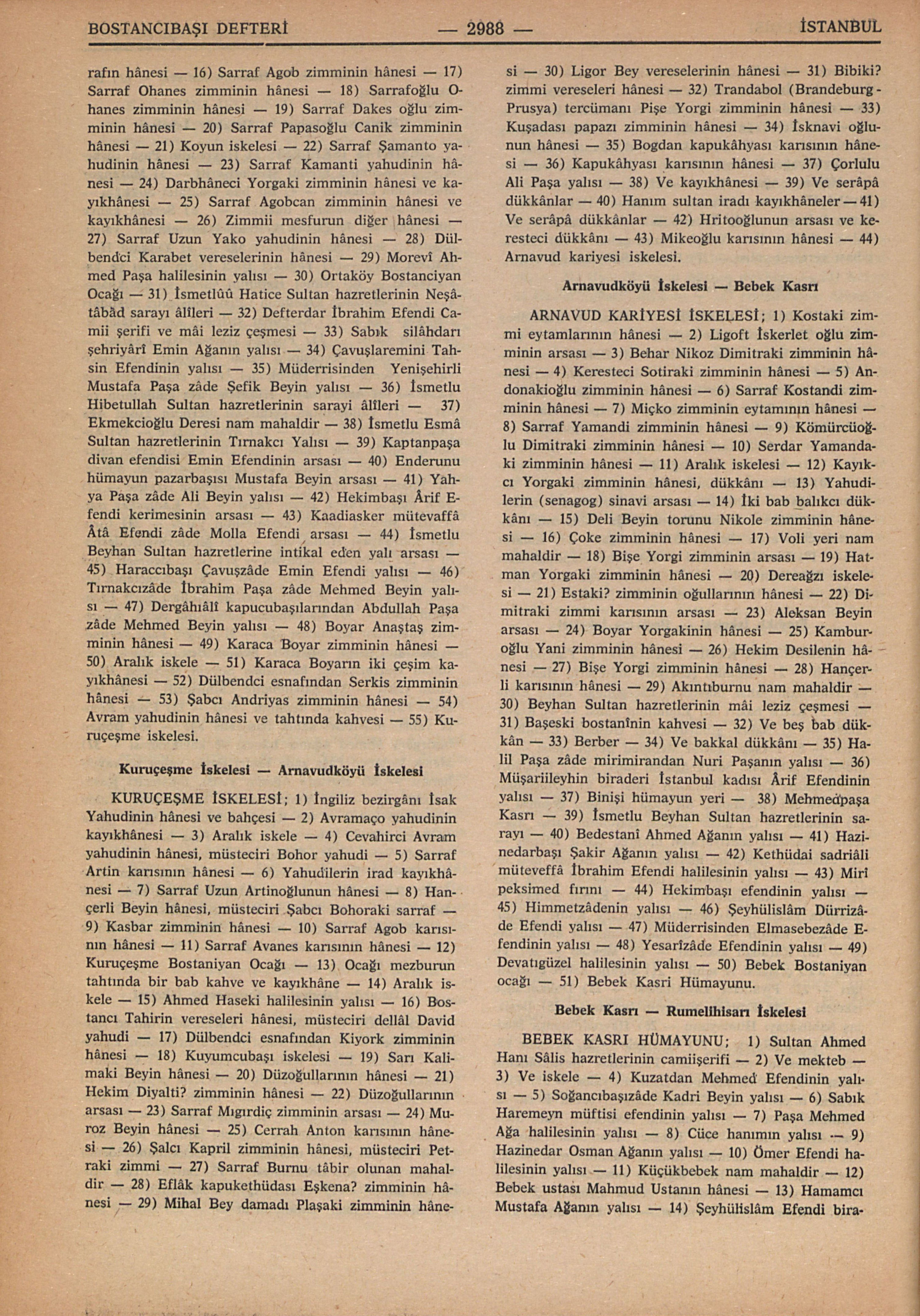 ARNAVUD KARİYESİ İSKELESİ; 1) Kostaki zimmi eytamlarının hânesi – 2) Ligoft İskerlet oğlu zimminin arsası – 3) Behar Nikoz Dimitraki zimminin hânesi – 4) Keresteci Sotiraki zimminin hânesi – 5) Andonakioğlu zimminin hânesi – 6) Sarraf Kostandi zimminin hânesi – 7) Miçko zimminin eytamının hânesi – 8) Sarraf Yamandi zimminin hânesi – 9) Kömürcüoğlu Dimitraki zimminin hânesi – 10) Serdar Yamandaki zimminin hânesi – 11) Aralık iskelesi – 12) Kayıkcı Yorgaki zimminin hânesi, dükkânı – 13) Yahudilerin (senagog) sinavi arsası – 14) İki bab balıkcı dükkânı – 15) Deli Beyin torunu Nikole zimminin hânesi – 16) Çoke zimminin hânesi – 17) Voli yeri nam mahaldir – 18) Bişe Yorgi zimminin arsası – 19) Hatman Yorgaki zimminin hânesi – 20) Dereağzı iskelesi – 21) Estaki? zimminin oğullarının hânesi – 22) Dimitraki zimmi karısının arsası – 23) Aleksan Beyin arsası – 24) Boyar Yorgakinin hânesi – 25) Kamburoğlu Yani zimminin hânesi – 26) Hekim Desilenin hânesi – 27) Bişe Yorgi zimminin hânesi – 28) Hançerli karısının hânesi – 29) Akıntıburnu nam mahaldir – 30) Beyhan Sultan hazretlerinin mâi leziz çeşmesi – 31) Başeski bostanînin kahvesi – 32) Ve beş bab dükkân – 33) Berber – 34) Ve bakkal dükkânı – 35) Halil Paşa zâde mirimirandan Nuri Paşanın yalısı – 36) Müşariileyhin biraderi İstanbul kadısı Ârif Efendinin yalısı – 37) Binişi hümayun yeri – 38) Mehmedpaşa Kasrı – 39) İsmetlu Beyhan Sultan hazretlerinin sarayı – 40) Bedestanî Ahmed Ağanın yalısı – 41) Hazinedarbaşı Şakir Ağanın yalısı – 42) Kethüdai sadriâli müteveffâ İbrahim Efendi halilesinin yalısı – 43) Mirî peksimed fırını – 44) Hekimbaşı efendinin yalısı – 45) Himmetzâdenin yalısı – 46) Şeyhülislâm Dürrizâde Efendi yalısı – 47) Müderrisinden Elmasebezâde Efendinin yalısı – 48) Yesarîzâde Efendinin yalısı – 49) Devatıgüzel halilesinin yalısı – 50) Bebek Bostaniyan ocağı – 51) Bebek Kasri Hümayunu.