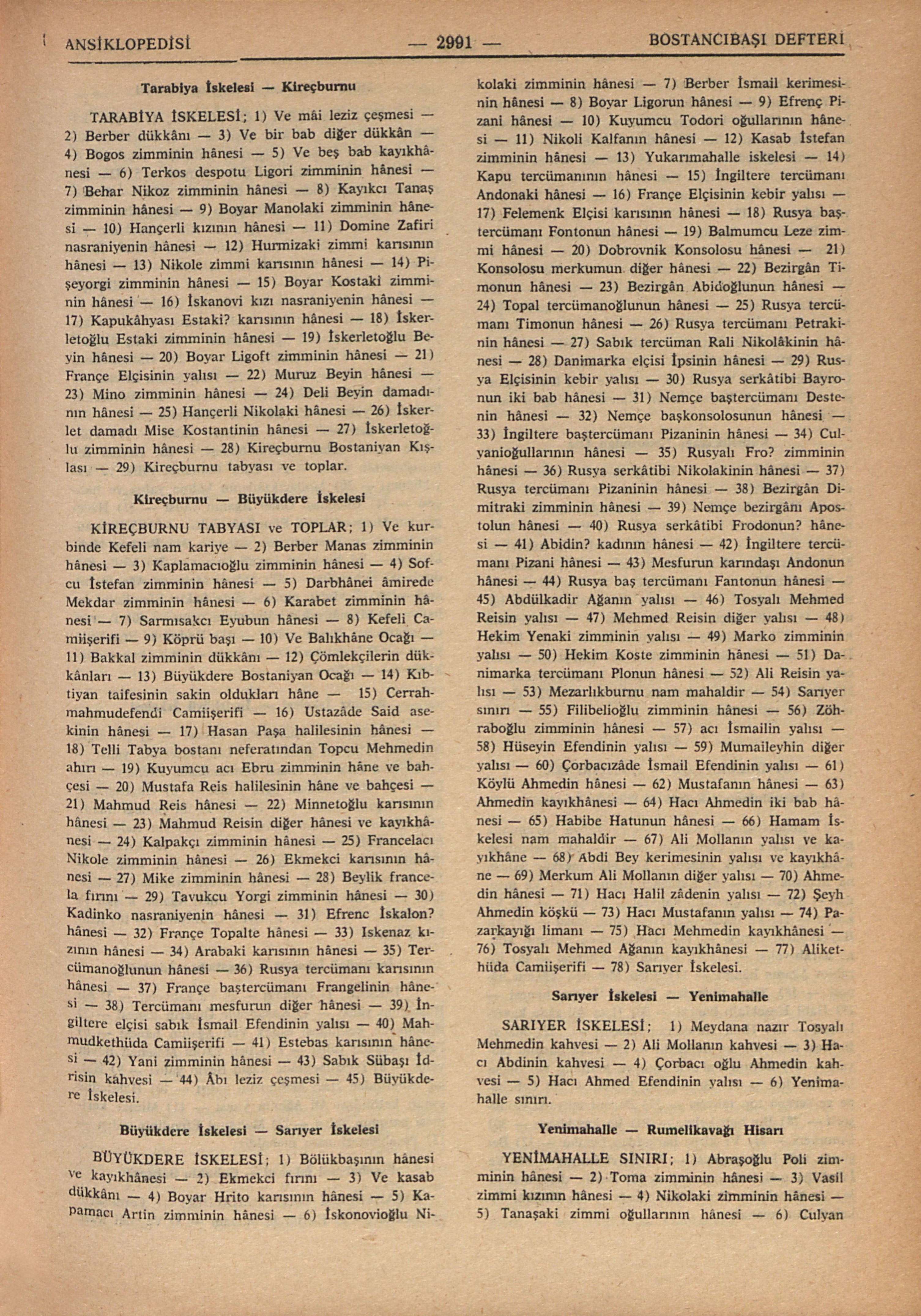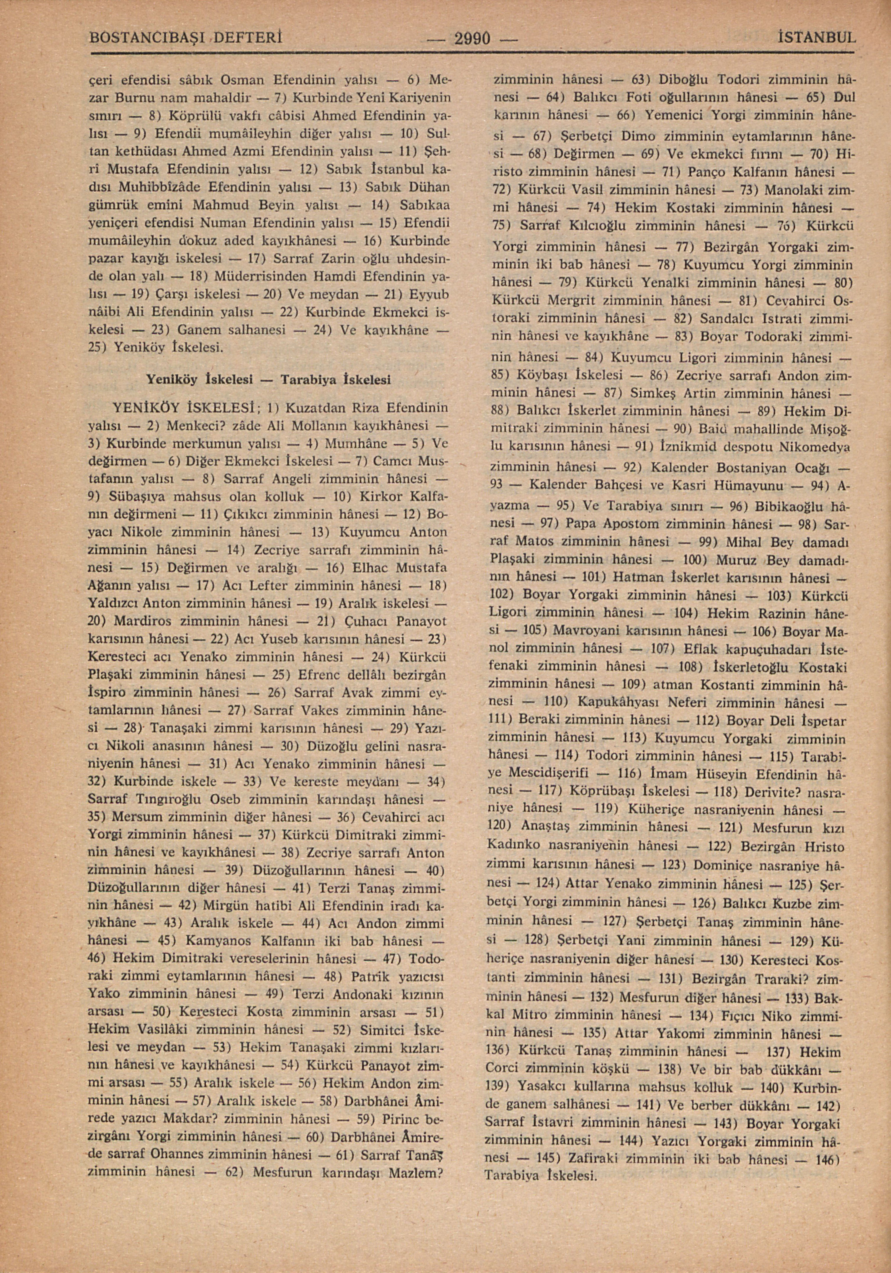 YENİKÖY İSKELESİ; 1) Kuzatdan Riza Efendinin yalısı – 2) Menkeci? zâde Ali Mollanın kayıkhânesi – 3) Kurbinde merkumun yalısı – 4) Mumhâne – 5) Ve değirmen – 6) Diğer Ekmekci İskelesi – 7) Camcı Mustafanın yalısı – 8) Sarraf Angeli zimminin hânesi – 9) Sübaşıya mahsus olan kolluk – 10) Kirkor Kalfanın değirmeni – 11) Çıkıkcı zimminin hânesi – 12) Boyacı Nikole zimminin hânesi – 13) Kuyumcu Anton zimminin hânesi – 14) Zecriye sarrafı zimminin hânesi – 15) Değirmen ve aralığı – 16) Elhac Mustafa Ağanın yalısı – 17) Acı Lefter zimminin hânesi – 18) Yaldızcı Anton zimminin hânesi – 19) Aralık iskelesi – 20) Mardiros zimminin hânesi – 21) Çuhacı Panayot karısının hânesi – 22) Acı Yuseb karısının hânesi – 23) Keresteci acı Yenako zimminin hânesi —24) Kürkcü Plaşaki zimminin hânesi – 25) Efrenc dellâlı bezirgân İspiro zimminin hânesi – 26) Sarraf Avak zimmi eytamlarının hânesi – 27) Sarraf Vakes zimminin hânesi – 28) Tanaşaki zimmi karısının hânesi – 29) Yazıcı Nikoli anasının hânesi – 30) Düzoğlu gelini nasraniyenin hânesi – 31) Acı Yenako zimminin hânesi – 32) Kurbinde iskele – 33) Ve kereste meydanı – 34) Sarraf Tıngıroğlu Oseb zimminin karındaşı hânesi – 35) Mersum zimminin diğer hânesi – 36) Cevahirci acı Yorgi zimminin hânesi – 37) Kürkcü Dimitraki zimminin hânesi ve kayıkhânesi – 38) Zecriye sarrafı Anton zimminin hânesi – 39) Düzoğullarının hânesi – 40) Düzoğullarının diğer hânesi – 41) Terzi Tanaş zimminin hânesi – 42) Mirgün hatibi Ali Efendinin iradı kayıkhâne – 43) Aralık iskele – 44) Acı Andon zimmi hânesi – 45) Kamyanos Kalfanın iki bab hânesi – 46) Hekim Dimitraki vereselerinin hânesi – 47) Todoraki zimmi eytamlarının hânesi – 48) Patrik yazıcısı Yako zimminin hânesi – 49) Terzi Andonaki kızının arsası – 50) Keresteci Kosta zimminin arsası – 51) Hekim Vasilâki zimminin hânesi – 52) Simitci İskelesi ve meydan – 53) Hekim Tanaşaki zimmi kızlarının hânesi ve kayıkhânesi – 54) Kürkcü Panayot zimmi arsası – 55) Aralık iskele – 56) Hekim Andon zimminin hânesi – 57) Aralık iskele – 58) Darbhânei Âmirede yazıcı Makdar? zimminin hânesi – 59) Pirinc bezirgânı Yorgi zimminin hânesi – 60) Darbhânei Âmirede sarraf Ohannes zimminin hânesi – 61) Sarraf Tanaş zimminin hânesi – 62) Mesfurun karındaşı Mazlem? zimminin hânesi – 63) Diboğlu Todori zimminin hâzinesi – 64) Balıkcı Foti oğullarının hânesi – 65) Dul karının hânesi – 66) Yemenici Yorgi zimminin hânesi – 67) Şerbetçi Dimo zimminin eytamlarının hânesi – 68) Değirmen – 69) Ve ekmekci fırını – 70) Hiristo zimminin hânesi – 71) Panço Kalfanın hânesi – 72) Kürkcü Vasil zimminin hânesi – 73) Manolaki zimmi hânesi – 74) Hekim Kostaki zimminin hânesi – 75) Sarraf Kılcıoğlu zimminin hânesi – 76) Kürkcü Yorgi zimminin hânesi – 77) Bezirgân Yorgaki zimminin iki bab hânesi – 78) Kuyumcu Yorgi zimminin hânesi – 79) Kürkcü Yenalki zimminin hânesi – 80) Kürkcü Mergrit zimminin hânesi – 81) Cevahirci Ostoraki zimminin hânesi – 82) Sandalcı Istrati zimminin hânesi ve kayıkhâne – 83) Boyar Todoraki zimminin hânesi – 84) Kuyumcu Ligori zimminin hânesi – 85) Köybaşı İskelesi – 86) Zecriye sarrafı Andon zimminin hânesi – 87) Simkeş Artin zimminin hânesi – 88) Balıkcı İskerlet zimminin hânesi – 89) Hekim Dimitraki zimminin hânesi – 90) Baid mahallinde Mişoğlu karısının hânesi – 91) İznikmid despotu Nikomedya zimminin hânesi – 92) Kalender Bostaniyan Ocağı – 93 – Kalender Bahçesi ve Kasri Hümayunu – 94) Ayazma – 95) Ve Tarabiya sınırı – 96) Bibikaoğlu hânesi – 97) Papa Apostom zimminin hânesi – 98) Sarraf Matos zimminin hânesi – 99) Mihal Bey damadı Plaşaki zimminin hânesi – 100) Muruz Bey damadının hânesi – 101) Hatman İskerlet karısının hânesi – 102) Boyar Yorgaki zimminin hânesi – 103) Kürkcü Ligori zimminin hânesi – 104) Hekim Razinin hânesi – 105) Mavroyani karısının hânesi – 106) Boyar Manol zimminin hânesi – 107) Eflak kapuçuhadarı İstefenaki zimminin hânesi – 108) İskerletoğlu Kostaki zimminin hânesi – 109) atman Kostanti zimminin hânesi – 110) Kapukâhyası Neferi zimminin hânesi – 111) Beraki zimminin hânesi – 112) Boyar Deli İspetar zimminin hânesi – 113) Kuyumcu Yorgaki zimminin hânesi – 114) Todori zimminin hânesi – 115) Tarabiye Mescidişerifi – 116) İmam Hüseyin Efendinin hânesi – 117) Köprübaşı İskelesi – 118) Derivite? nasraniye hânesi – 119) Küheriçe nasraniyenin hânesi – 120) Anaştaş zimminin hânesi – 121) Mesfurun kızı Kadınko nasraniyenin hânesi – 122) Bezirgân Hristo zimmi karısının hânesi – 123) Dominiçe nasraniye hânesi – 124) Attar Yenako zimminin hânesi – 125) Şerbetçi Yorgi zimminin hânesi – 126) Balıkcı Kuzbe zimminin hânesi – 127) Şerbetçi Tanaş zimminin hânesi – 128) Şerbetçi Yani zimminin hânesi – 129) Küheriçe nasraniyenin diğer hânesi – 130) Keresteci Kostanti zimminin hânesi – 131) Bezirgân Traraki? zimminin hânesi – 132) Mesfurun diğer hânesi – 133) Bakkal Mitro zimminin hânesi – 134) Fıçıcı Niko zimminin hânesi – 135) Attar Yakomi zimminin hânesi – 136) Kürkcü Tanaş zimminin hânesi – 137) Hekim Corci zimminin köşkü – 138) Ve bir bab dükkânı – 139) Yasakcı kullarına mahsus kolluk – 140) Kurbinde ganem salhânesi – 141) Ve berber dükkânı – 142) Sarraf İstavri zimminin hânesi – 143) Boyar Yorgaki zimminin hânesi – 144) Yazıcı Yorgaki zimminin hânesi – 145) Zafiraki zimminin iki bab hânesi – 146) Tarabiya İskelesi.