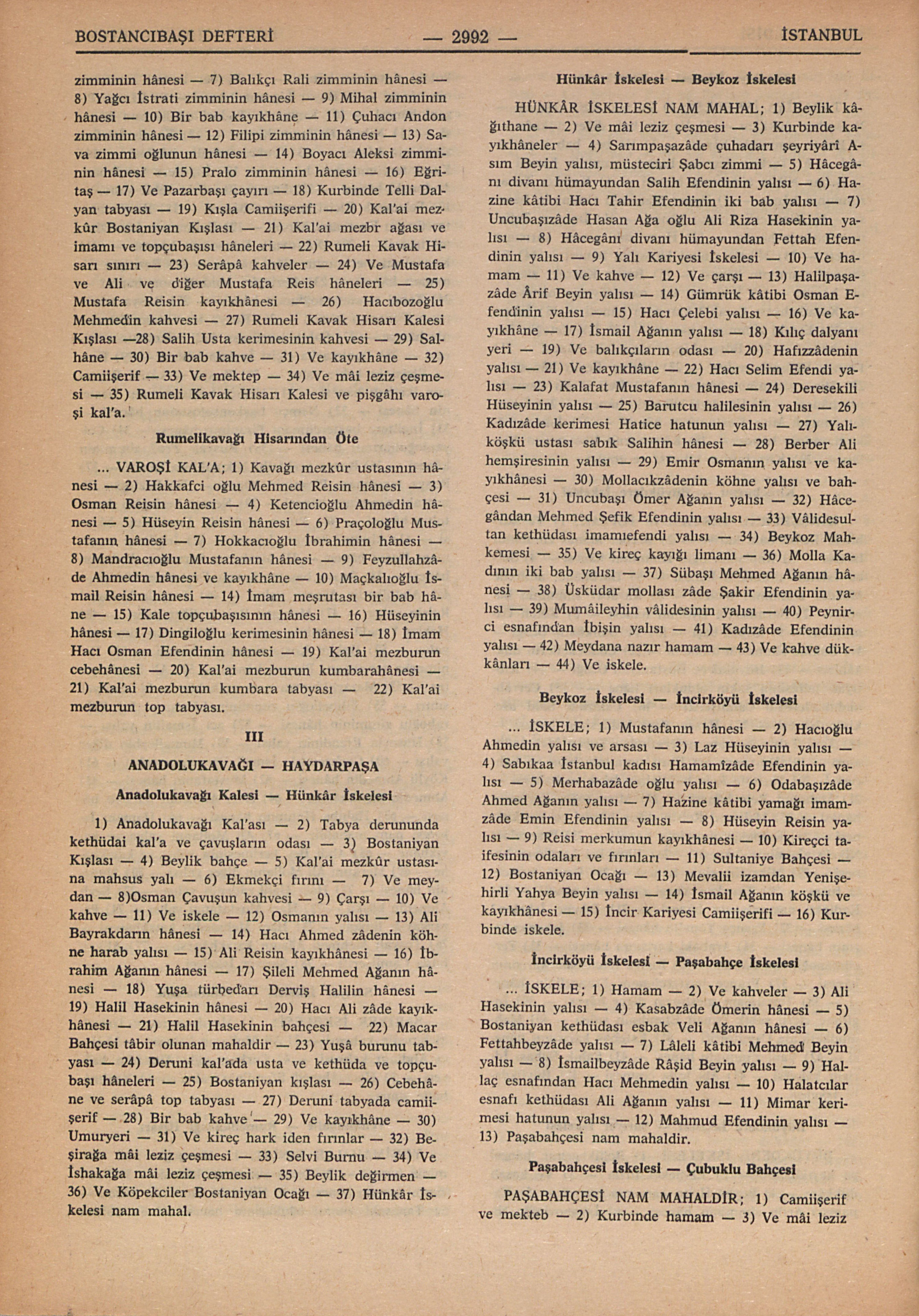 ... İSKELE; 1) Mustafanın hânesi – 2) Hacıoğlu Ahmedin yalısı ve arsası – 3) Laz Hüseyinin yalısı – 4) Sabıkaa İstanbul kadısı Hamamîzâde Efendinin yalısı – 5) Merhabazâde oğlu yalısı – 6) Odabaşızâde Ahmed Ağanın yalısı – 7) Hazine kâtibi yamağı imamzâde Emin Efendinin yalısı – 8) Hüseyin Reisin yalısı – 9) Reisi merkumun kayıkhânesi – 10) Kireçci taifesinin odaları ve fırınları – 11) Sultaniye Bahçesi – 12) Bostaniyan Ocağı – 13) Mevalii izamdan Yenişehirli Yahya Beyin yalısı – 14) İsmail Ağanın köşkü ve kayıkhânesi – 15) İncir Kariyesi Camiişerifi – 16) Kurbinde iskele.