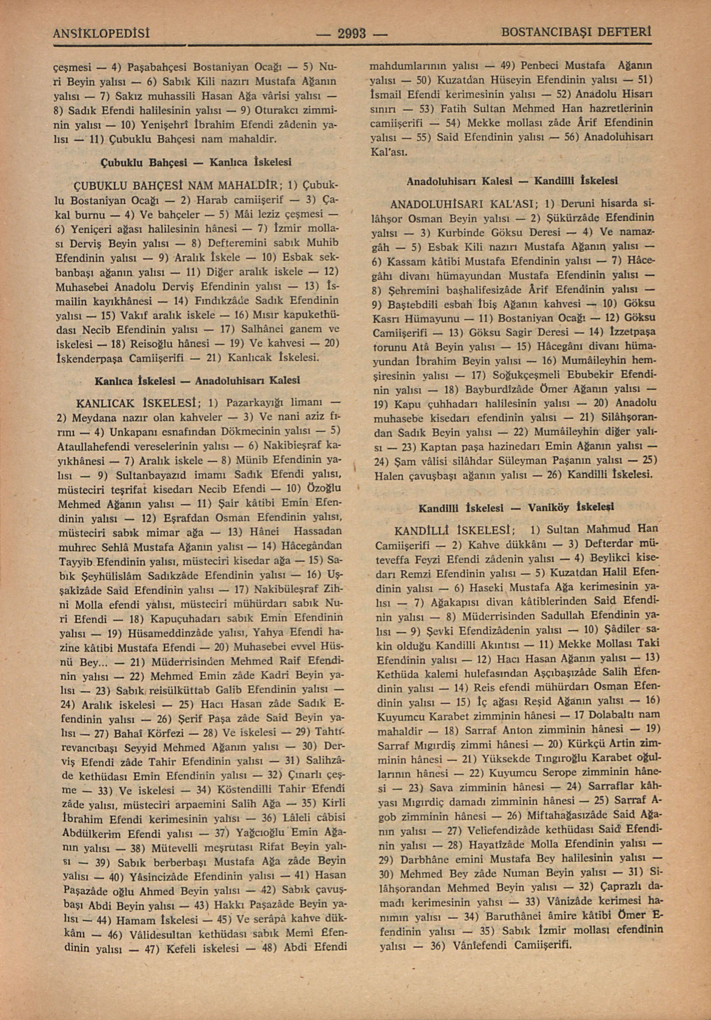 KANLICAK İSKELESİ; 1) Pazarkayığı limanı – 2) Meydana nazır olan kahveler – 3) Ve nani aziz fırını – 4) Unkapanı esnafından Dökmecinin yalısı – 5) Ataullahefendi vereselerinin yalısı – 6) Nakibieşraf kayıkhânesi – 7) Aralık iskele – 8) Münib Efendinin yalısı – 9) Sultanbayazıd imamı Sadık Efendi yalısı, müsteciri teşrifat kisedarı Necib Efendi – 10) Özoğlu Mehmed Ağanın yalısı – 11) Şair kâtibi Emin Efendinin yalısı – 12) Eşrafdan Osman Efendinin yalısı, müsteciri sabık mimar ağa – 13) Hânei Hassadan muhrec Sehlâ Mustafa Ağanın yalısı – 14) Hâcegândan Tayyib Efendinin yalısı, müsteciri kisedar ağa – 15) Sabık Şeyhülislâm Sadıkzâde Efendinin yalısı – 16) Uşşakîzâde Said Efendinin yalısı – 17) Nakibüleşraf Zihni Molla efendi yalısı, müsteciri mühürdarı sabık Nuri Efendi – 18) Kapuçuhadarı sabık Emin Efendinin yalısı – 19) Hüsameddinzâde yalısı, Yahya Efendi hazine kâtibi Mustafa Efendi – 20) Muhasebei evvel Hüsnü Bey... – 21) Müderrisinden Mehmed Raif Efendinin yalısı – 22) Mehmed Emin zâde Kadri Beyin yalısı – 23) Sabık reisülküttab Galib Efendinin yalısı – 24) Aralık iskelesi – 25) Hacı Hasan zâde Sadık Efendinin yalısı – 26) Şerif Paşa zâde Said Beyin yalısı – 27) Bahaî Körfezi – 28) Ve iskelesi – 29) Tahtırevancıbaşı Seyyid Mehmed Ağanın yalısı – 30) Derviş Efendi zâde Tahir Efendinin yalısı – 31) Salihzâde kethüdası Emin Efendinin yalısı – 32) Çınarlı çeşme – 33) Ve iskelesi – 34) Köstendilli Tahir Efendi zâde yalısı, müsteciri arpaemini Salih Ağa – 35) Kirli İbrahim Efendi kerimesinin yalısı – 36) Lâleli câbisi Abdülkerim Efendi yalısı – 37) Yağcıoğlu Emin Ağanın yalısı – 38) Mütevelli meşrutası Rifat Beyin yalısı – 39) Sabık berberbaşı Mustafa Ağa zâde Beyin yalısı – 40) Yâsincizâde Efendinin yalısı – 41) Hasan Paşazâde oğlu Ahmed Beyin yalısı – 42) Sabık çavuşbaşı Abdi Beyin yalısı – 43) Hakkı Paşazâde Beyin yalısı – 44) Hamam İskelesi – 45) Ve serâpâ kahve dükkânı – 46) Vâlidesultan kethüdası sabık Memi Efendinin yalısı – 47) Kefeli iskelesi – 48) Abdi Efendi mahdumlarının yalısı – 49) Penbeci Mustafa Ağanın yalısı – 50) Kuzatdan Hüseyin Efendinin yalısı – 51) İsmail Efendi kerimesinin yalısı – 52) Anadolu Hisarı sınırı – 53) Fatih Sultan Mehmed Han hazretlerinin camiişerifi – 54) Mekke mollası zâde Ârif Efendinin yalısı – 55) Said Efendinin yalısı – 56) Anadoluhisarı Kal’ası.