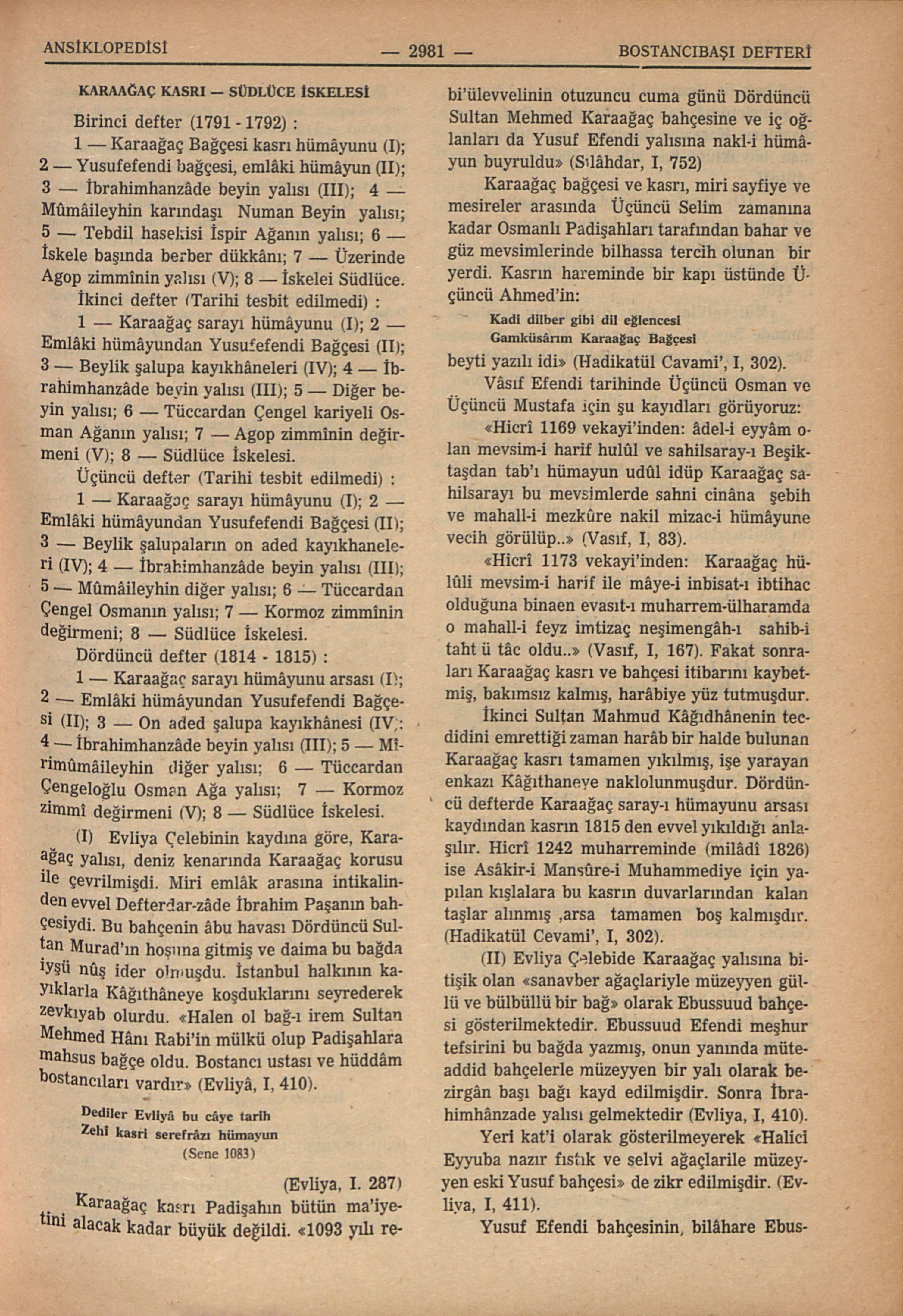(II) Evliya Çelebide Karaağaç yalısına bitişik olan “sanavber ağaçlariyle müzeyyen güllü ve bülbüllü bir bağ” olarak Ebussuud bahçesi gösterilmektedir. Ebussuud Efendi meşhur tefsirini bu bağda yazmış, onun yanında müteaddid bahçelerle müzeyyen bir yalı olarak bezirgân başı bağı kayd edilmişdir. Sonra İbrahimhânzade yalısı gelmektedir. (Evliya, I, 410).