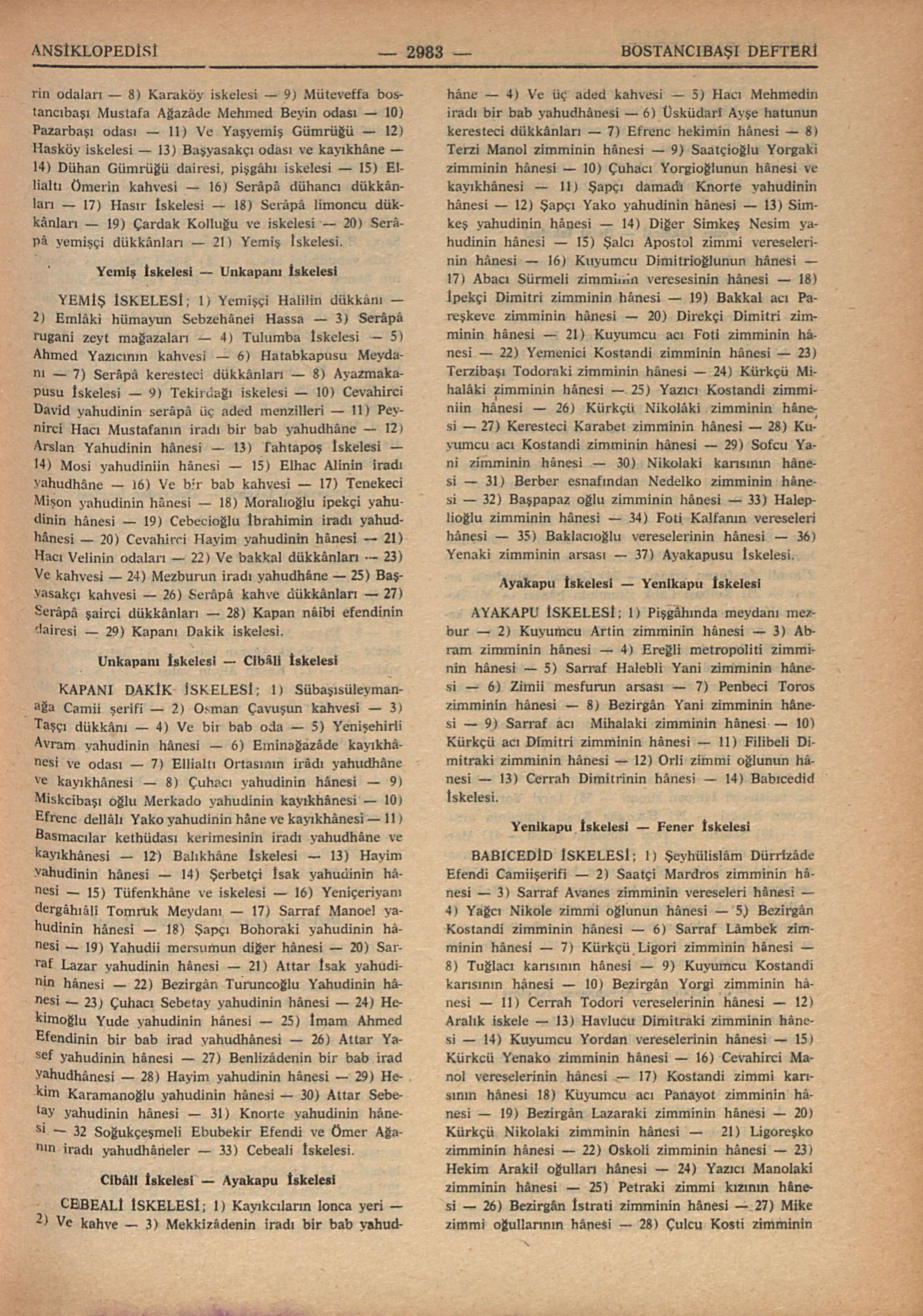 AYAKAPU İSKELESİ; 1) Pişgâhında meydanı mezbur – 2) Kuyumcu Artin zimminin hânesi – 3) Abram zimminin hânesi – 4) Ereğli metropoliti zimminin hânesi – 5) Sarraf Halebli Yani zimminin hânesi – 6) Zimii mesfurun arsası – 7) Penbeci Toros zimminin hânesi – 8) Bezirgân Yani zimminin hânesi – 9) Sarraf acı Mihalaki zimminin hânesi – 10) Kürkçü acı Dimitri zimminin hânesi – 11) Filibeli Dimitraki zimminin hânesi – 12) Orli zimmi oğlunun hânesi – 13) Cerrah Dimitrinin hânesi – 14) Babıcedid İskelesi.